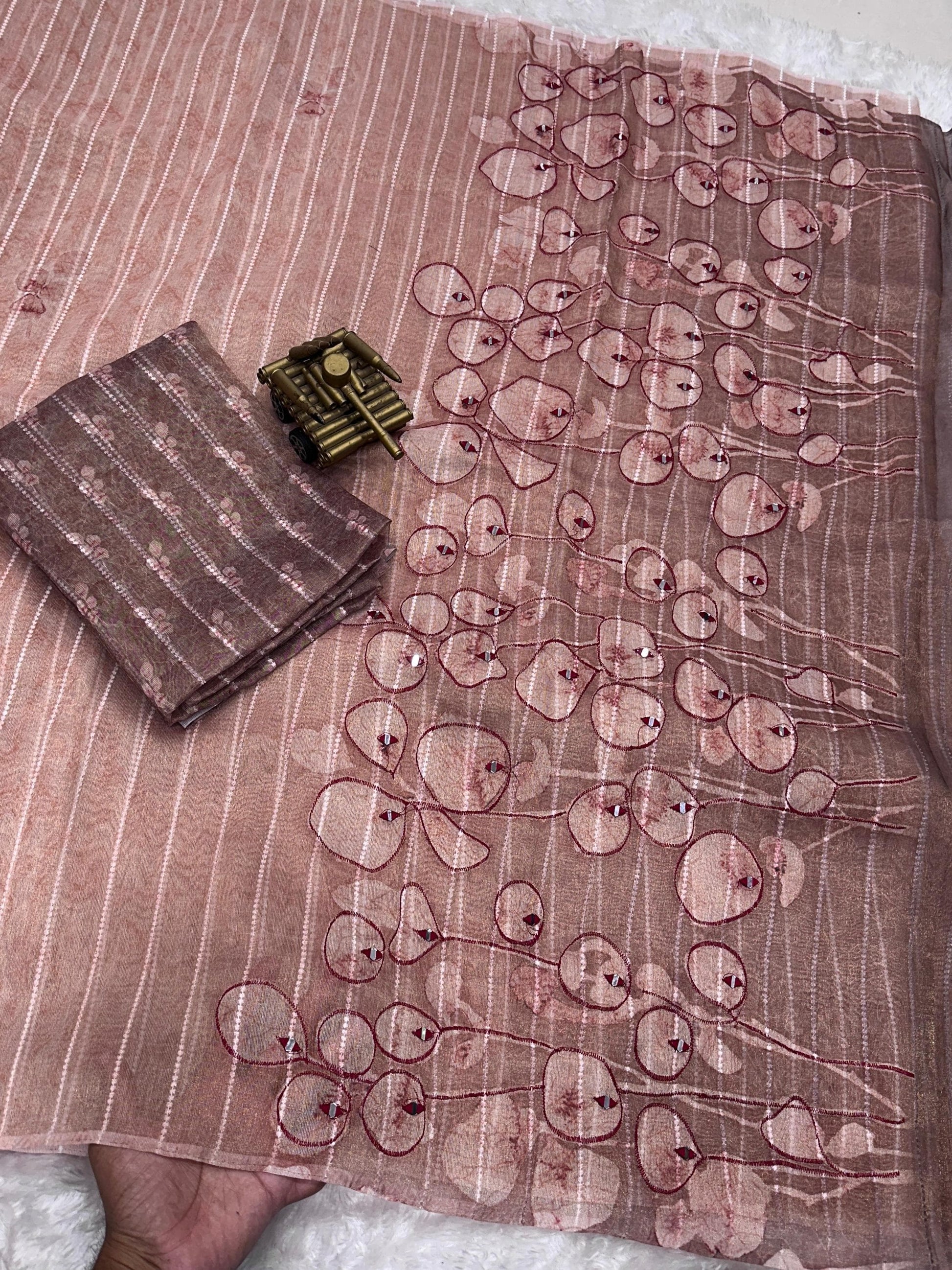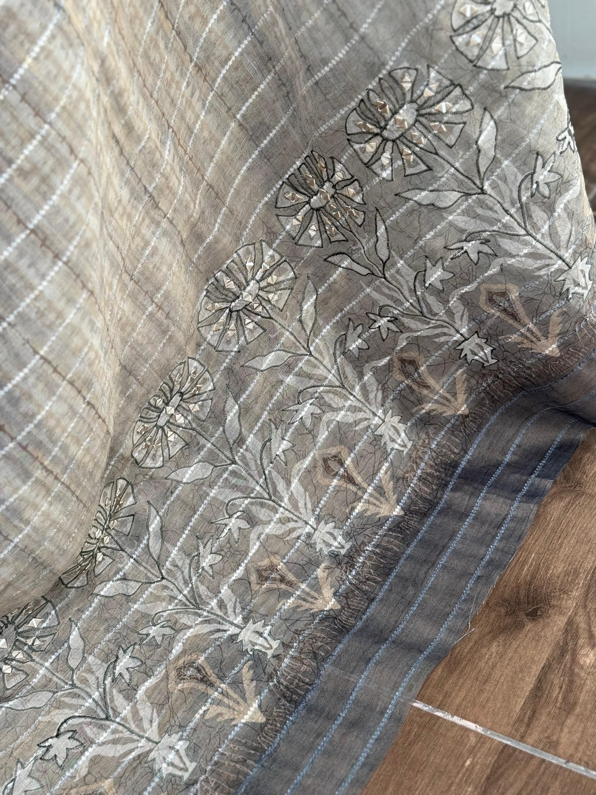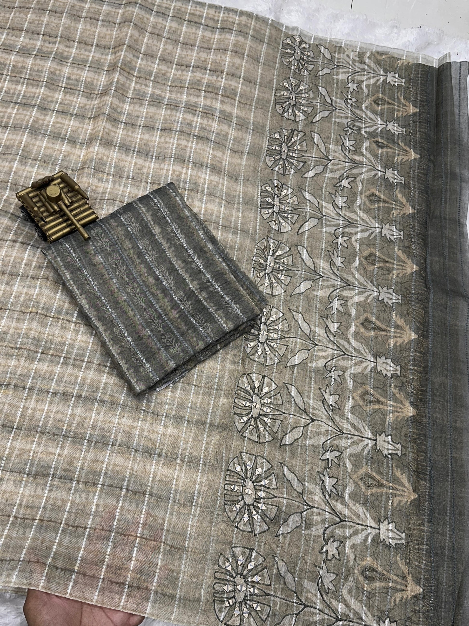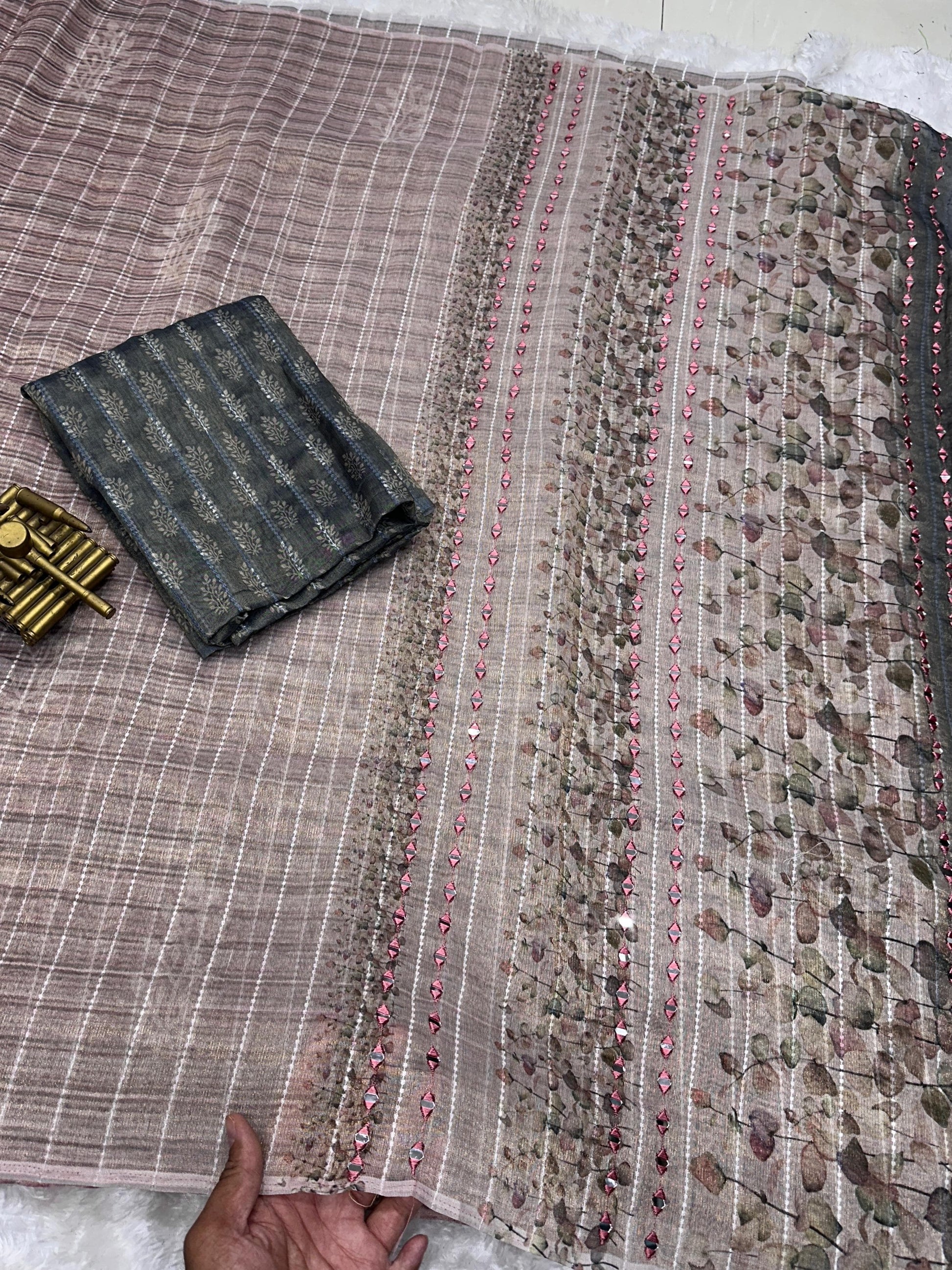 The highlight of this piece is its exquisite hand mirror Kali Mundi work on the pallu, lending a traditional yet artistic flair. Paired with a matching digital printed Taspa tissue silk blouse, this saree is ideal for festive and celebratory occasions.