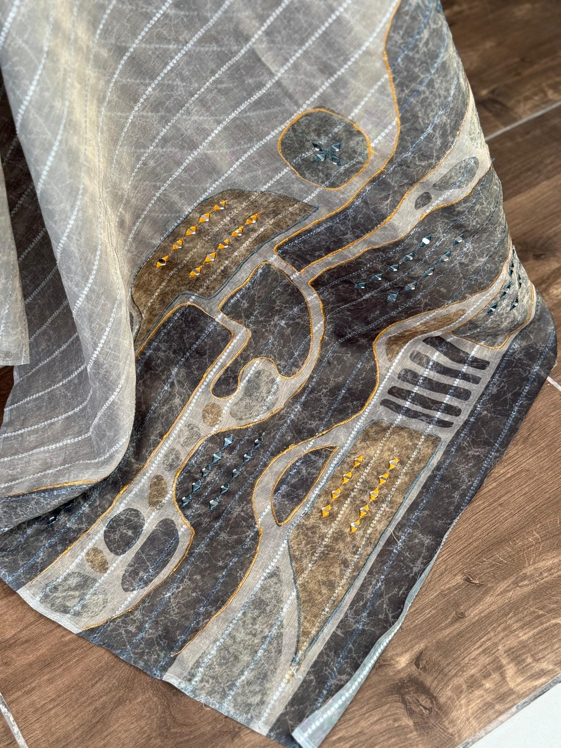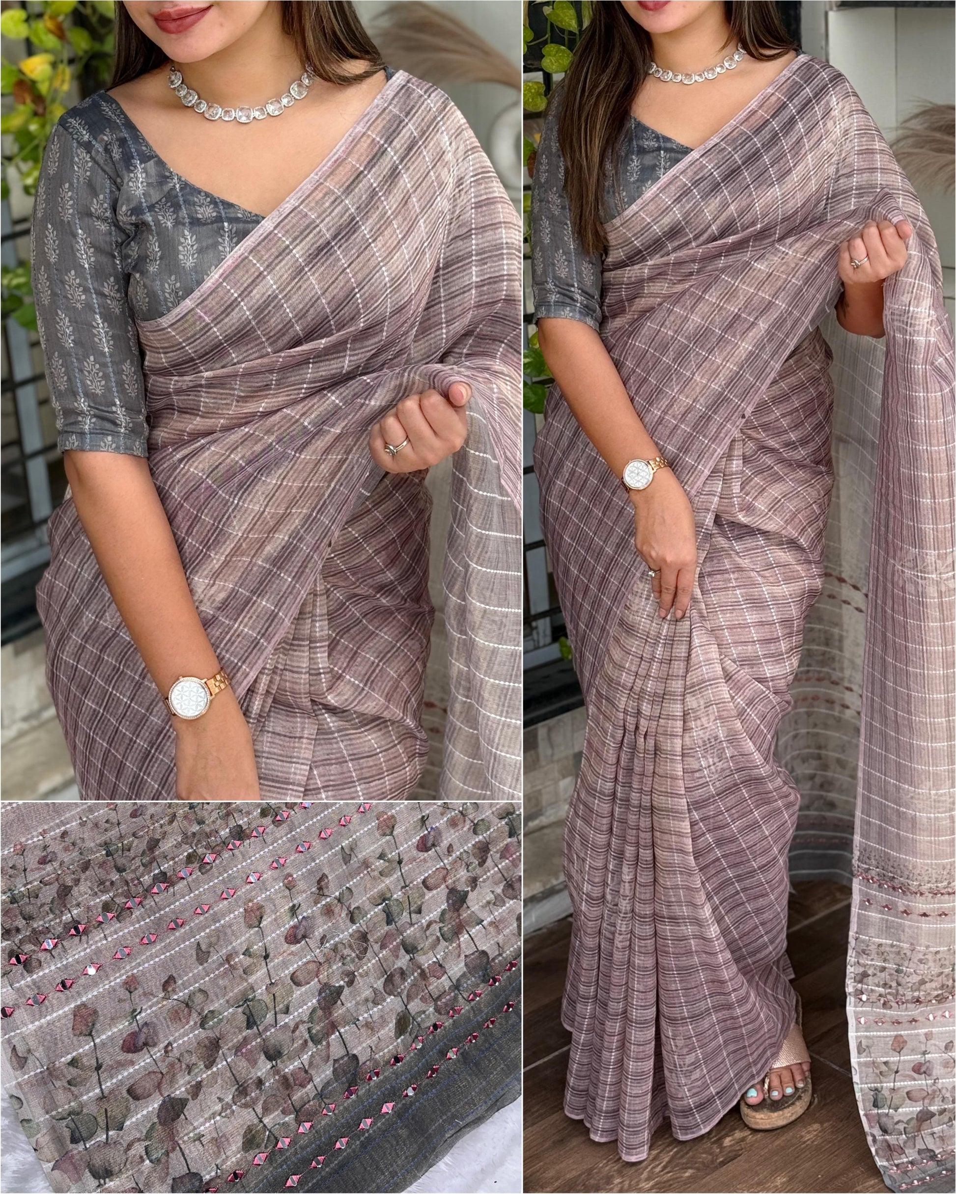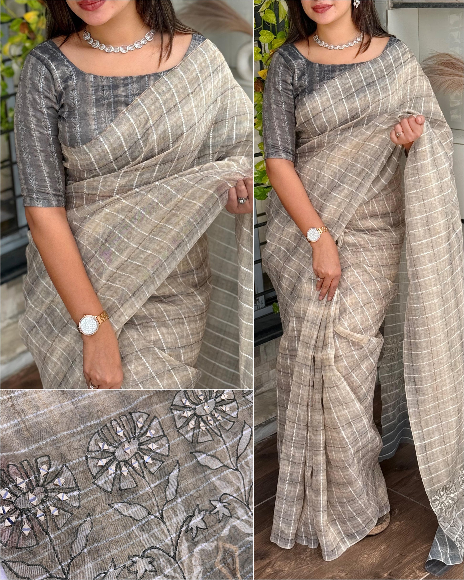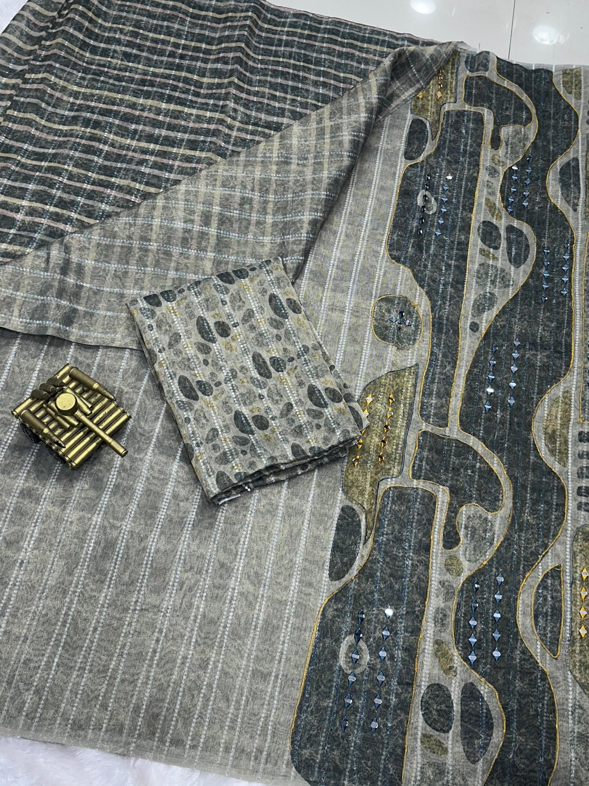 The highlight of this piece is its exquisite hand mirror Kali Mundi work on the pallu, lending a traditional yet artistic flair. Paired with a matching digital printed Taspa tissue silk blouse, this saree is ideal for festive and celebratory occasions.