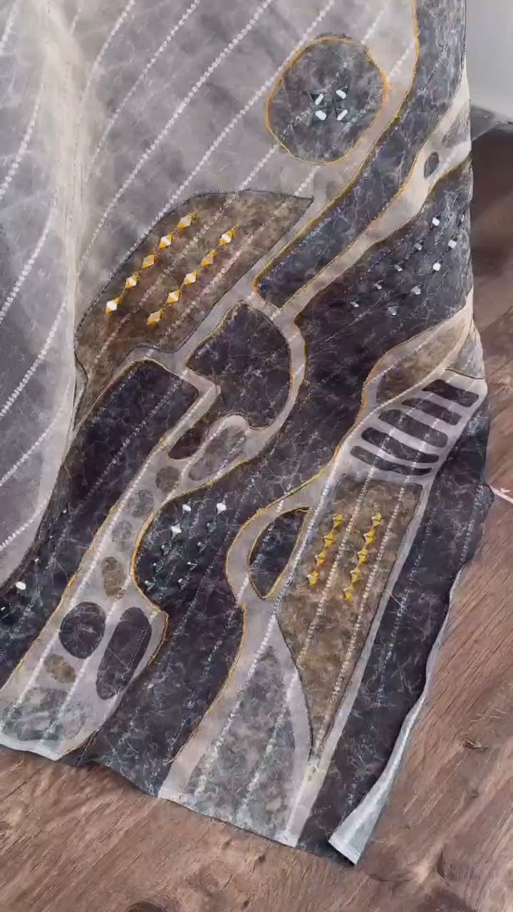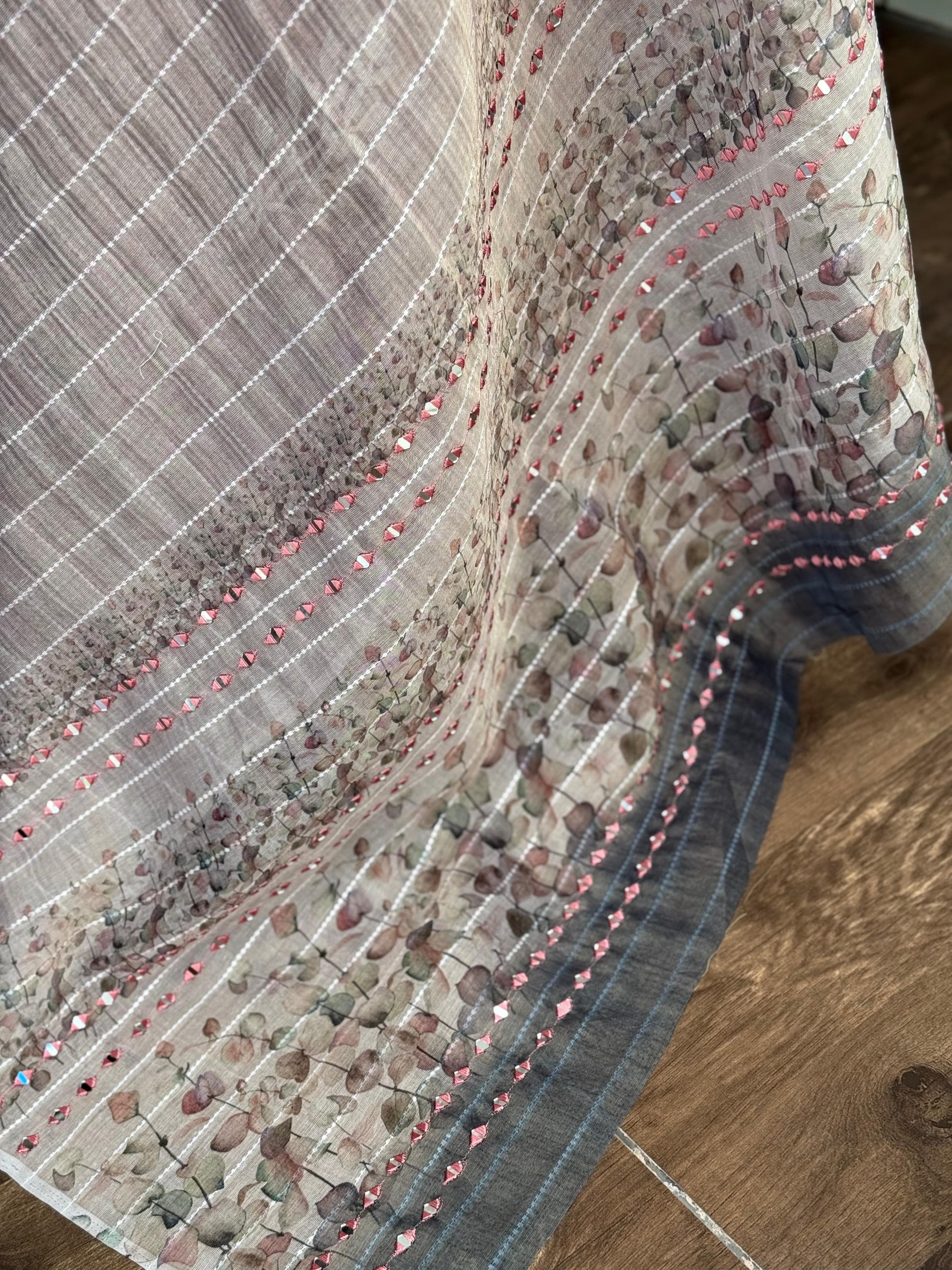 Aarohi Taspa Tissue Silk Saree with Digital Print, Hand Mirror Kali Mundi Work & Jacquard Thread Lining | 5.5m + 1m Blouse