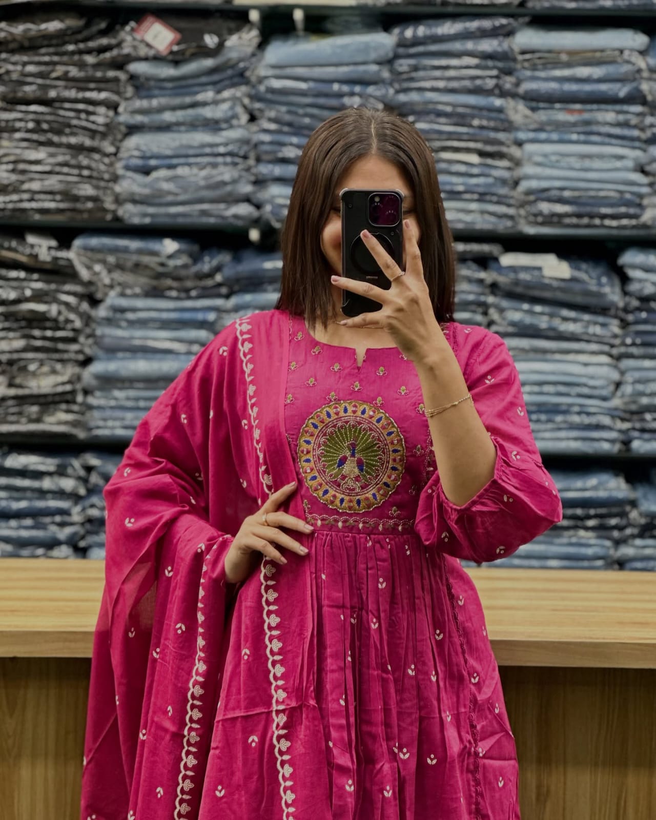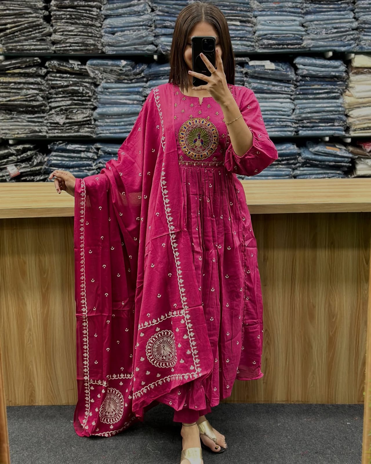 Crafted from soft Mal Cotton, the kurti offers a breathable fit and a premium showroom-quality finish. The look is completed with matching straight pants and a coordinated dupatta, making it a complete ethnic ensemble for modern women.