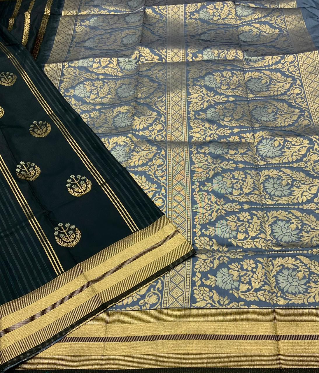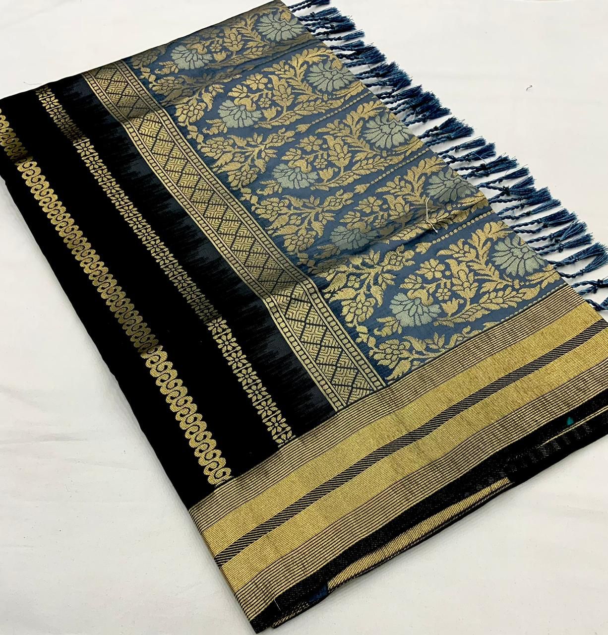 AK Suhani Grey-Black Edition β Soft Silk Saree with Zari Striped Weave & Rich Grey Pallu