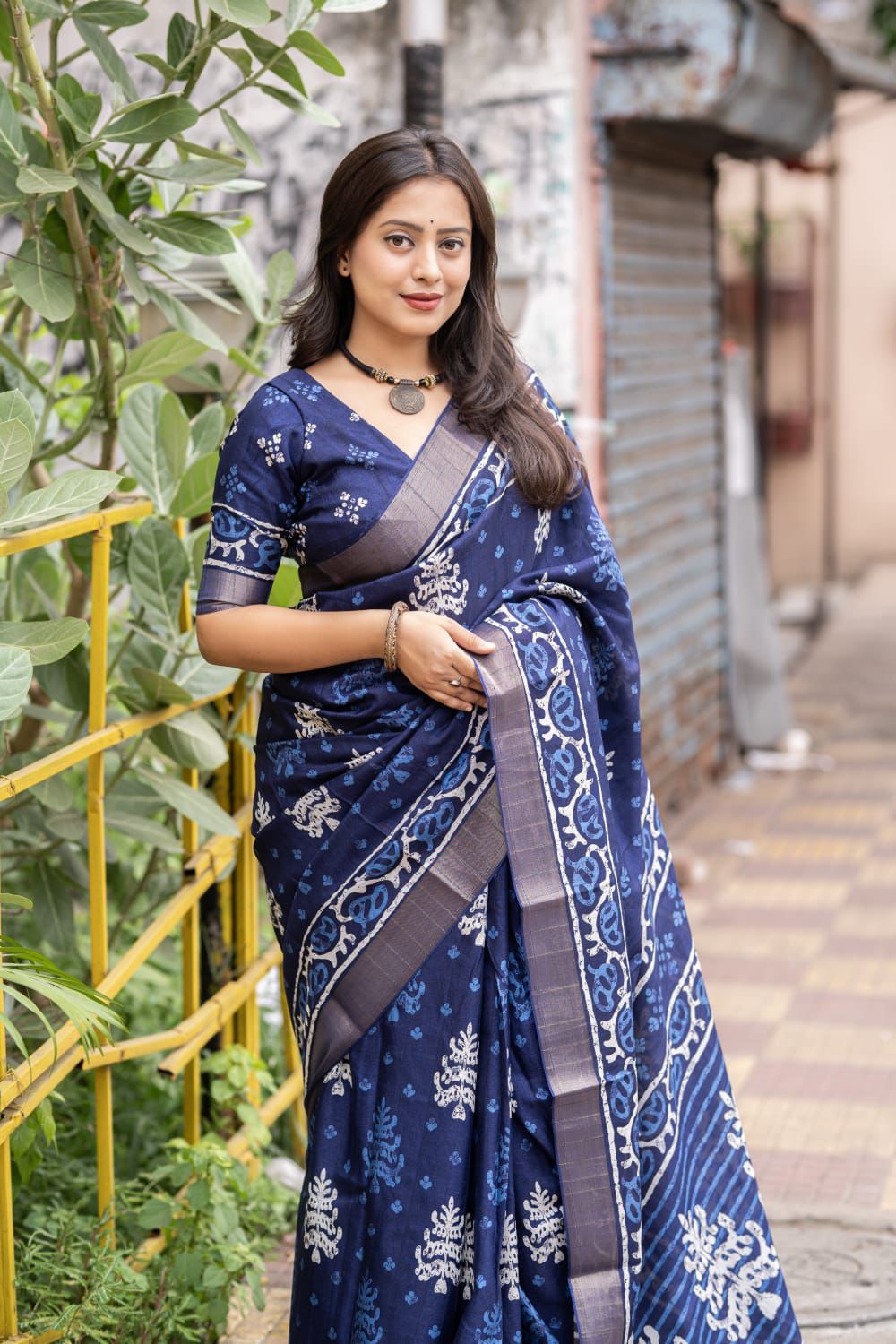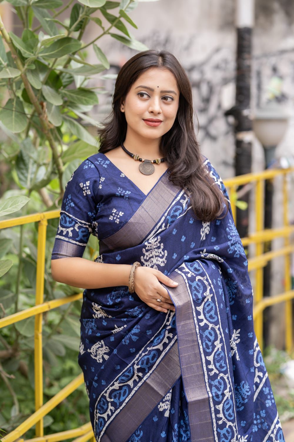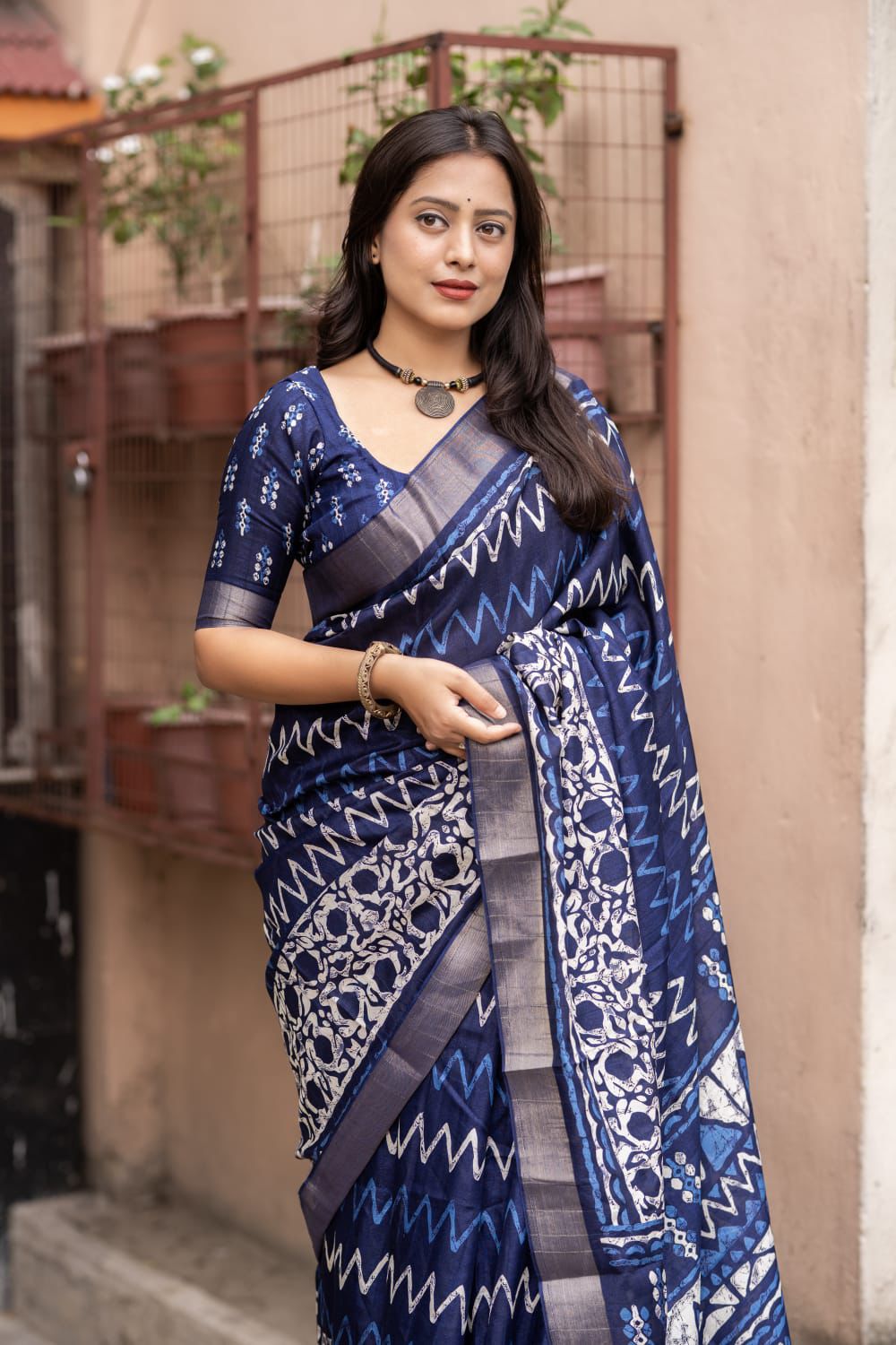 Soft Silk Slub Saree with Batik Print Design | Ethnic Printed Saree with Matching Blouse β 6.3 Meters