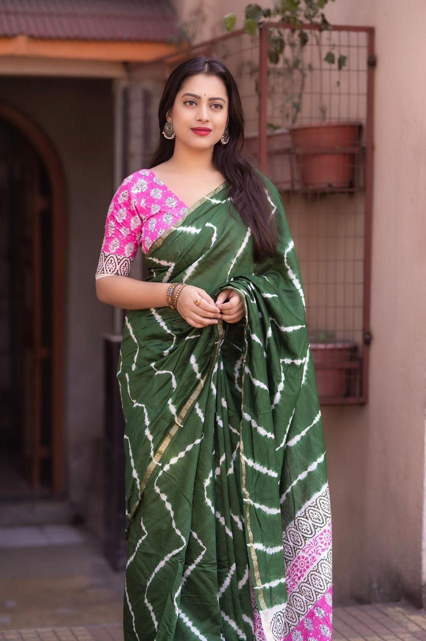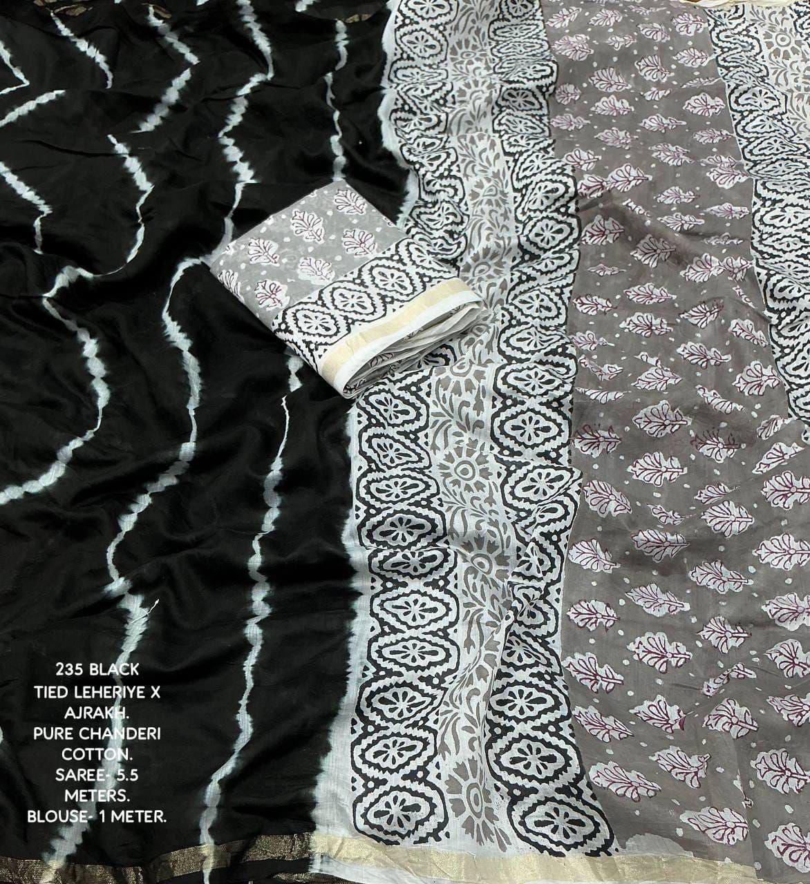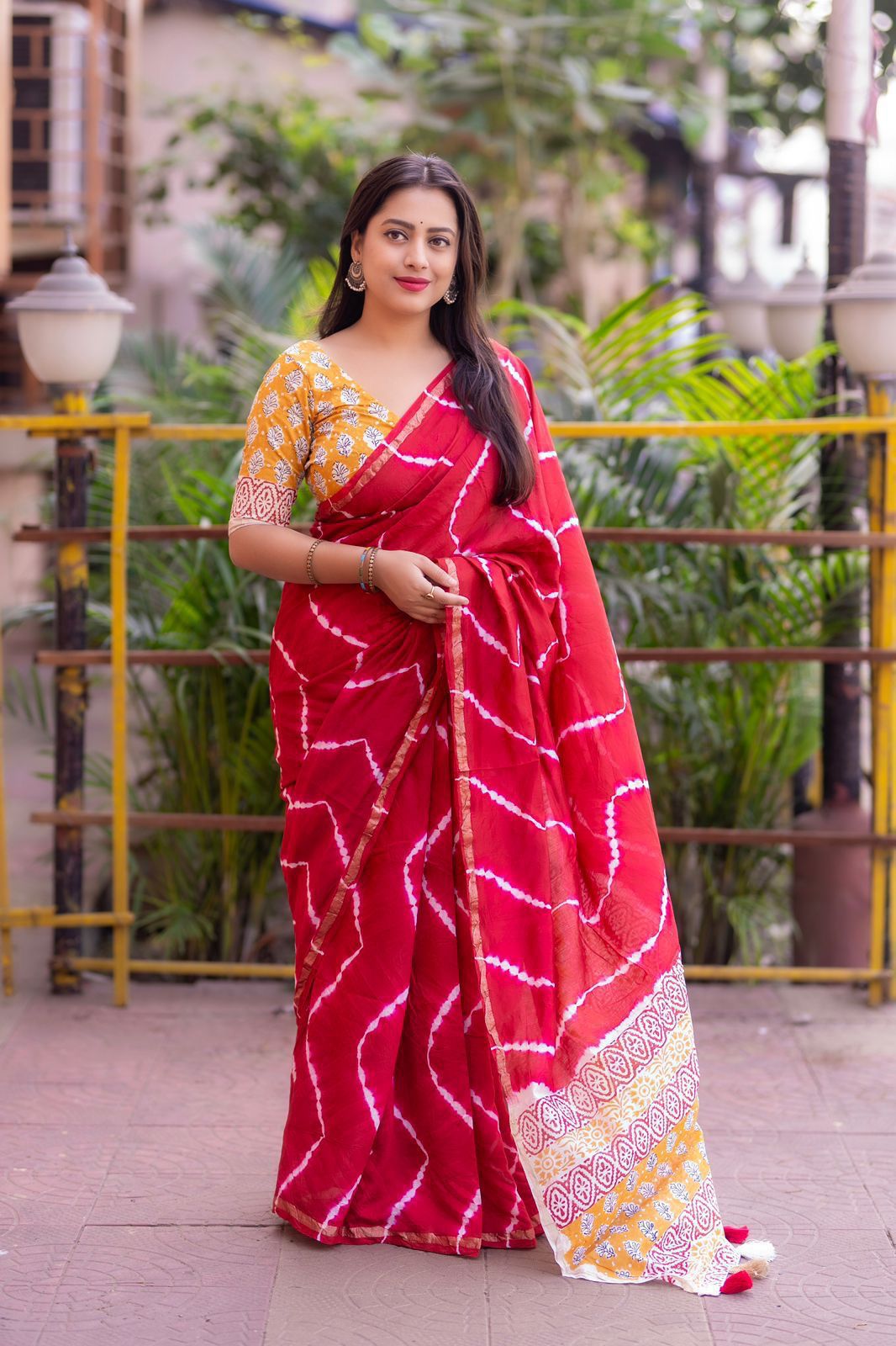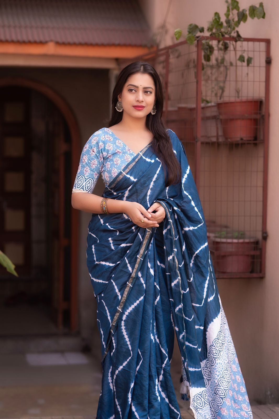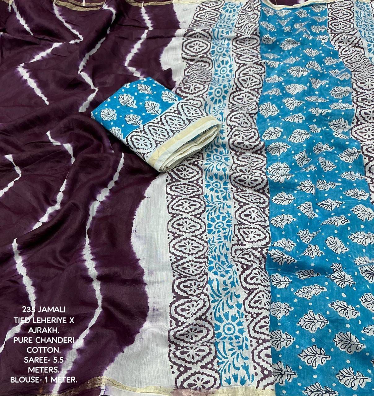 Soft Pure Chanderi Cotton Leheriya Tie-Dye Saree with Ajrakh Pallu & Cotton Tassels – 5.5 Meters