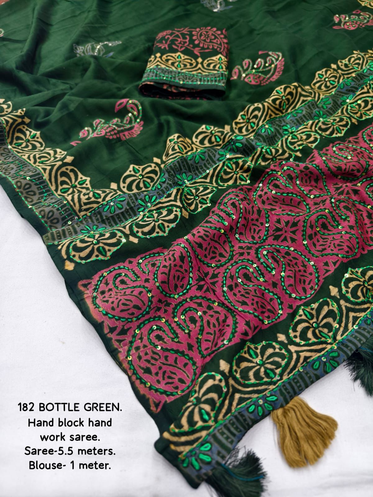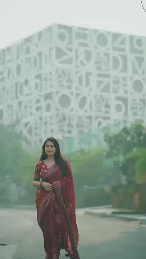 Discover timeless artistry in the AK-252 Magic Kaatha Saree, a masterpiece crafted from pure Chanderi cotton. This elegant saree features intricate Ajrakh block prints, highlighted with meticulous hand kaatha embroidery on the print outlines — a perfect fusion of tradition and craftsmanship.