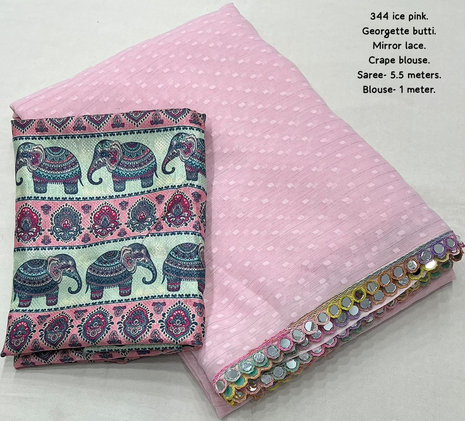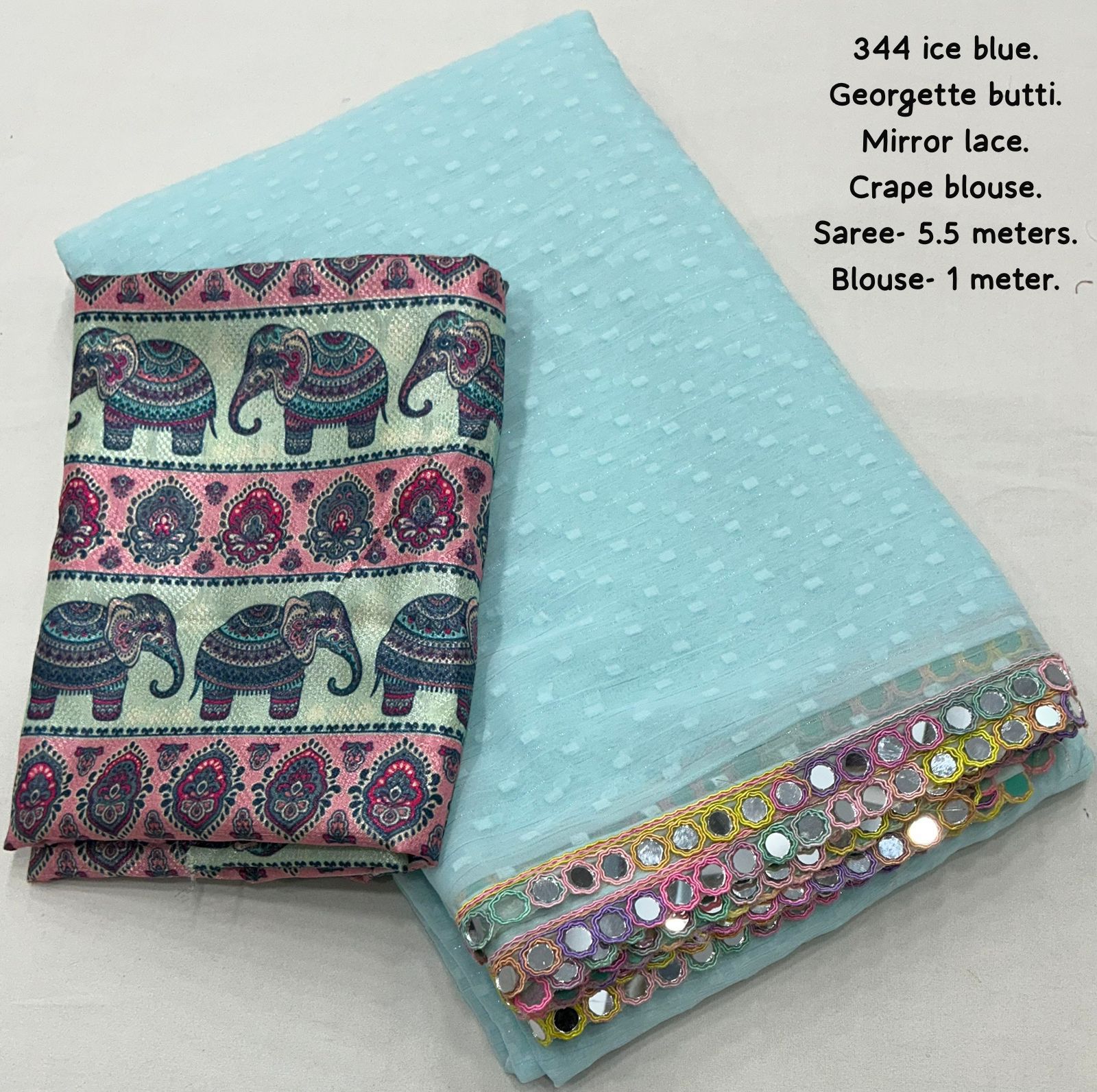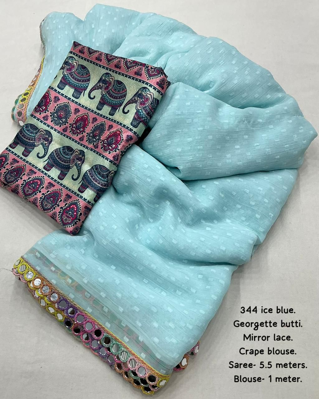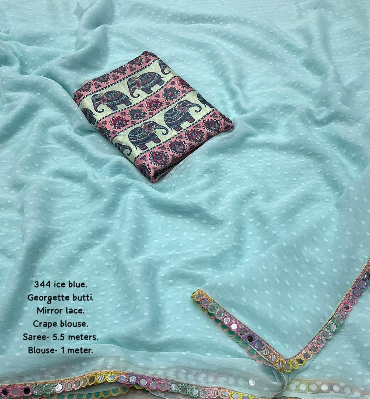 AK-344 Ice Cream – Soft Georgette Saree with Woven Butti, Real Mirror Lace & Crepe Silk Digital Print Blouse
