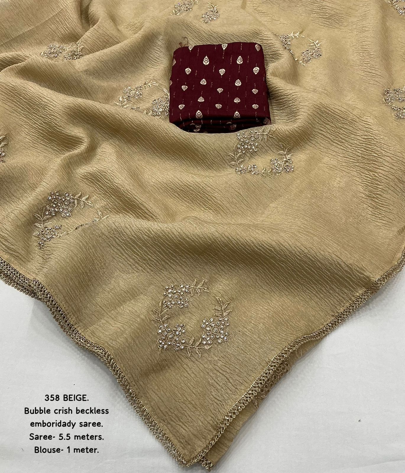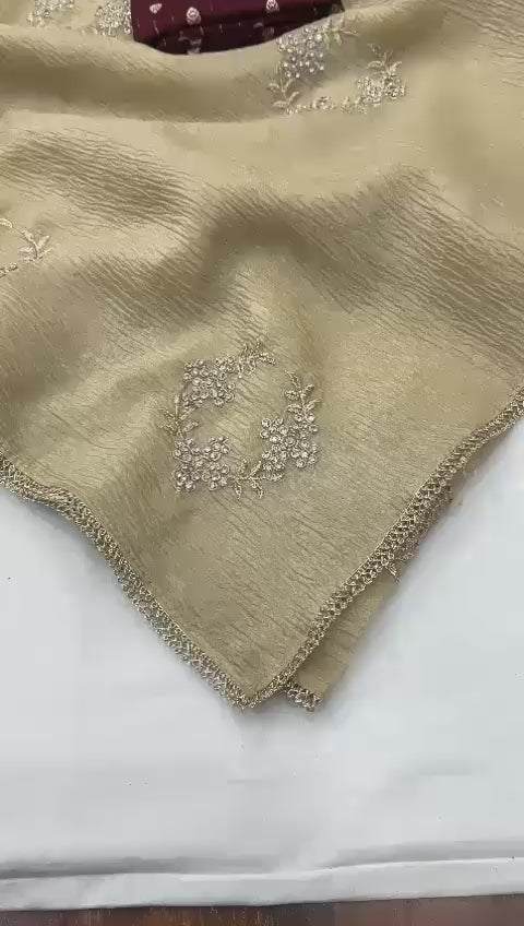 Elevate your ethnic style with this stunning Beige Bubble Crush Saree, featuring a zari necklace-style embroidered motif enhanced with delicate stone work, creating a regal centerpiece on the drape. The soft crushed texture gives a contemporary feel while retaining traditional elegance.