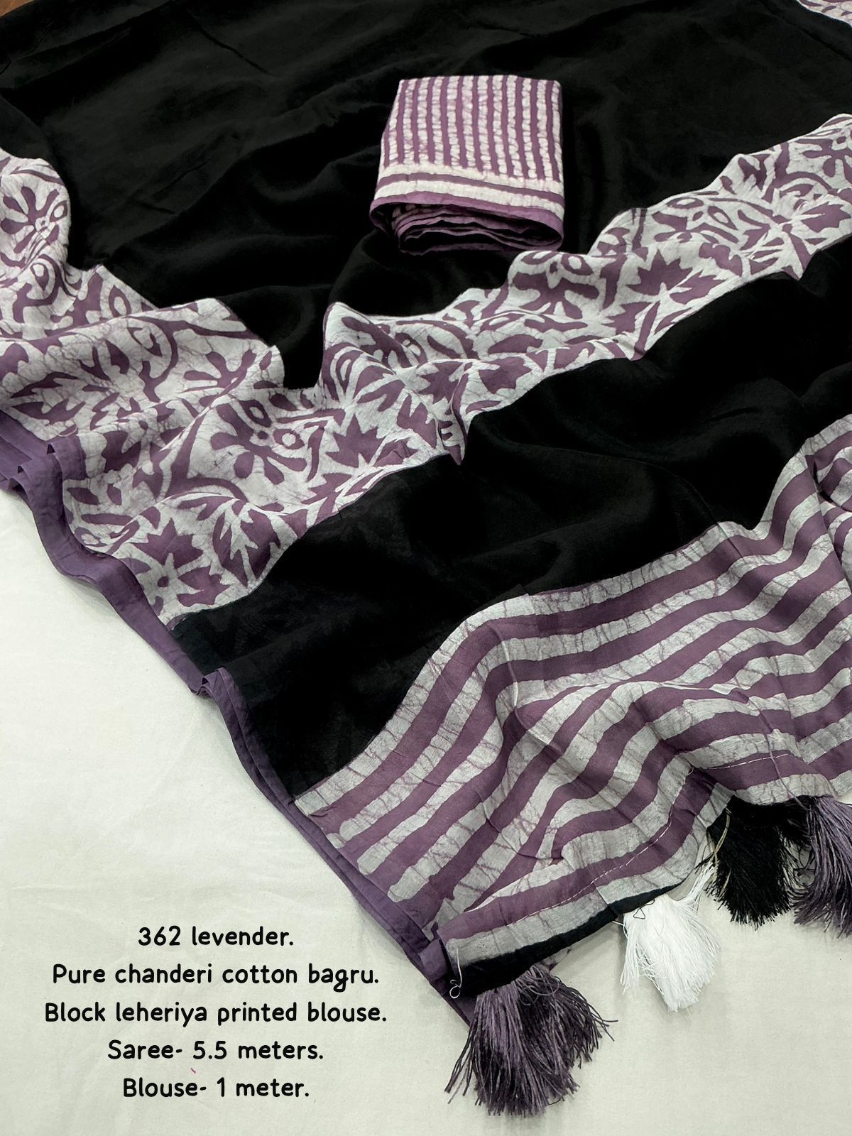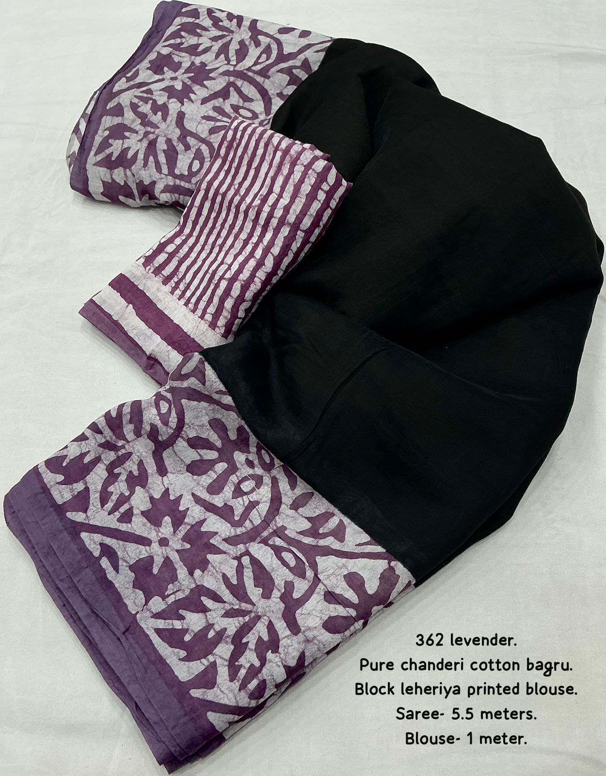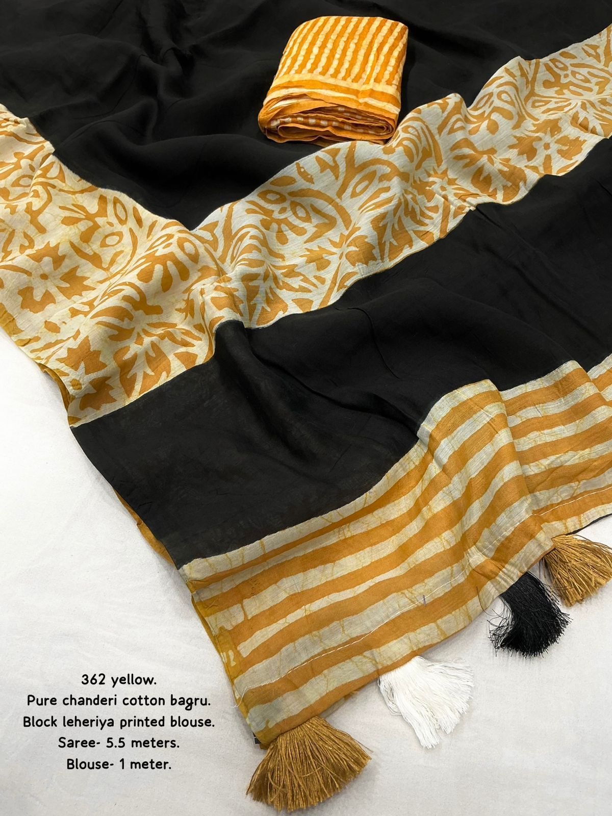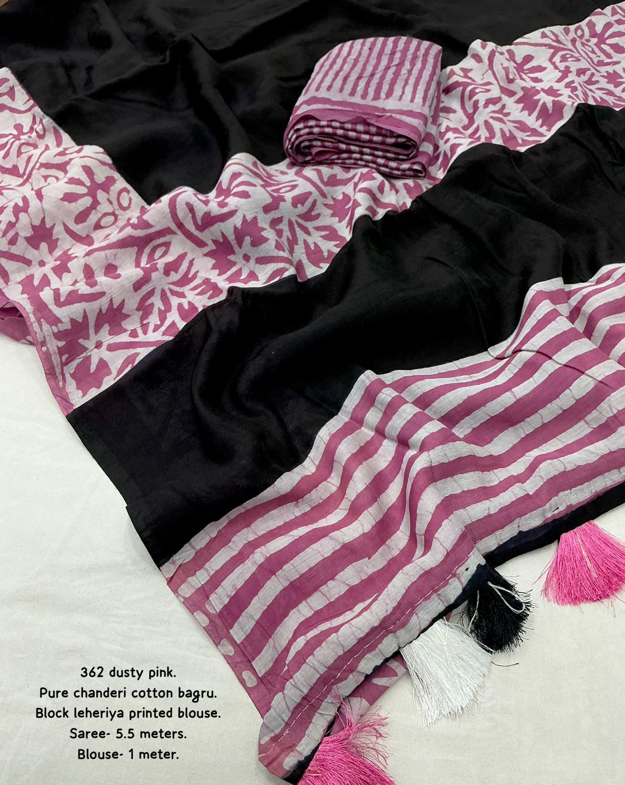Add timeless elegance to your ethnic wardrobe with this Bagru Black Saree featuring classic leheriya block prints. Crafted with care, the saree showcases a graceful zari pattu woven border and soft cotton tassels on the pallu, making it a perfect blend of traditional artistry and everyday comfort.