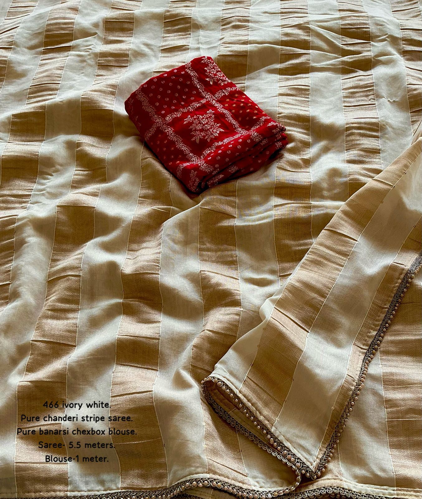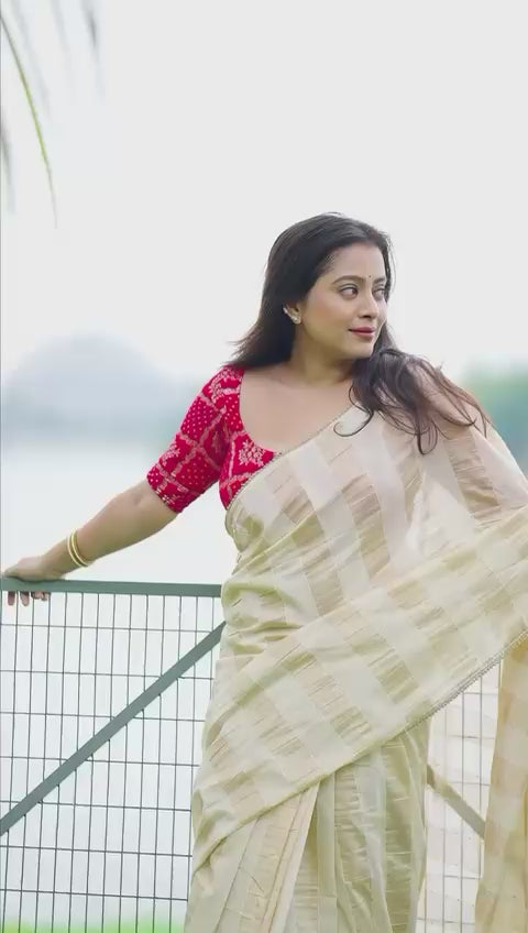 Pure Viscose Chanderi Saree with Vertical Zari Sequin Stripes, Moti Lace & Red Chexbox Zari Blouse