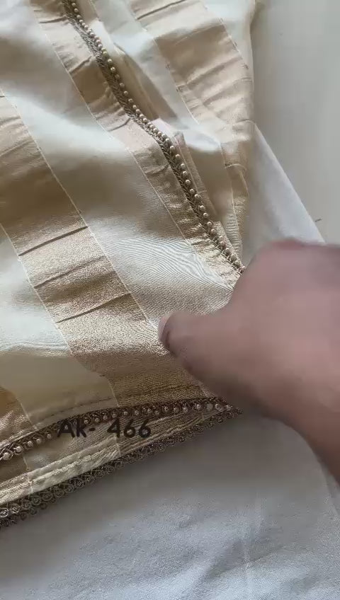 Add timeless elegance to your ethnic collection with this Pure Viscose Chanderi Saree, beautifully adorned with vertical gold zari sequin stripes that bring subtle shimmer and sophistication. The saree is enhanced with hand-style moti lace, lending a delicate handcrafted touch to your festive ensemble.