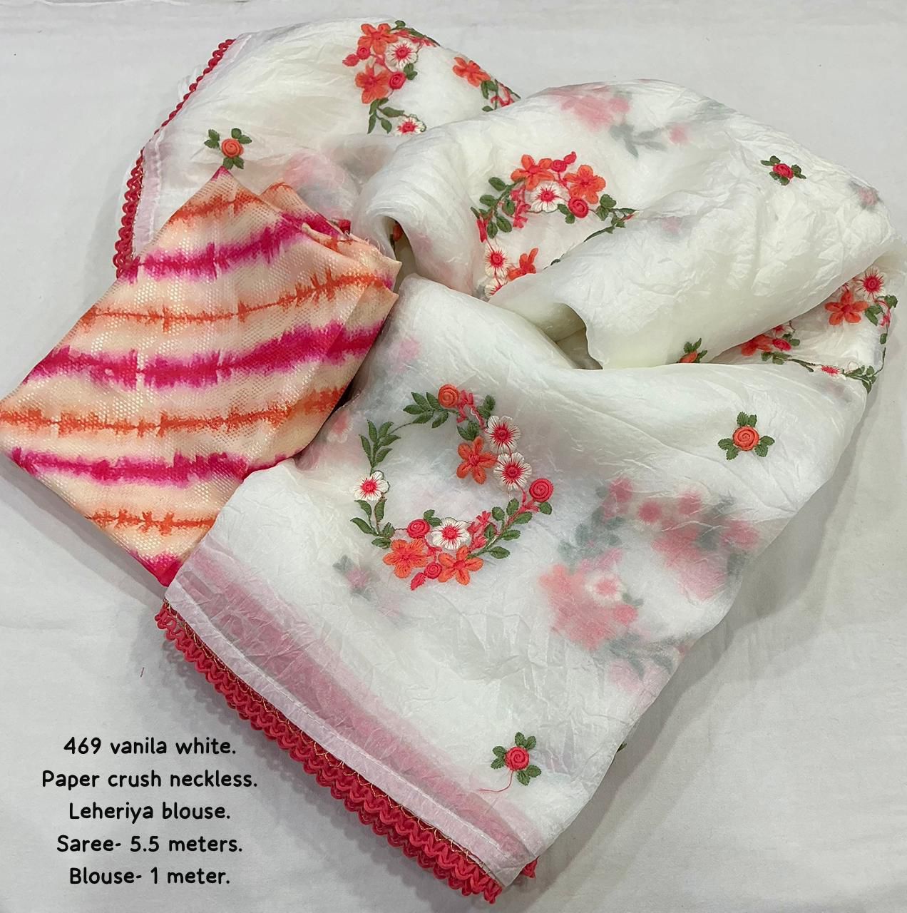 Soft Paper Crush Saree with Floral Necklace Embroidery & Leheriya Crepe Painted Blouse – Ak 469 Designer Collection