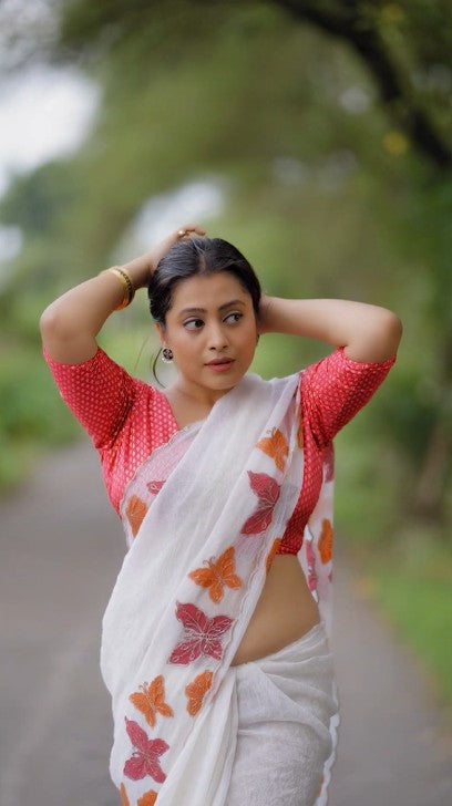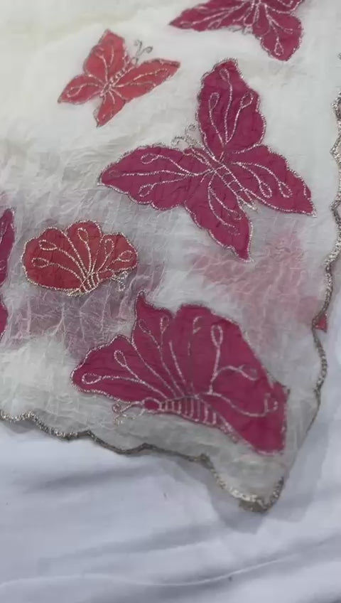 Make a graceful statement with our AK-481 Butterfly Crush Saree, crafted from soft ivory white crush chiffon for a breezy and elegant drape. This saree features zari embroidered butterfly motifs, each highlighted with color-painted detailing for a vibrant, artistic touch.