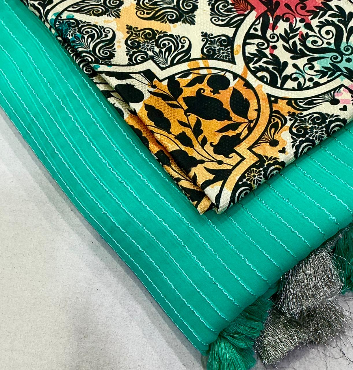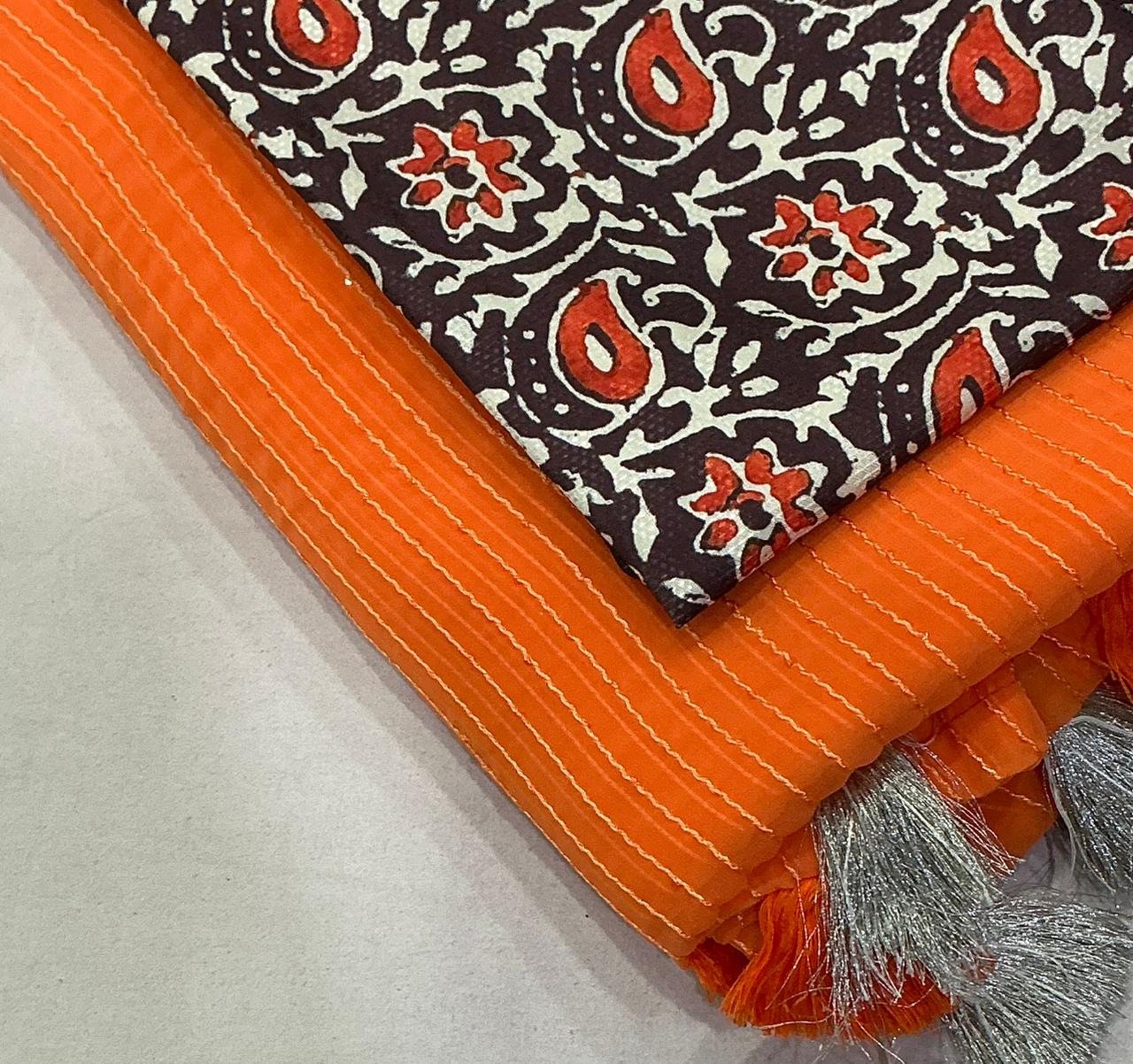 This saree comes paired with a perfectly matched printed jute silk blouse, completing the look with a balance of texture and sophistication. Ideal for festive occasions, casual get-togethers, or cultural events.
