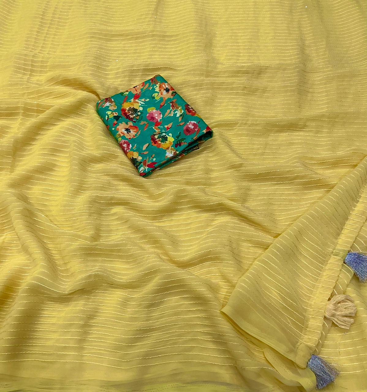 Elevate your ethnic wardrobe with the elegant AK-516 Janki Georgette Saree, crafted from premium soft georgette fabric. The saree features delicate thread embroidery all over, exuding understated charm and grace. The cotton tassels on the pallu add a traditional touch and fluid movement.