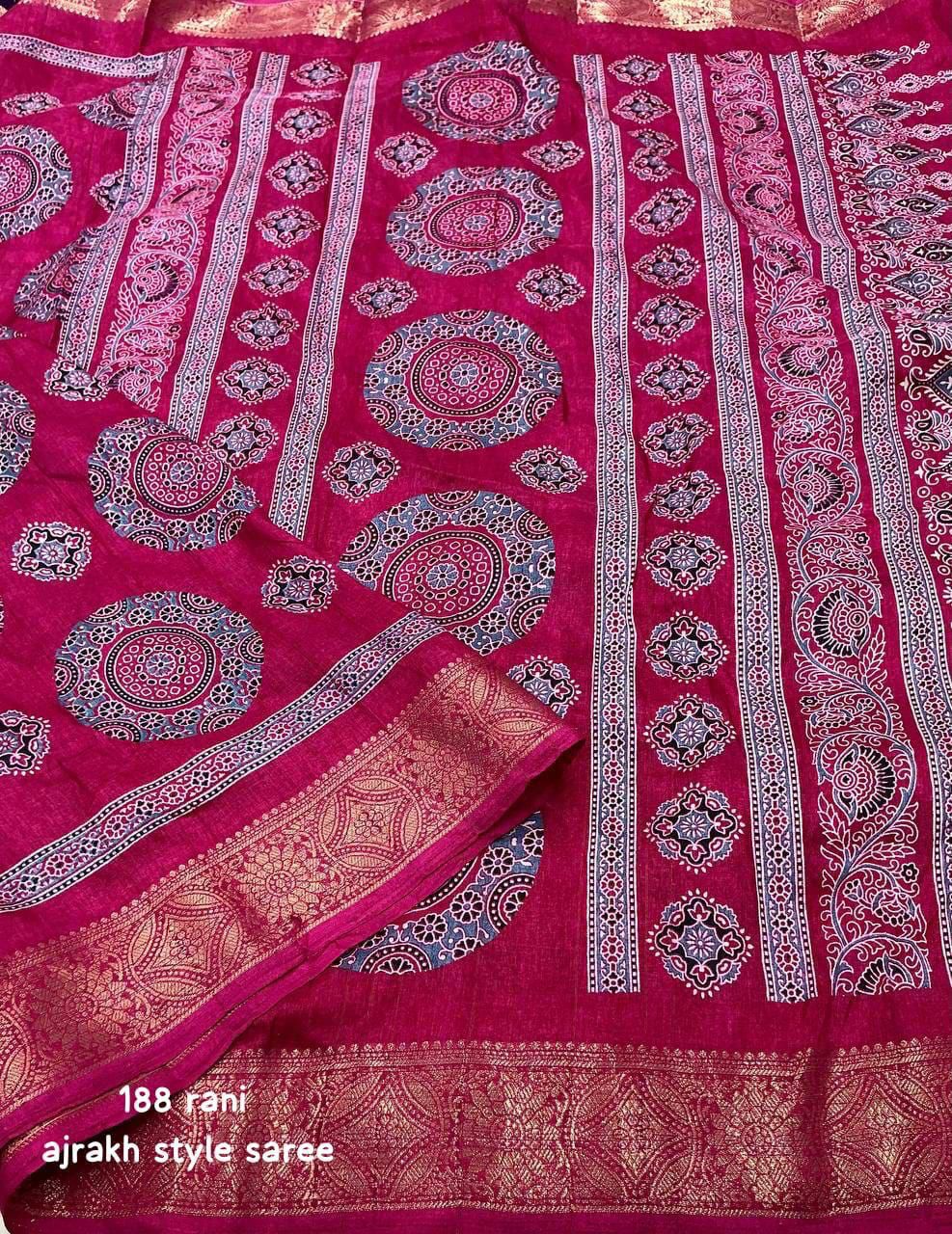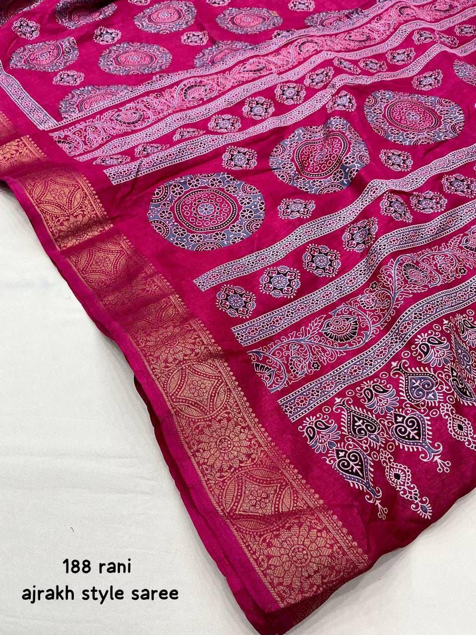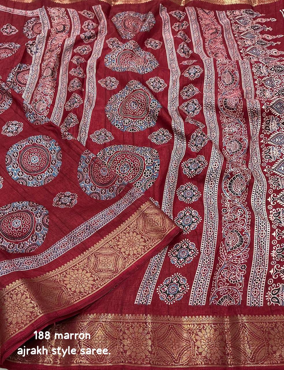 Elevate your ethnic wardrobe with the AK Handloom Ajrakh Saree, a graceful blend of tradition and elegance. Crafted from soft slub silk fabric, this saree features timeless Ajrakh-style block prints, bringing centuries-old craft to modern fashion. The look is enhanced with a shimmering zari woven pattu border, adding a touch of festive richness.