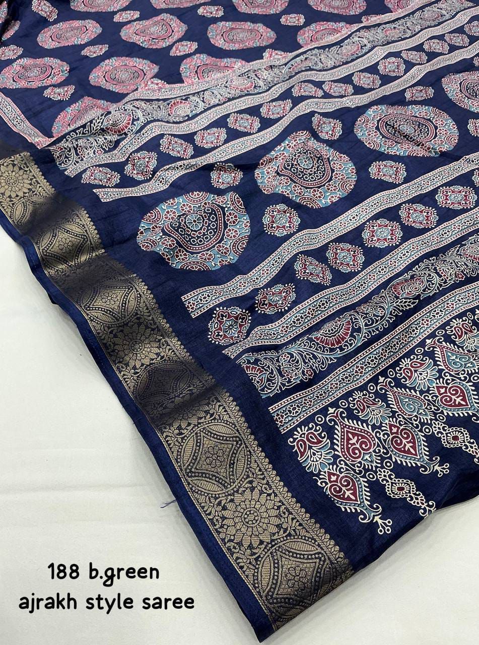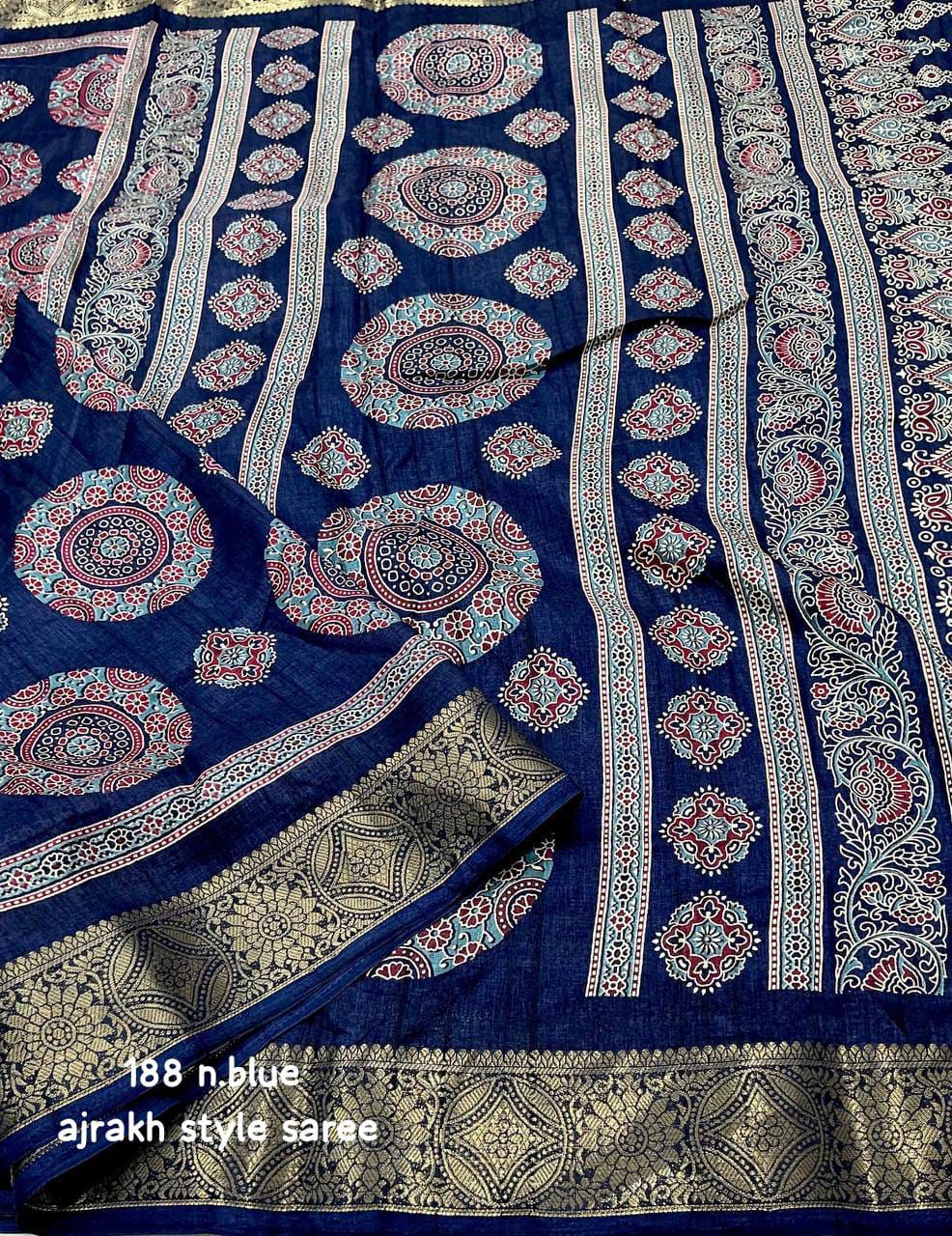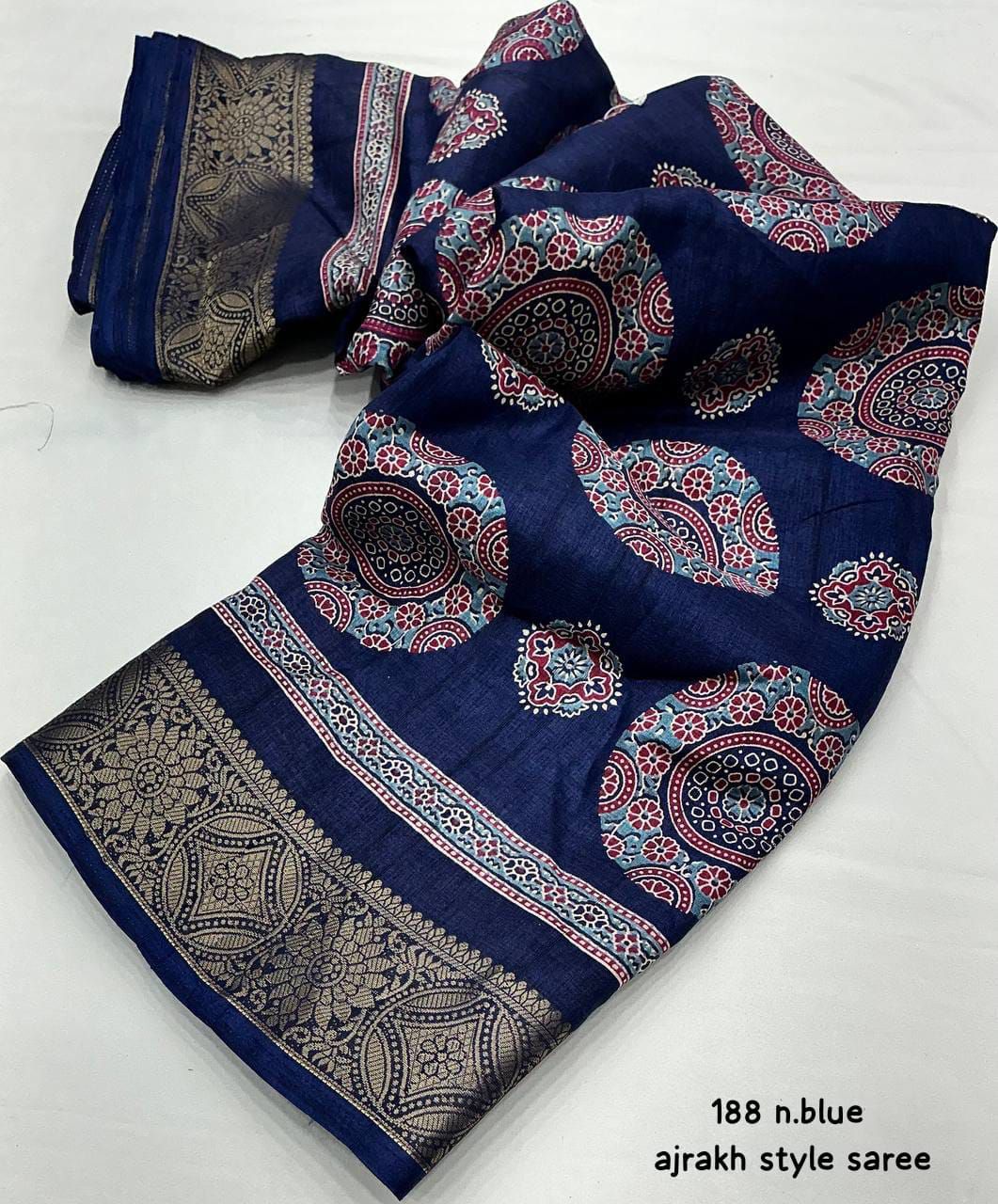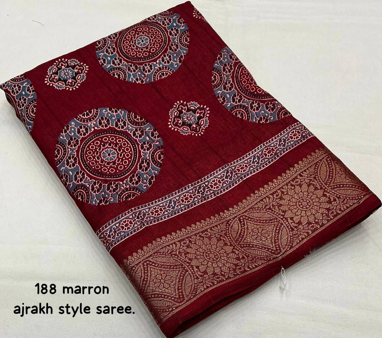 Elevate your ethnic wardrobe with the AK Handloom Ajrakh Saree, a graceful blend of tradition and elegance. Crafted from soft slub silk fabric, this saree features timeless Ajrakh-style block prints, bringing centuries-old craft to modern fashion. The look is enhanced with a shimmering zari woven pattu border, adding a touch of festive richness.