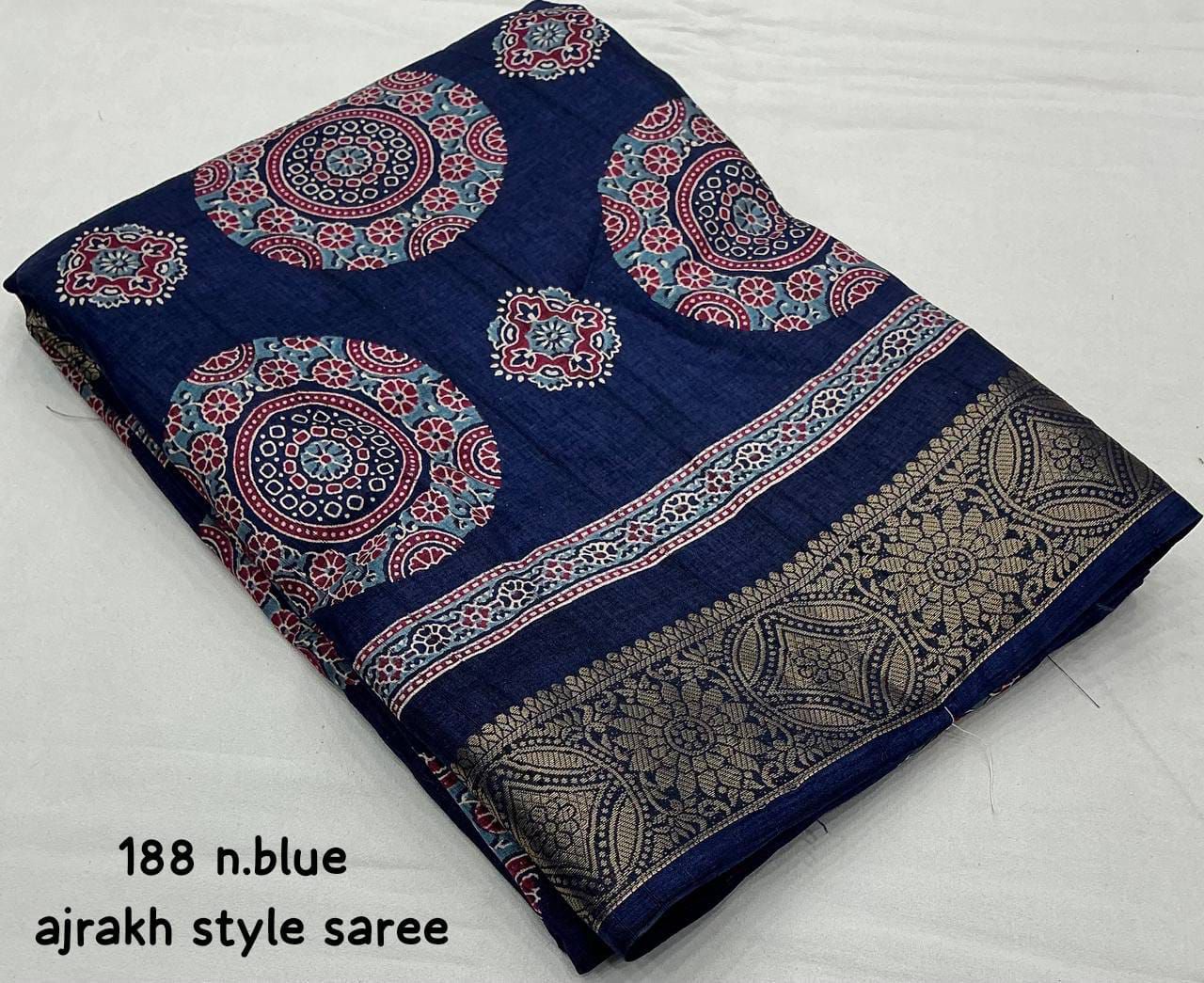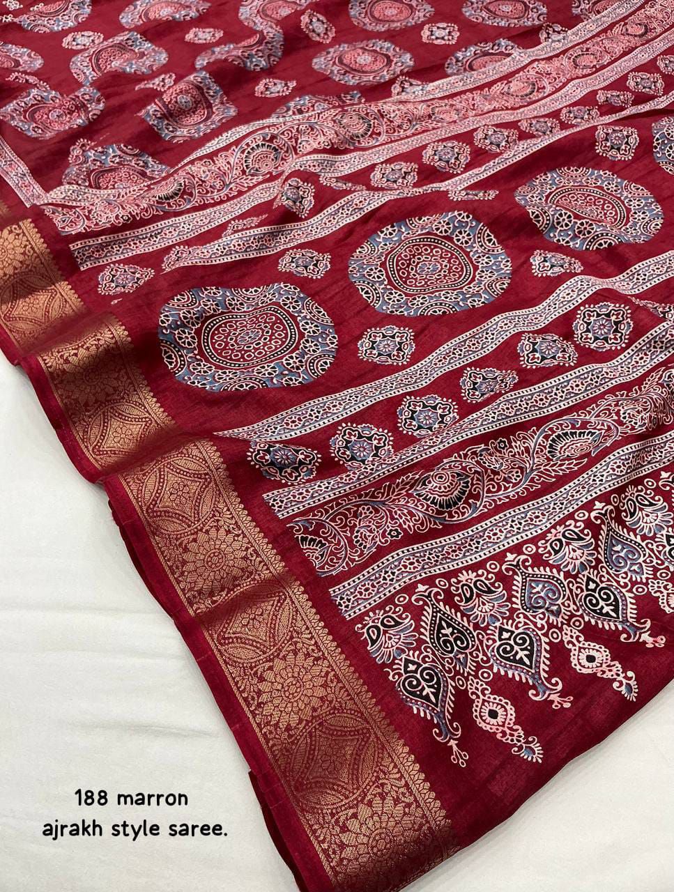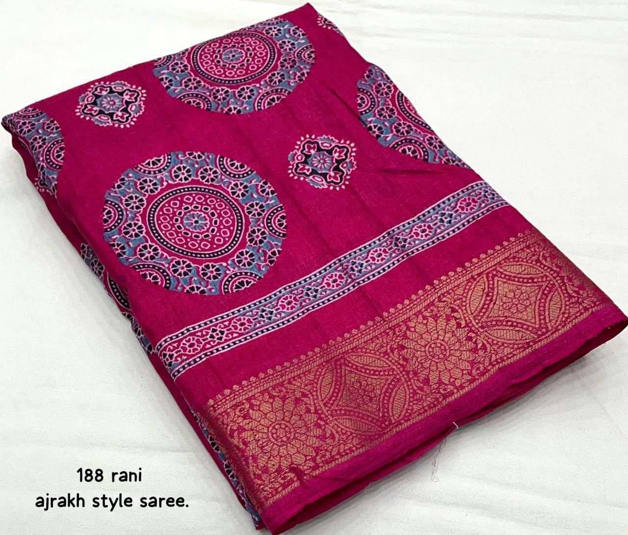 AK – Handloom Ajrakh Slub Silk Saree with Zari Pattu Border & Printed Silk Blouse