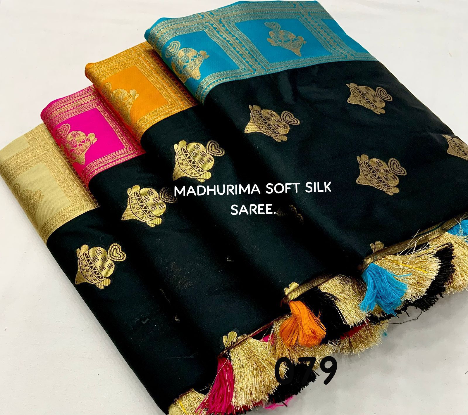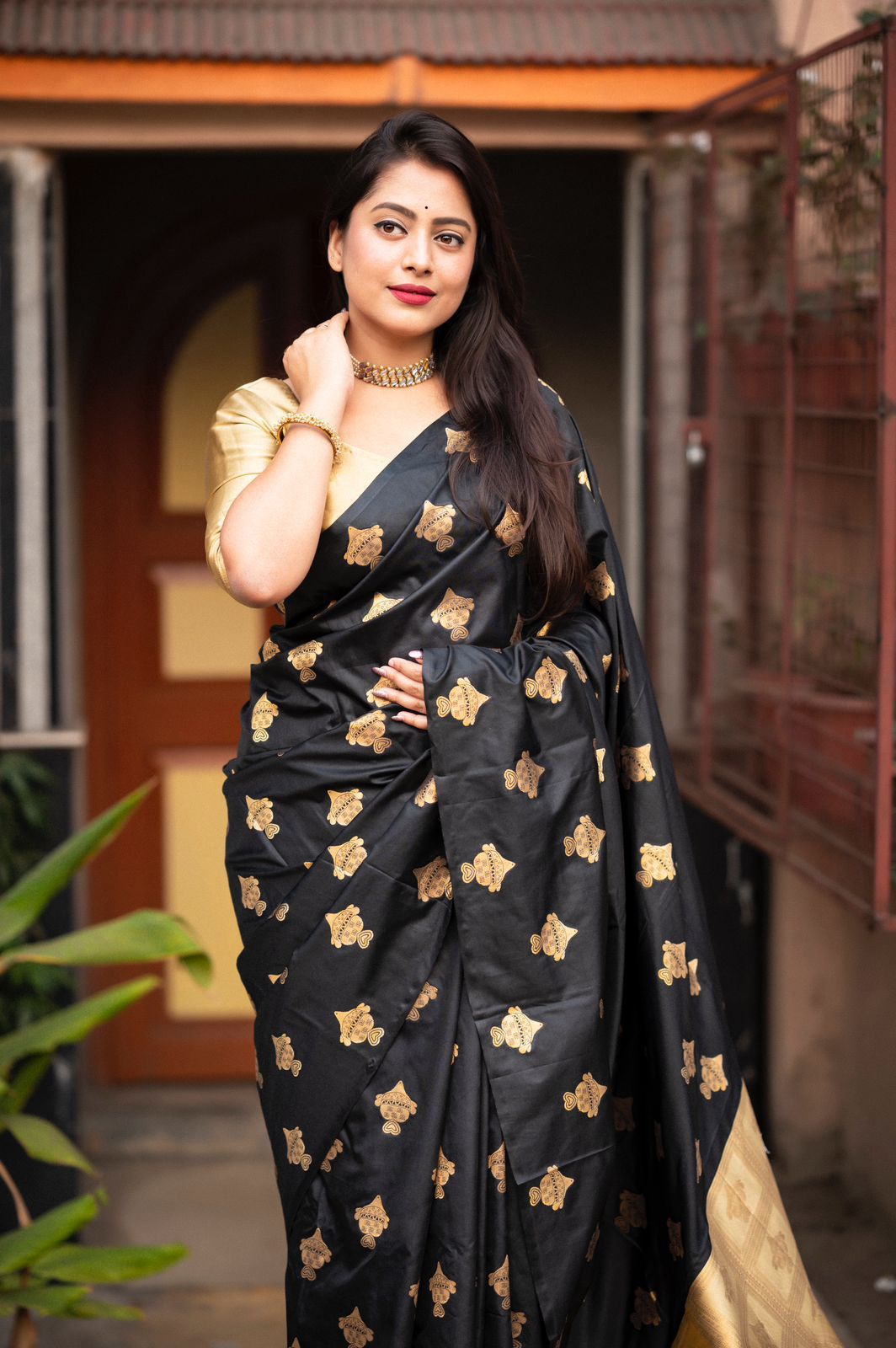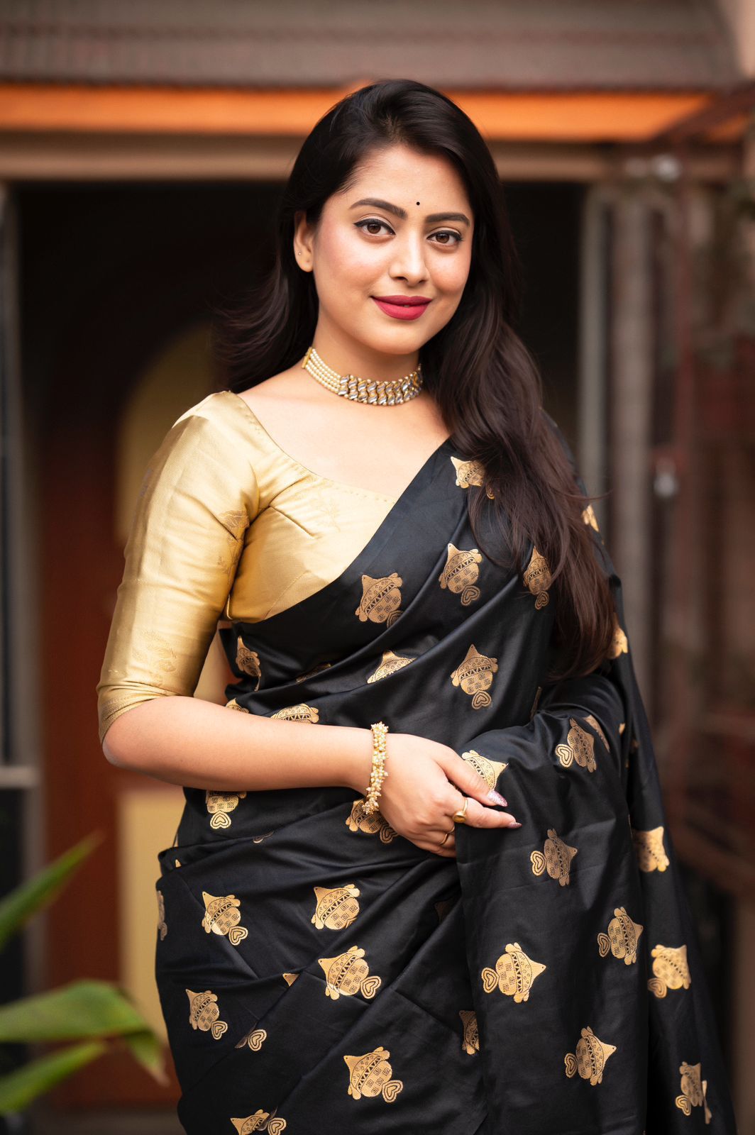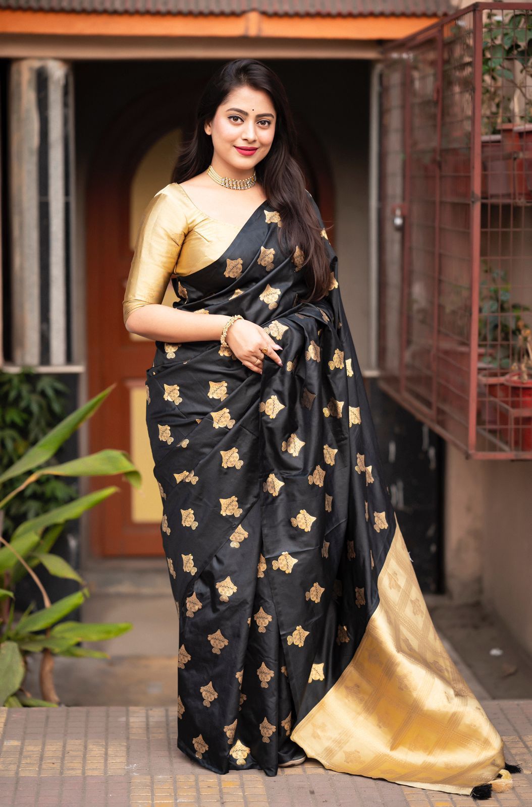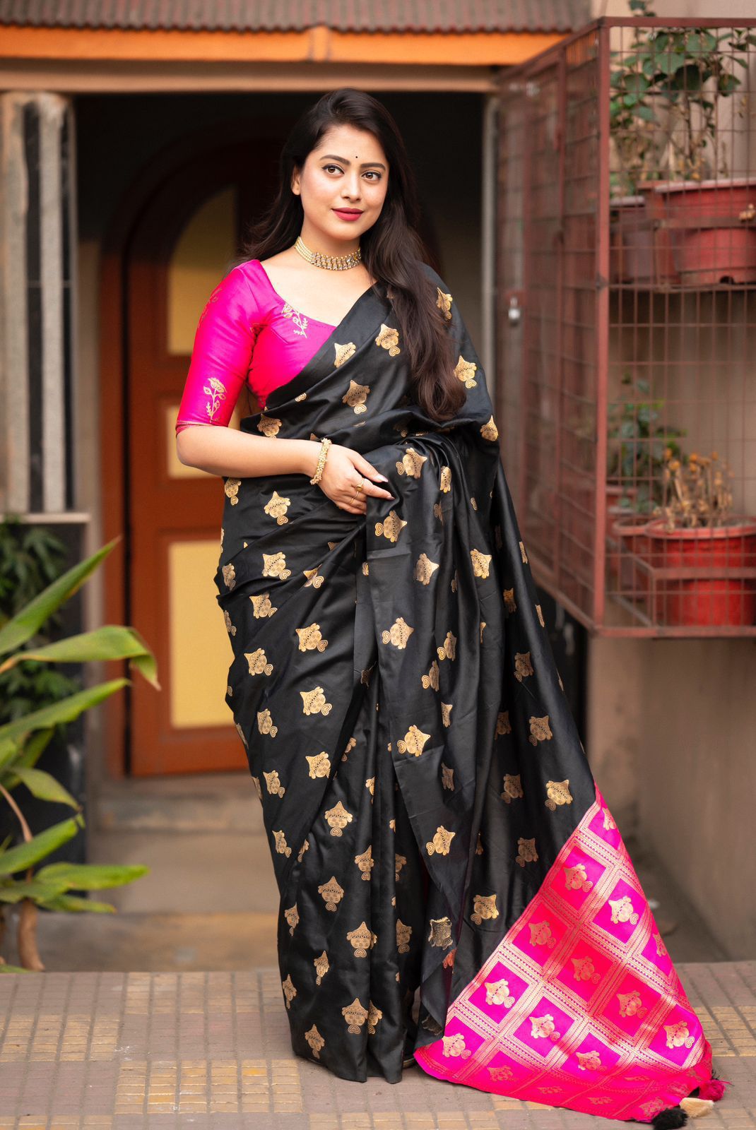 Black Soft Silk Saree with Contrast Zari Woven Pallu & Blouse | Cotton Tassels on Pallu