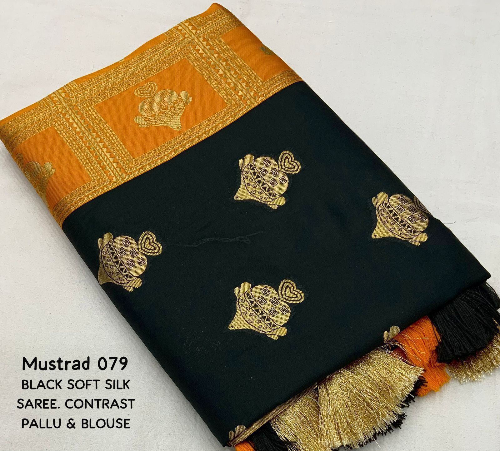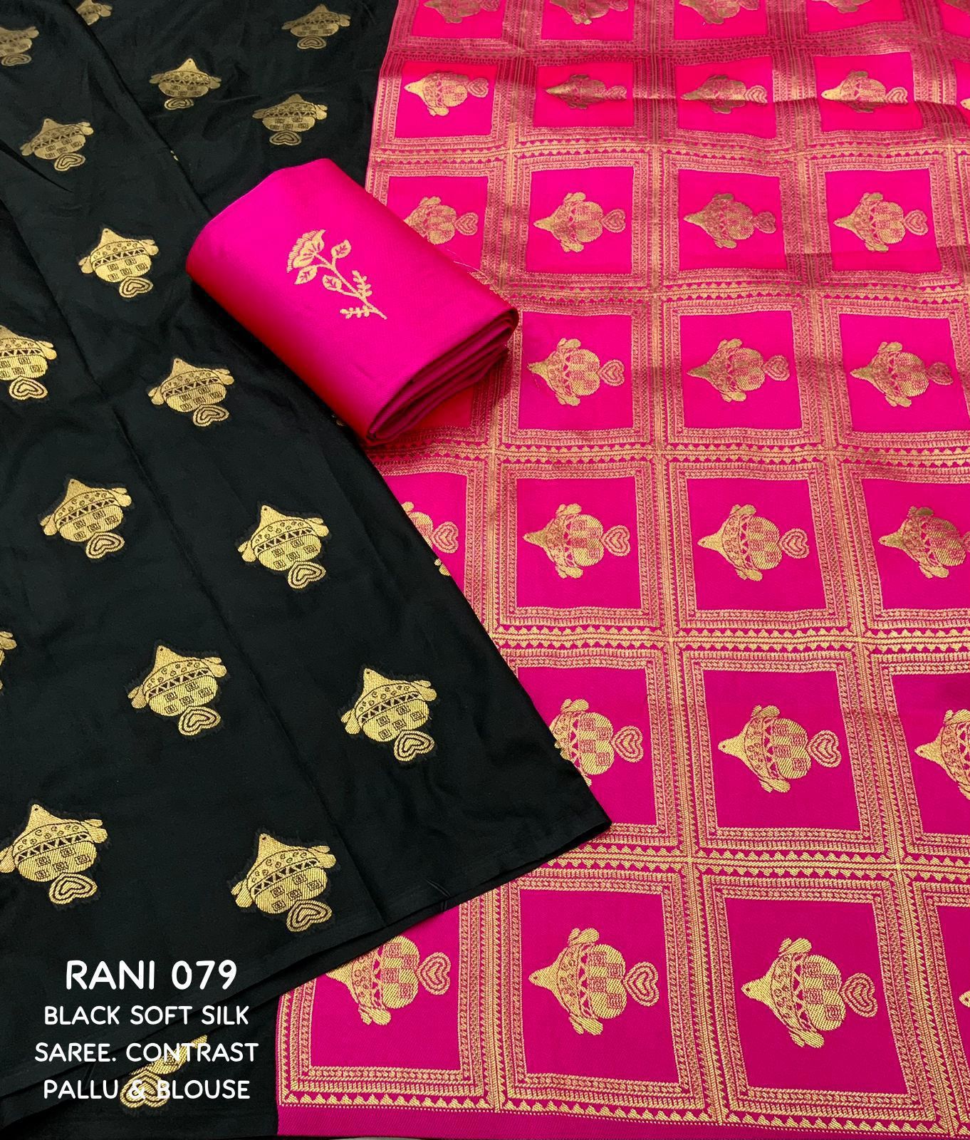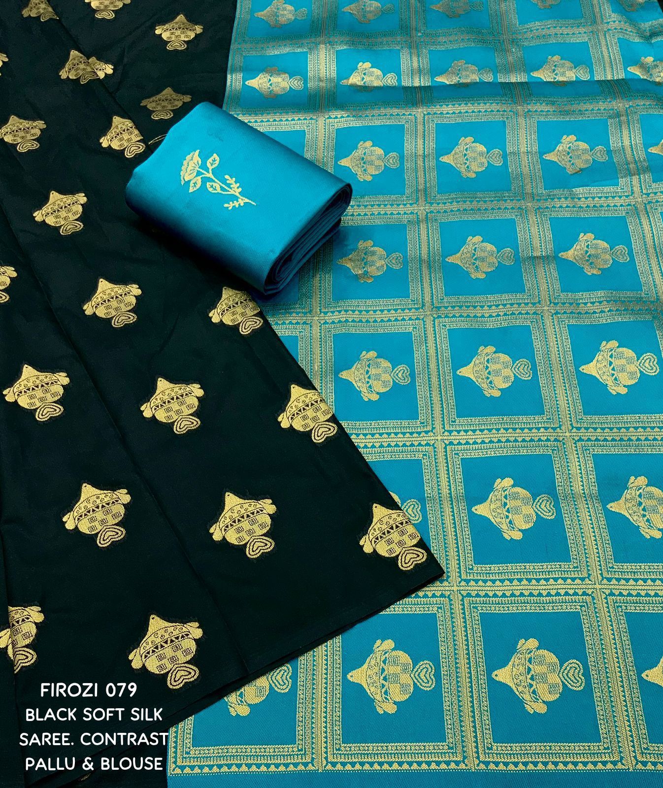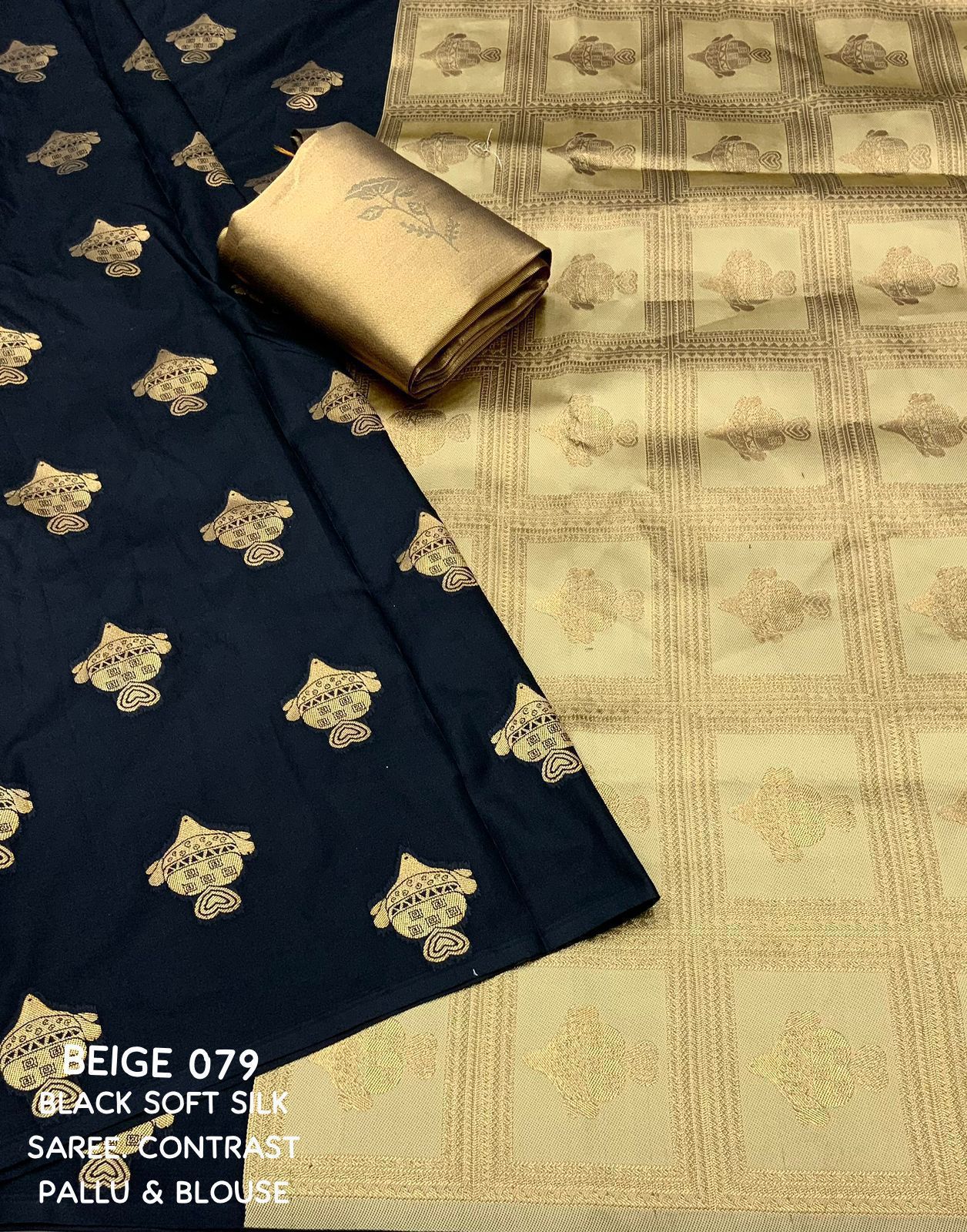 Drape yourself in timeless elegance with this black soft silk saree, featuring rich zari woven detailing throughout. The highlight of the ensemble is its striking contrast pallu and blouse, adding a regal touch to the classic black base.