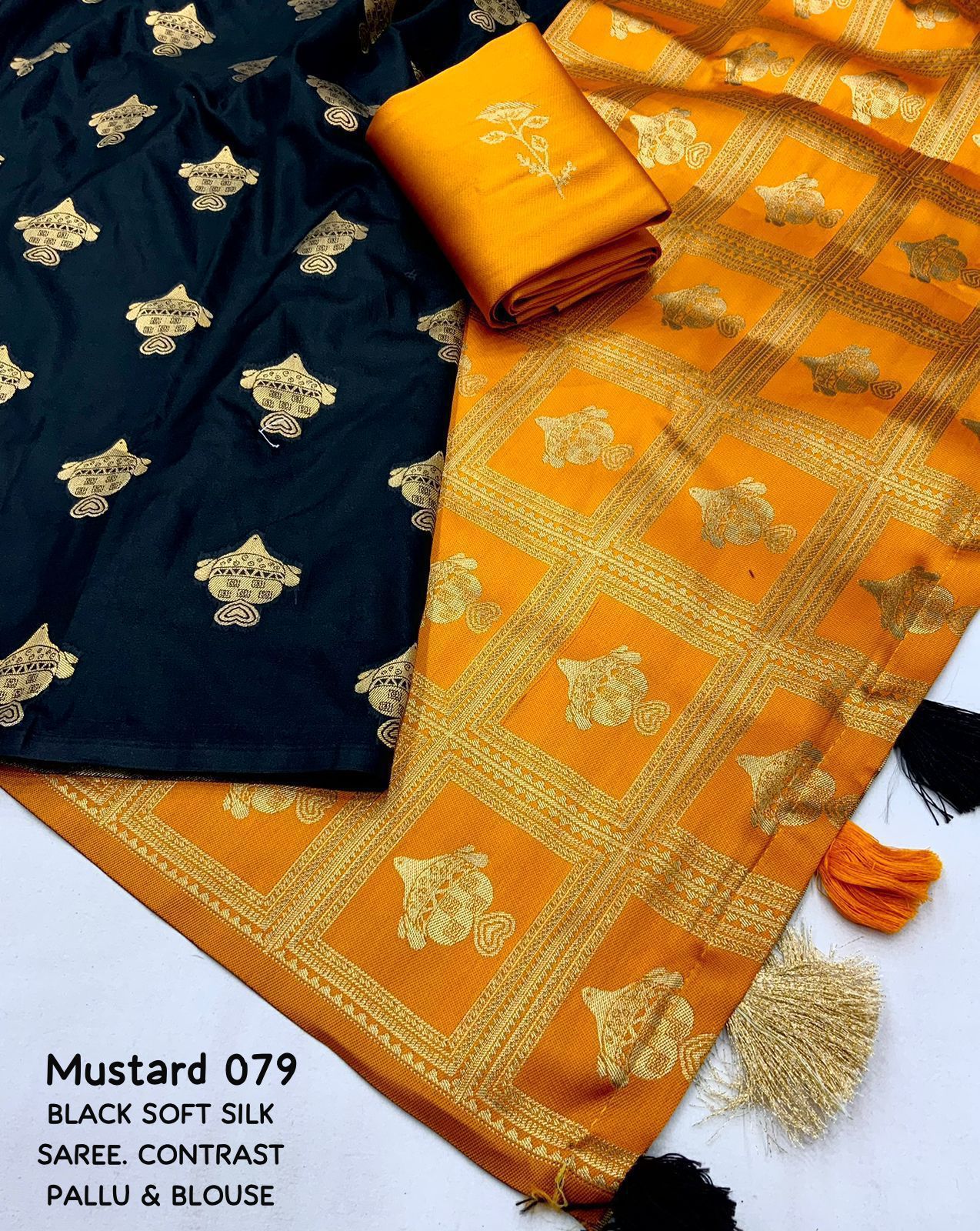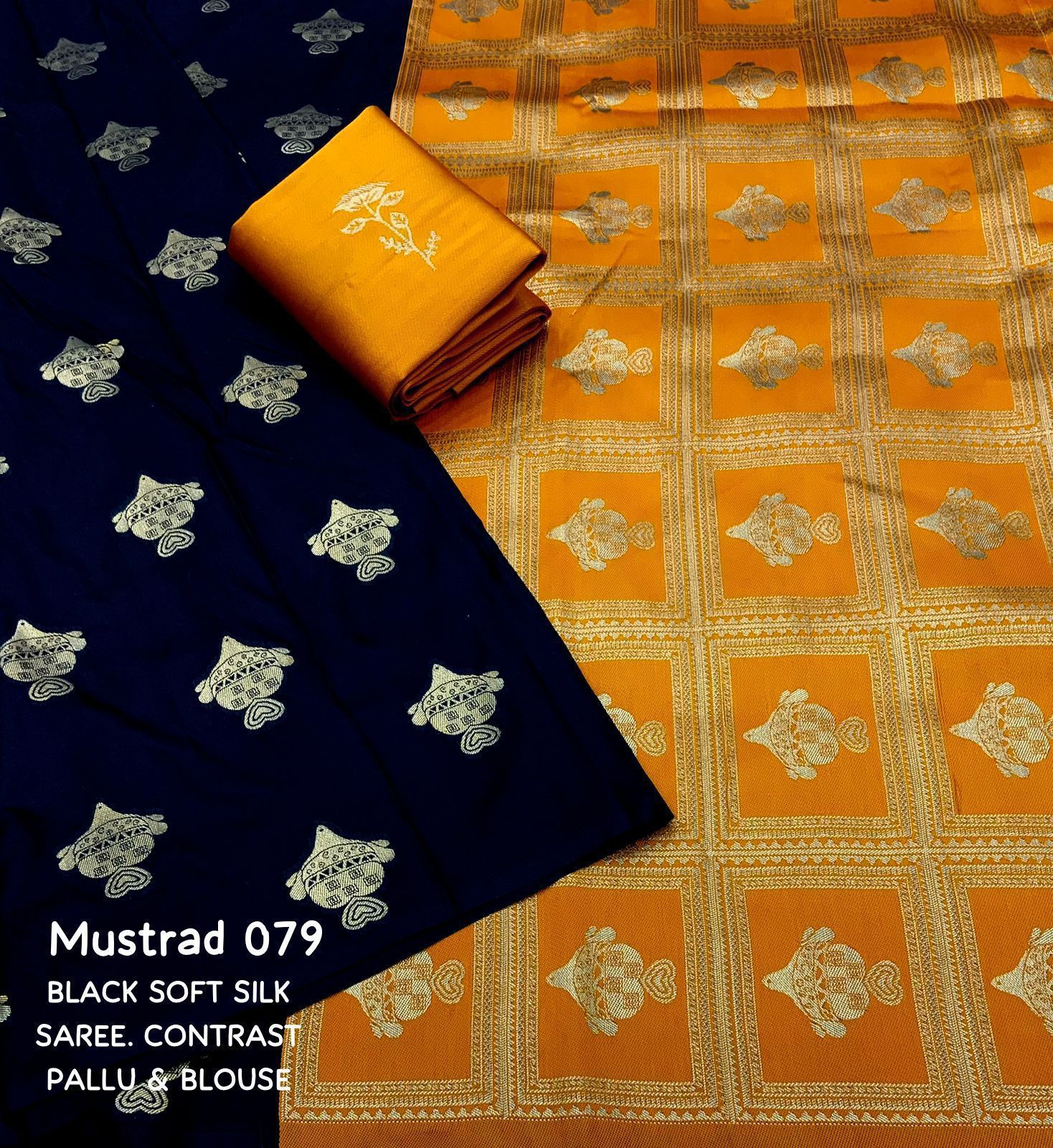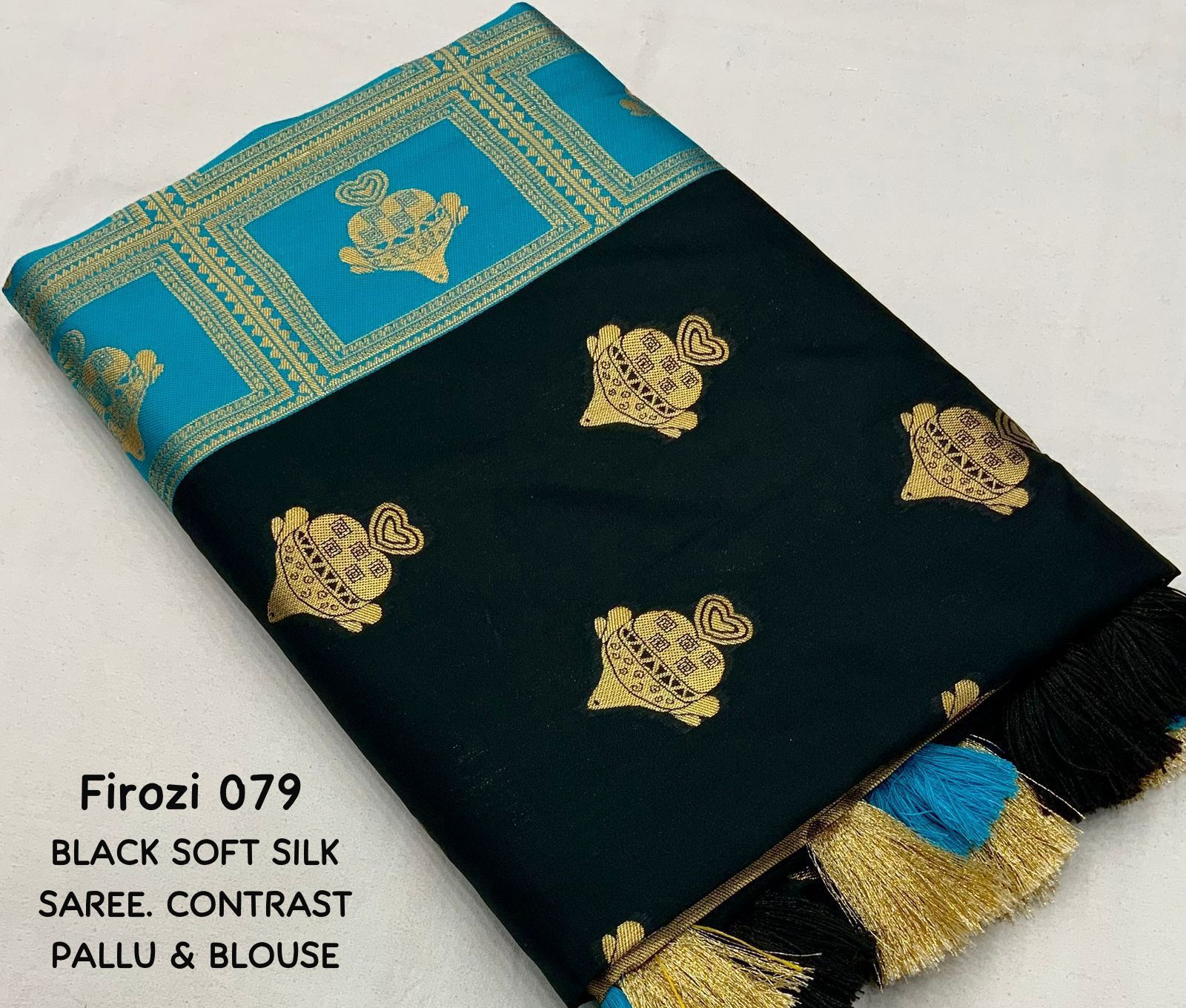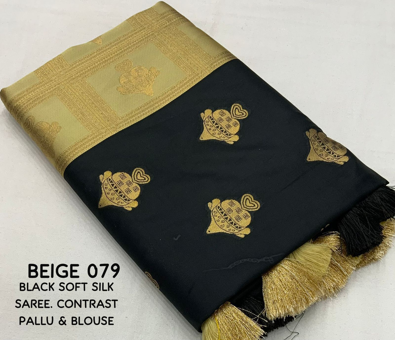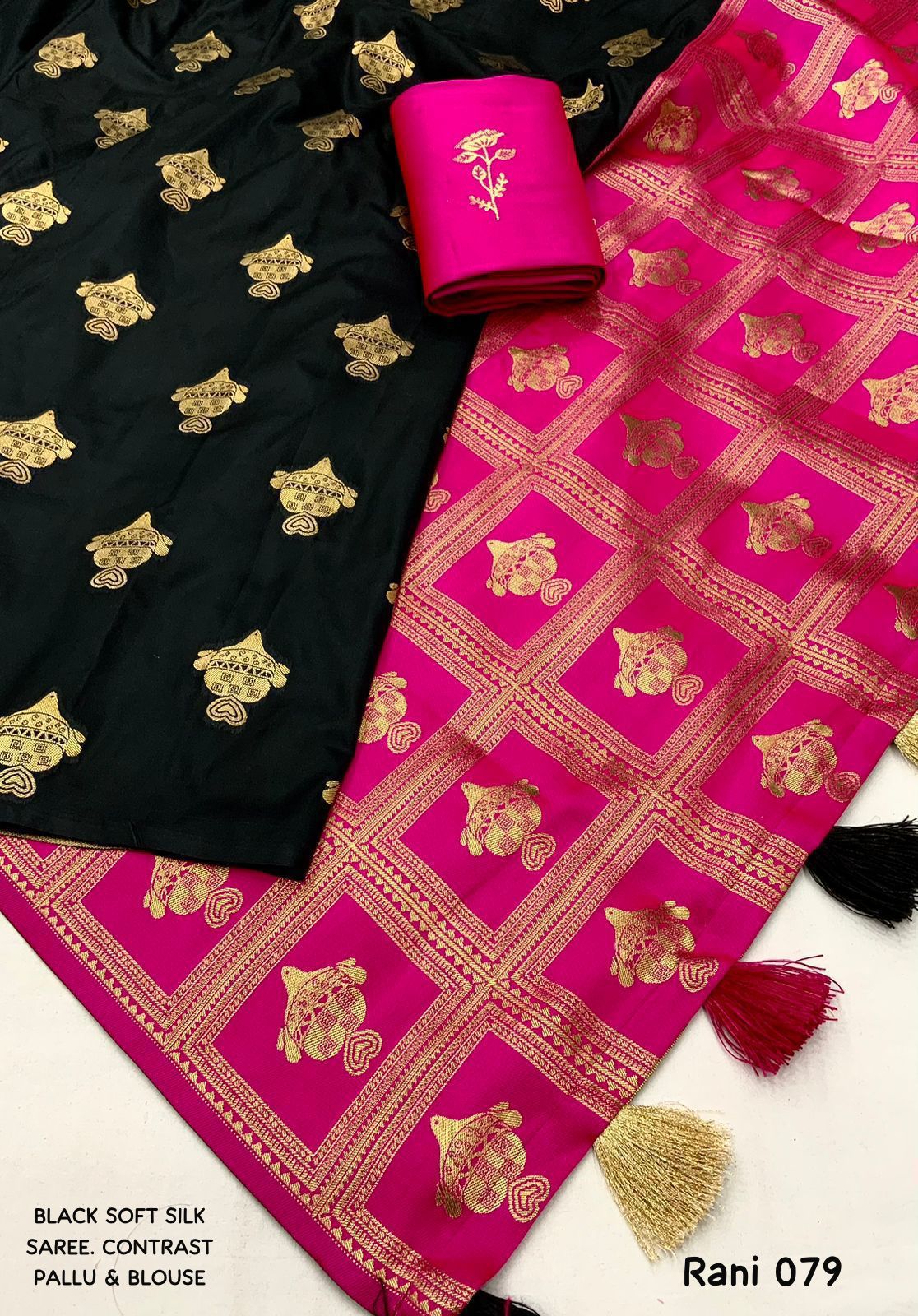 Drape yourself in timeless elegance with this black soft silk saree, featuring rich zari woven detailing throughout. The highlight of the ensemble is its striking contrast pallu and blouse, adding a regal touch to the classic black base.