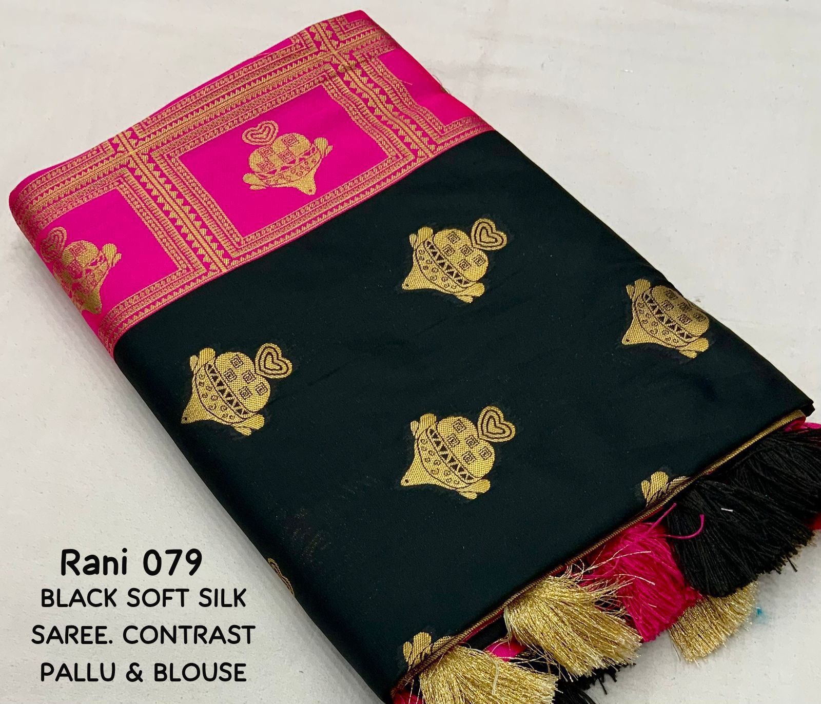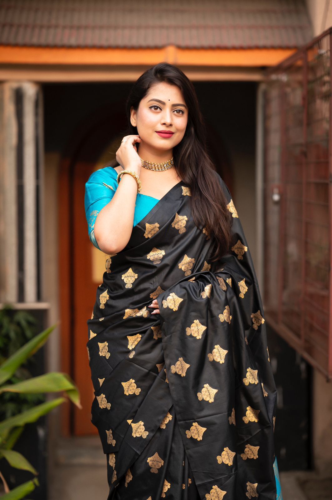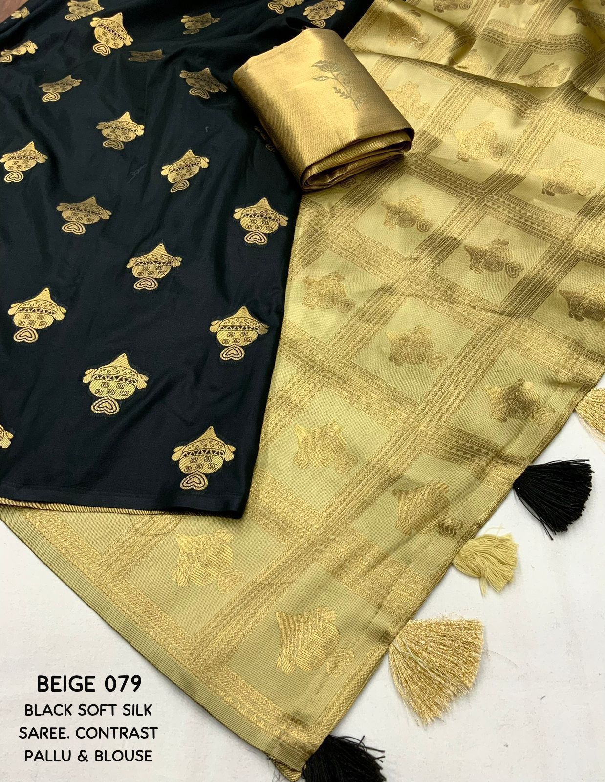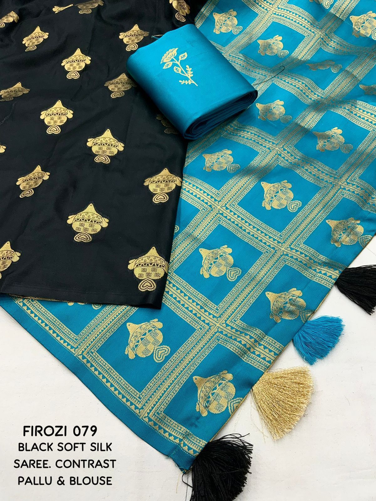 Drape yourself in timeless elegance with this black soft silk saree, featuring rich zari woven detailing throughout. The highlight of the ensemble is its striking contrast pallu and blouse, adding a regal touch to the classic black base.
