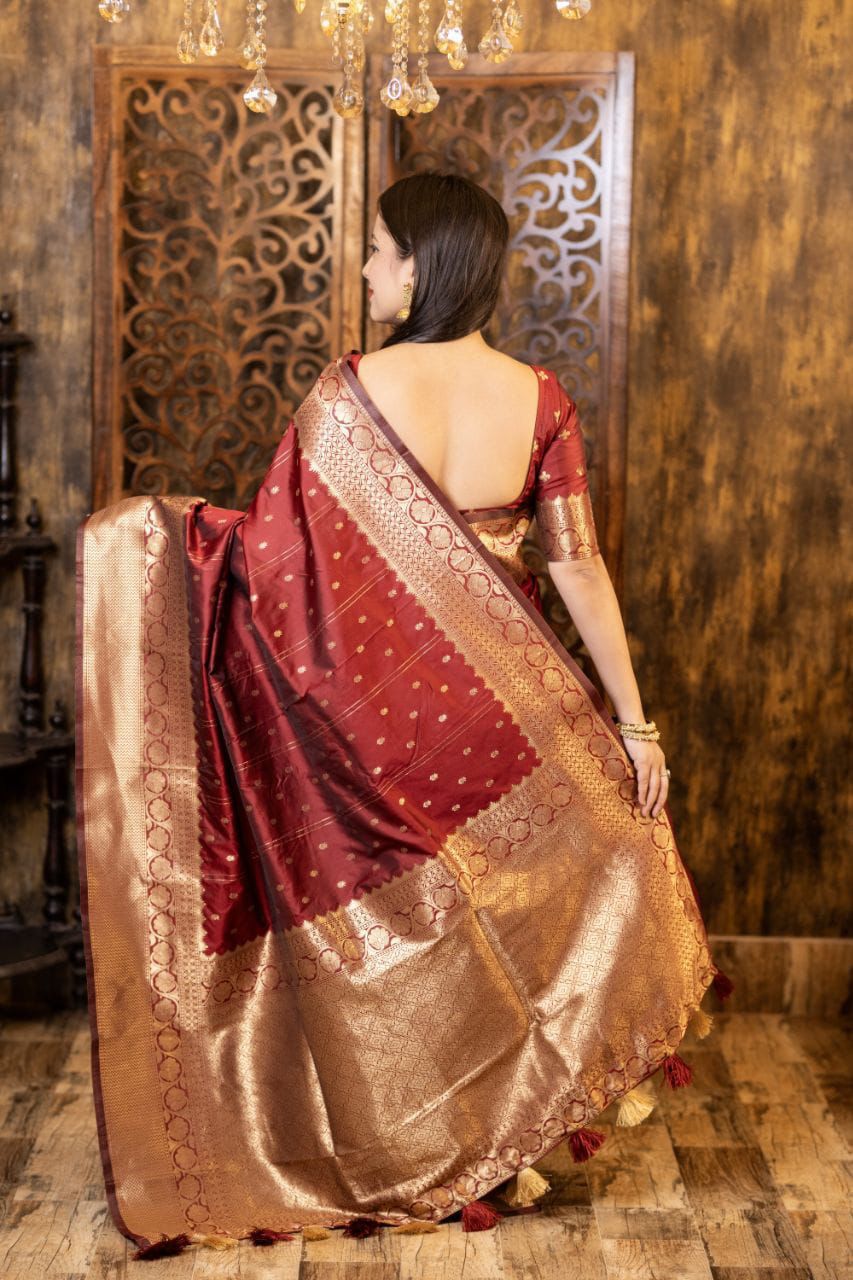 The saree features exquisite zari weaving throughout, adding depth and richness to its texture. With its timeless design and detailed craftsmanship, this saree is a true reflection of heritage styling.