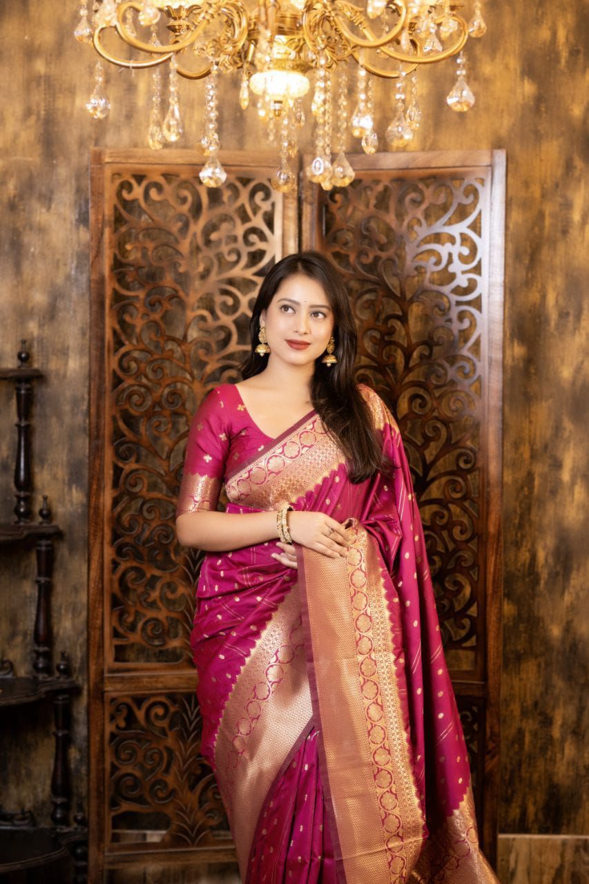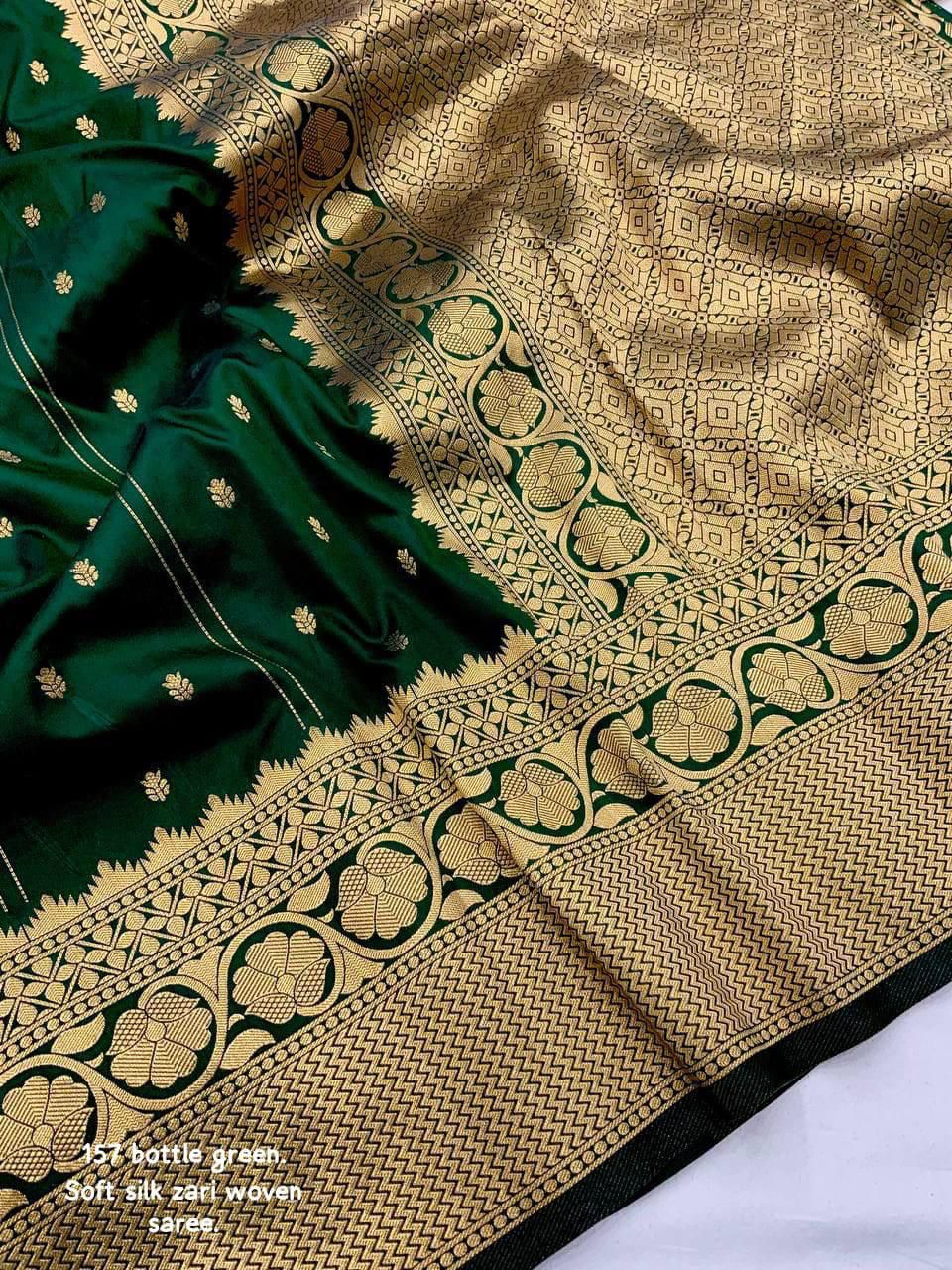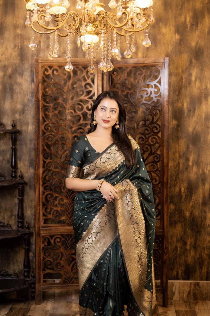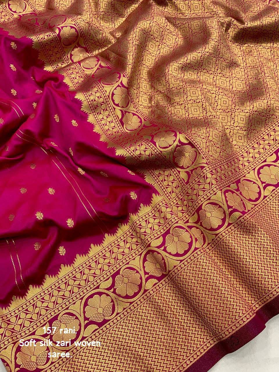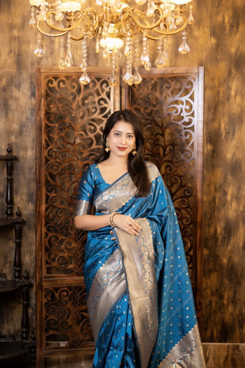 Elevate your ethnic wardrobe with this Soft Silk Zari Woven Saree, designed with elegant Leheriya-style butti weaving that brings a subtle blend of tradition and sophistication. The rich silk fabric offers a luxurious sheen and soft drape, making it ideal for festive occasions, weddings, and cultural celebrations.