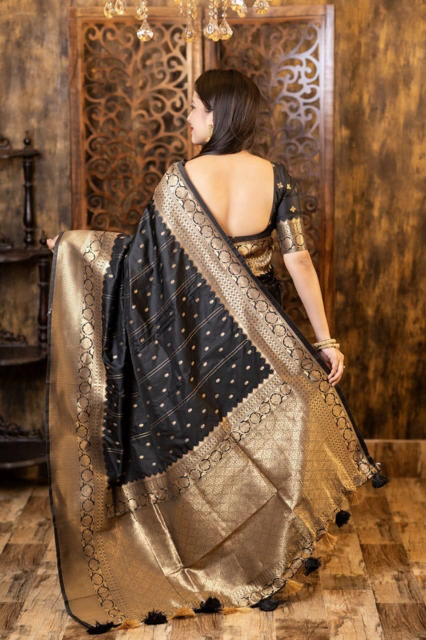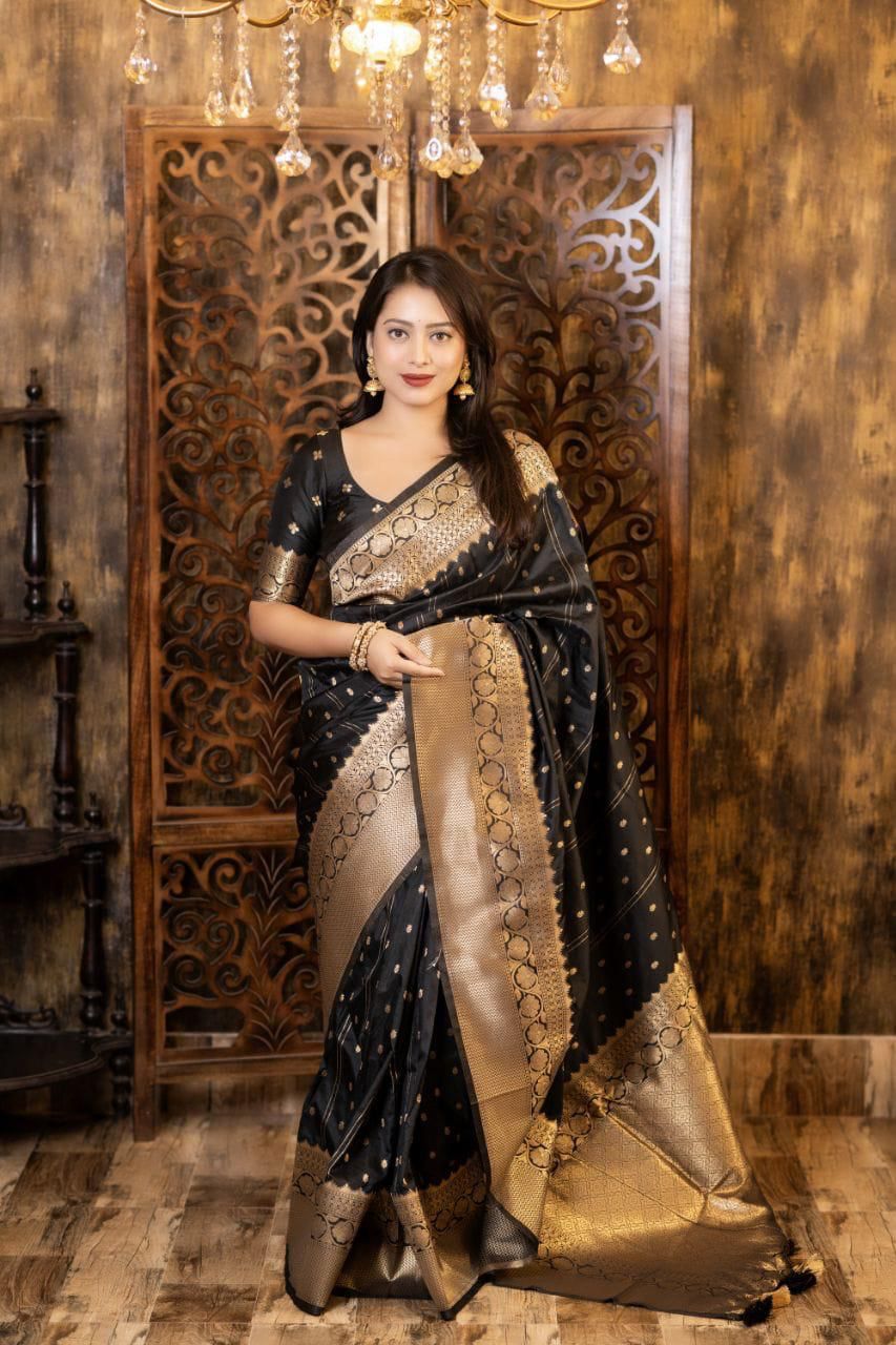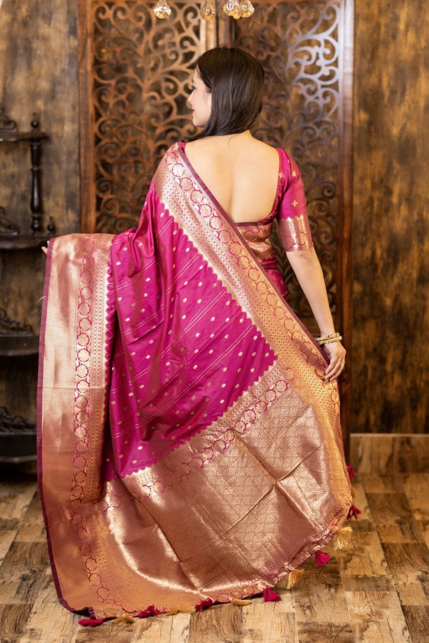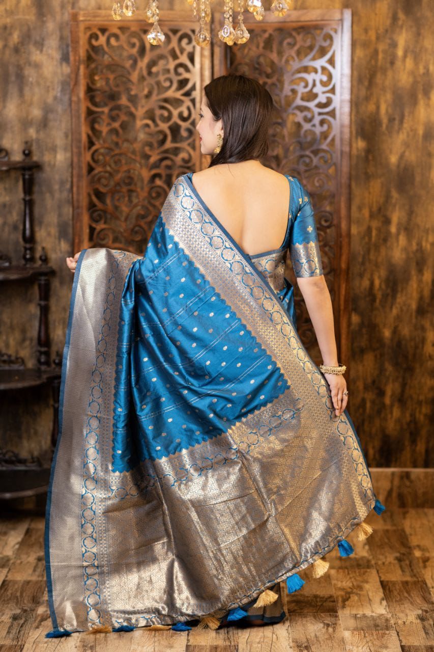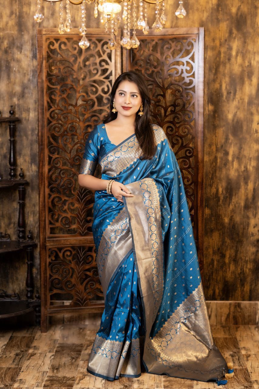 Elevate your ethnic wardrobe with this Soft Silk Zari Woven Saree, designed with elegant Leheriya-style butti weaving that brings a subtle blend of tradition and sophistication. The rich silk fabric offers a luxurious sheen and soft drape, making it ideal for festive occasions, weddings, and cultural celebrations.