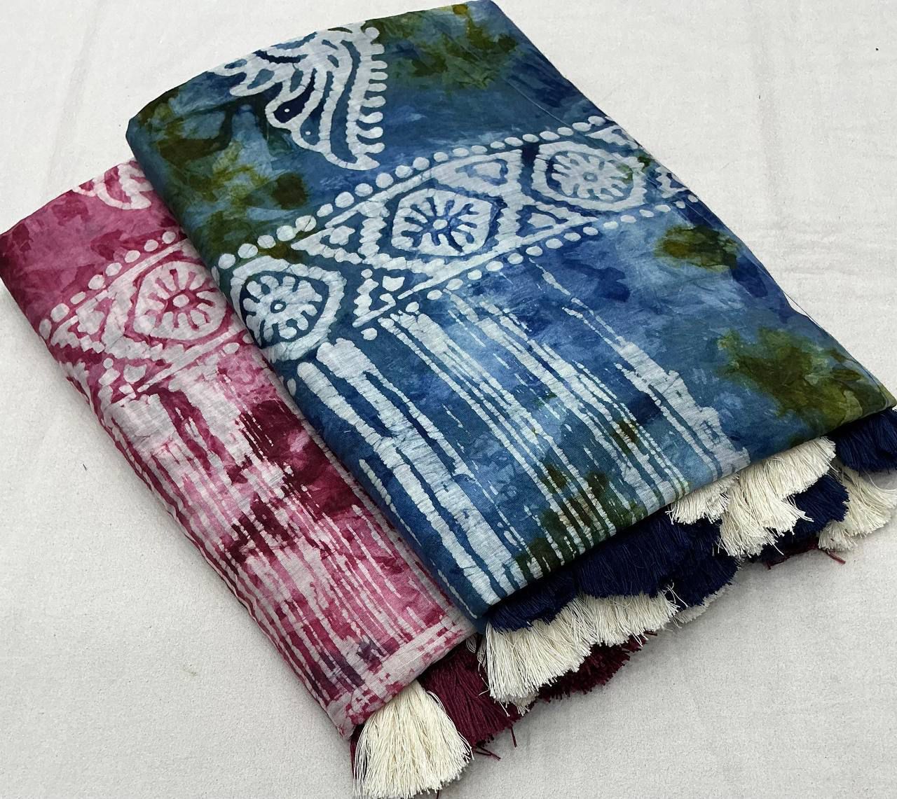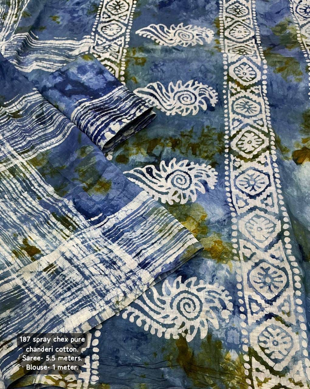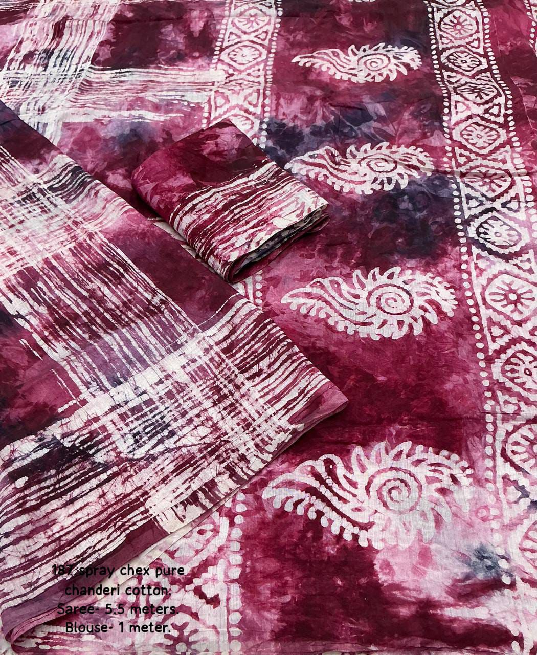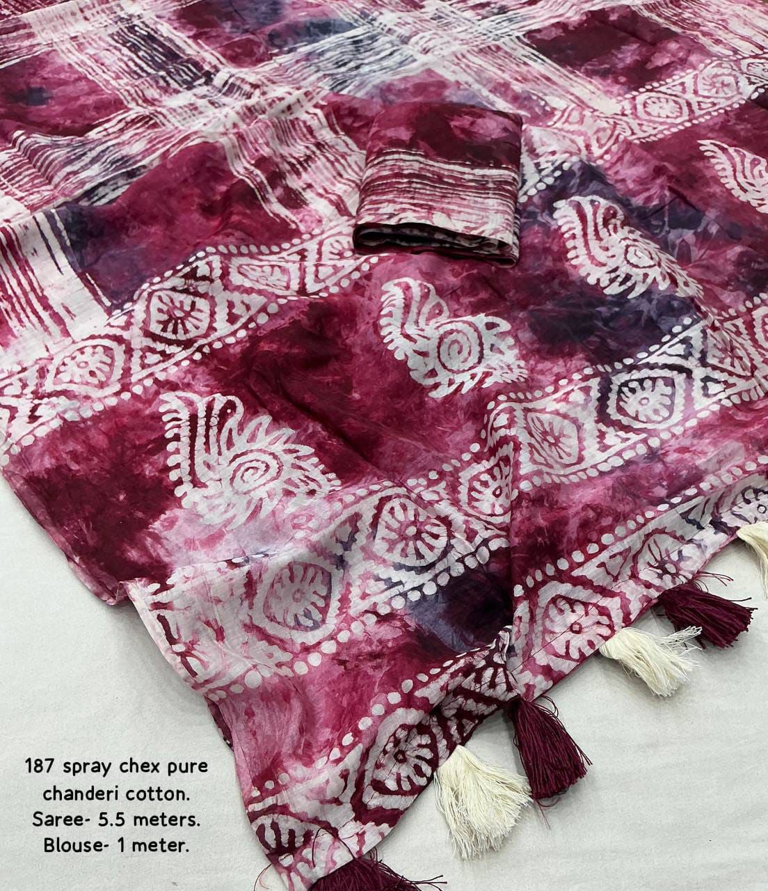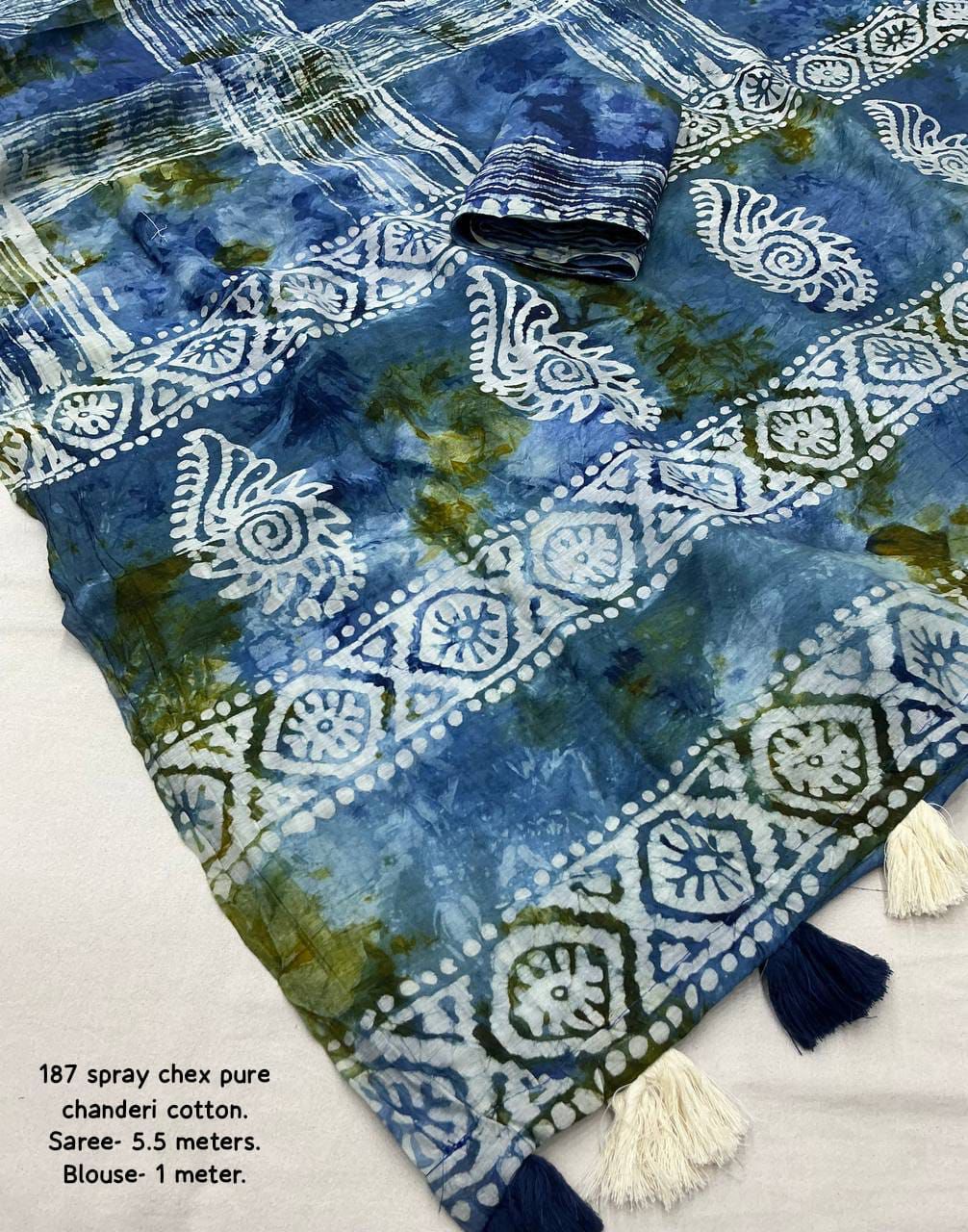 Pure Soft Chanderi Cotton Saree with Spray Dye & Hand Block Print | Cotton Tassels Pallu