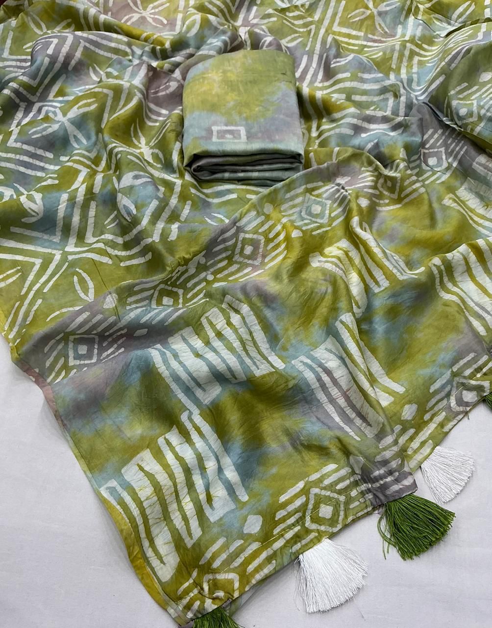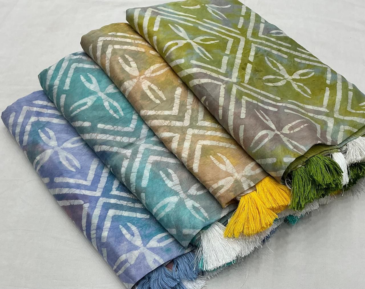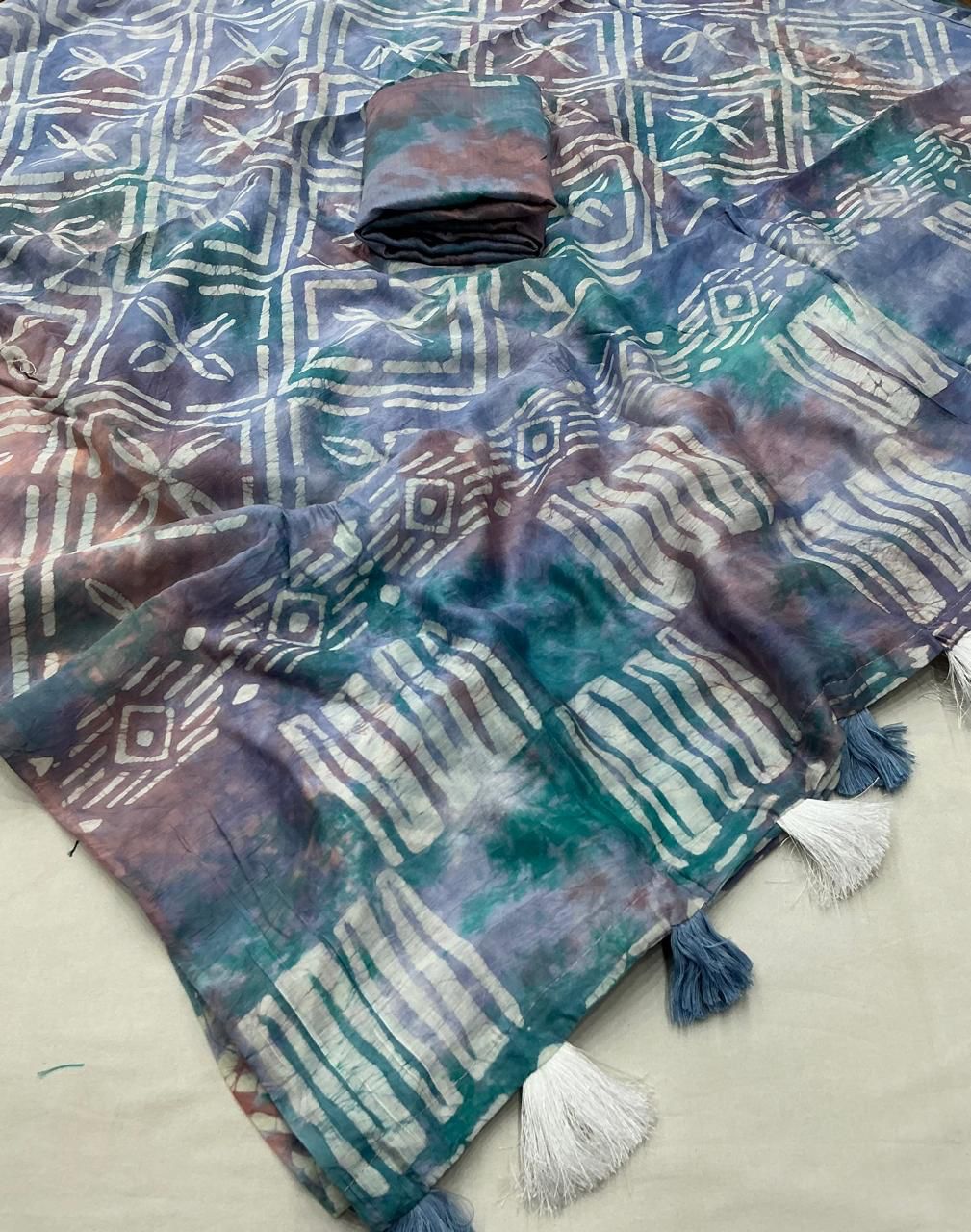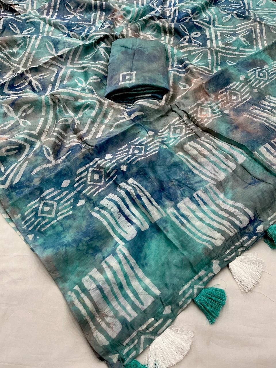 Pure Soft Chanderi Cotton Saree with Spray Dye & Hand Block Print | Cotton Tassels Pallu