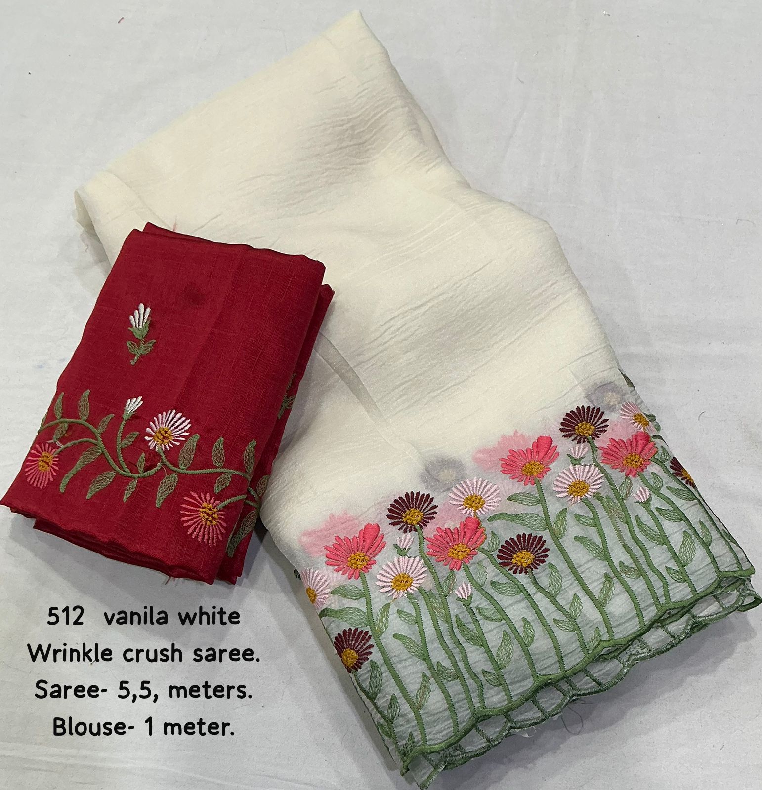 AK- Vanilla Crush Off-White Wrinkle-Free Crush Saree with Heavy Embroidered Cutwork Pallu & Contrast Phantom Silk Blouse
