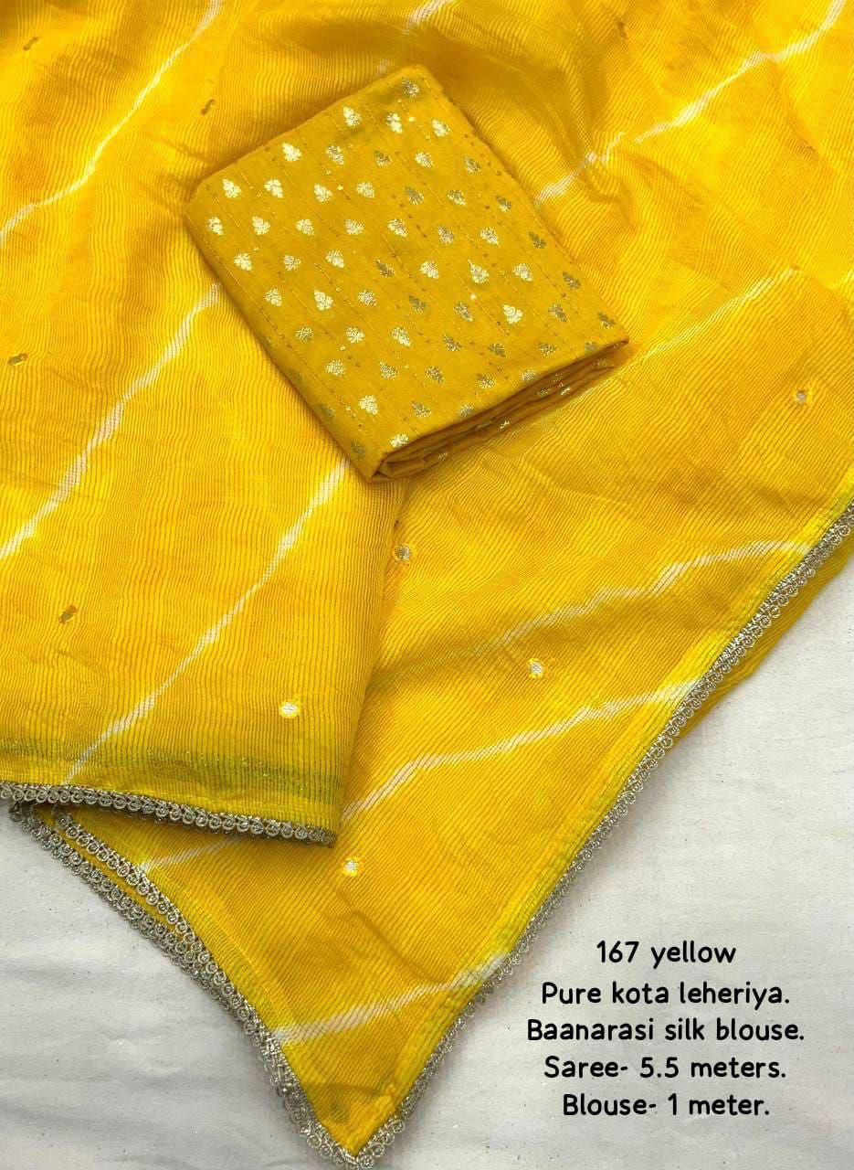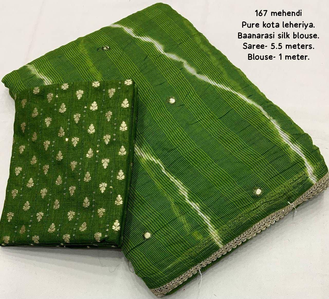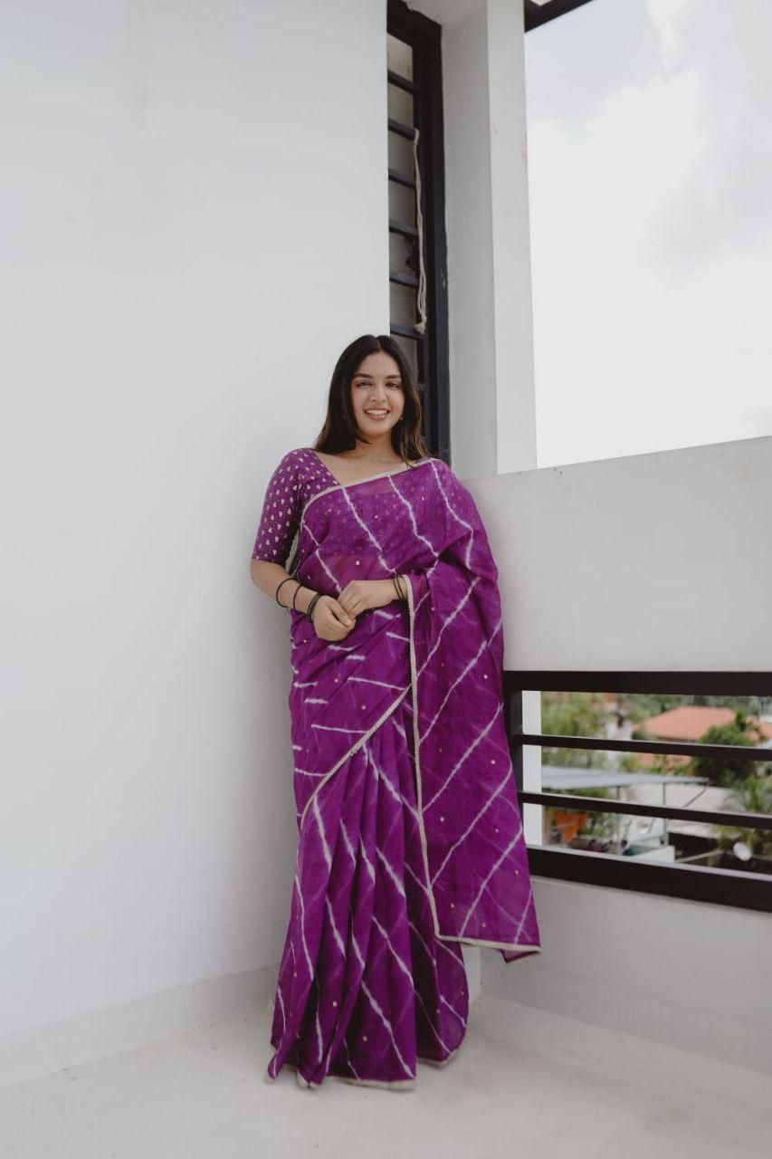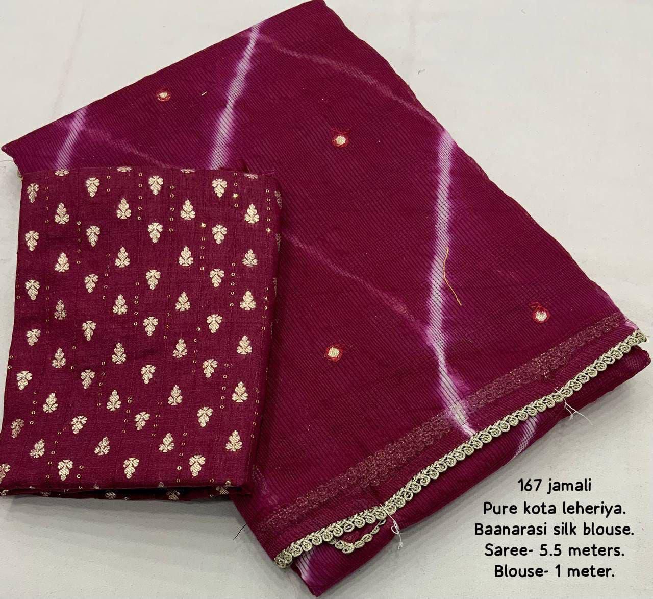 Embrace timeless Rajasthani elegance with this pure Kota saree featuring vibrant leheriya tie & dye patterns. Crafted with finesse, the saree is accentuated by Aari work patches and a graceful lace border, making it ideal for festive and ethnic occasions.
