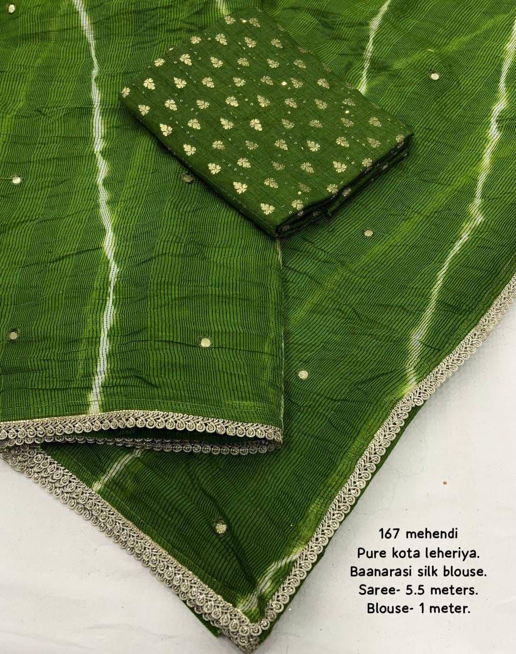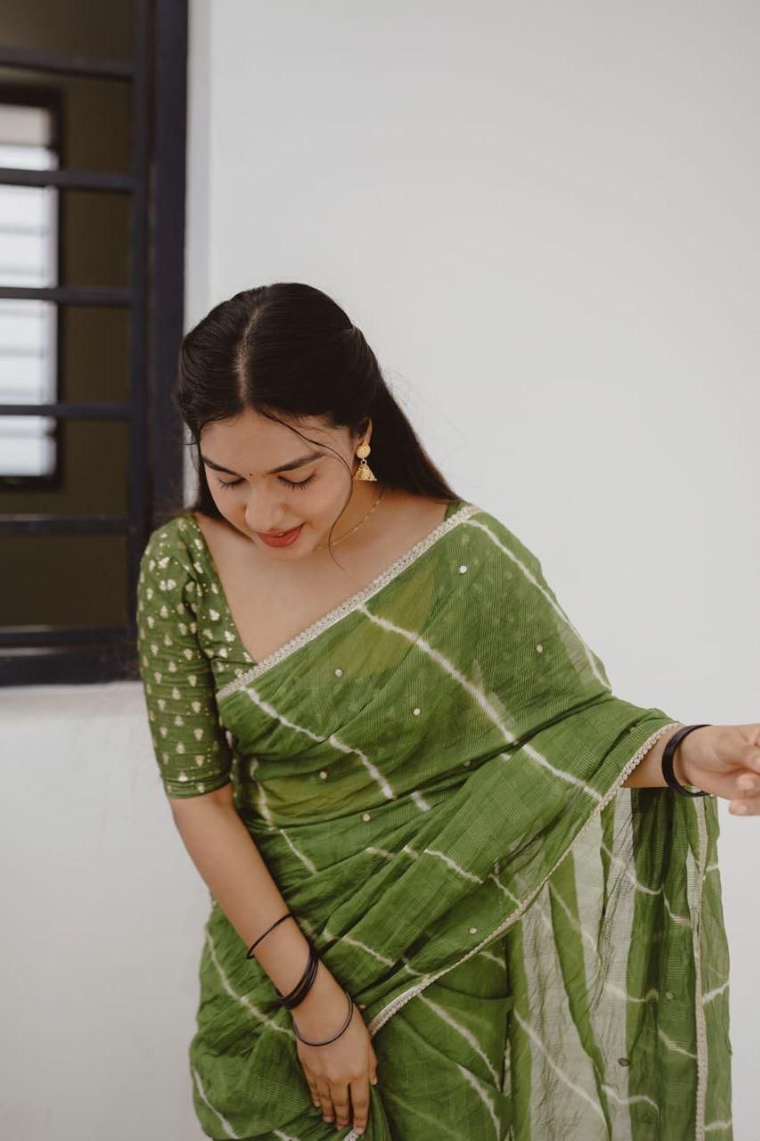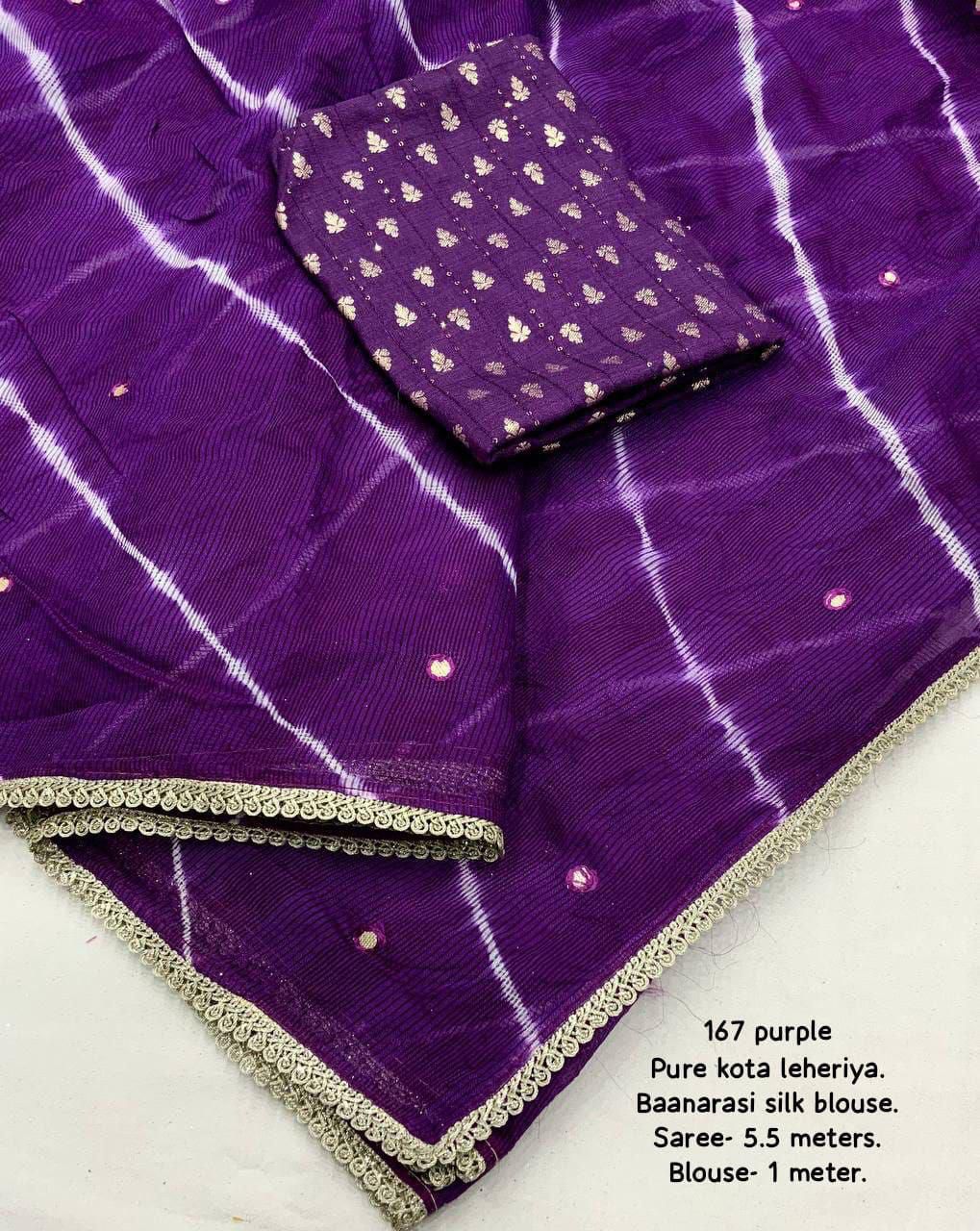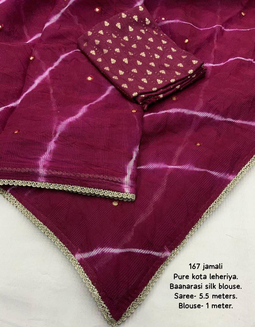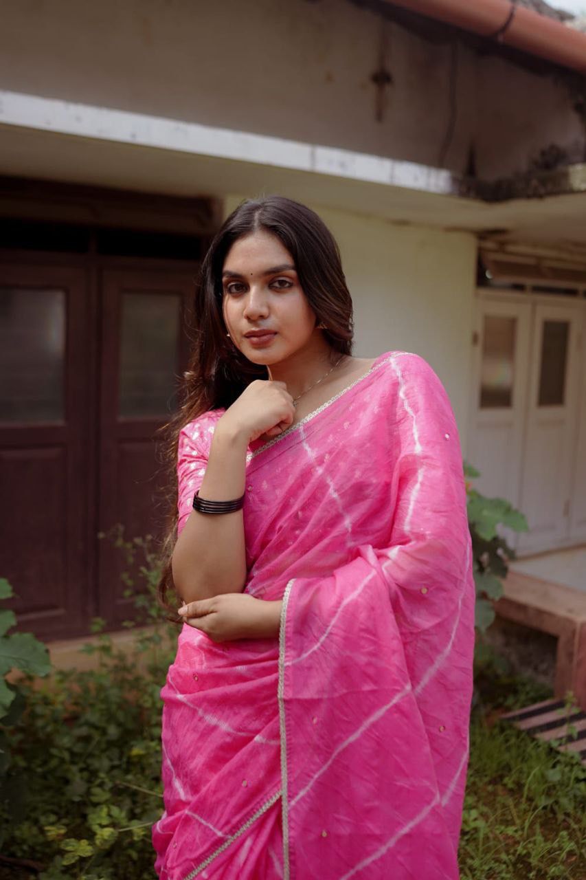 Embrace timeless Rajasthani elegance with this pure Kota saree featuring vibrant leheriya tie & dye patterns. Crafted with finesse, the saree is accentuated by Aari work patches and a graceful lace border, making it ideal for festive and ethnic occasions.