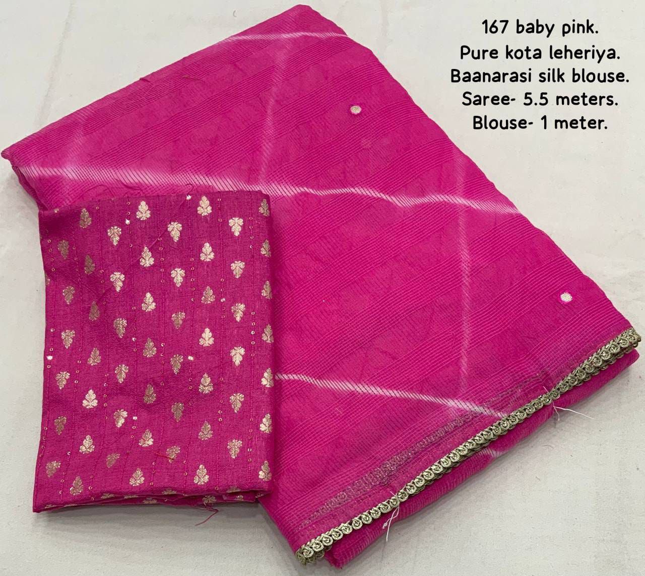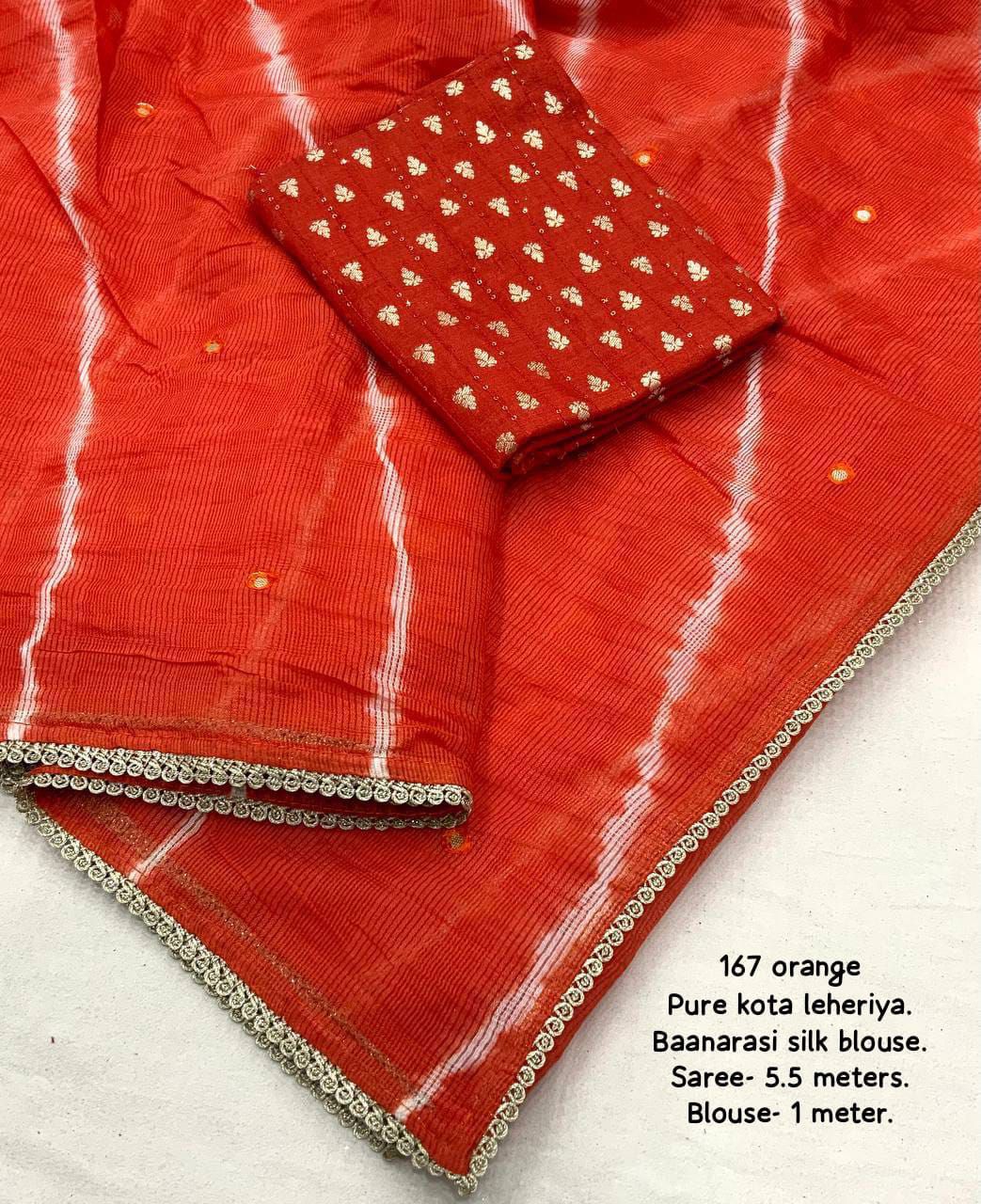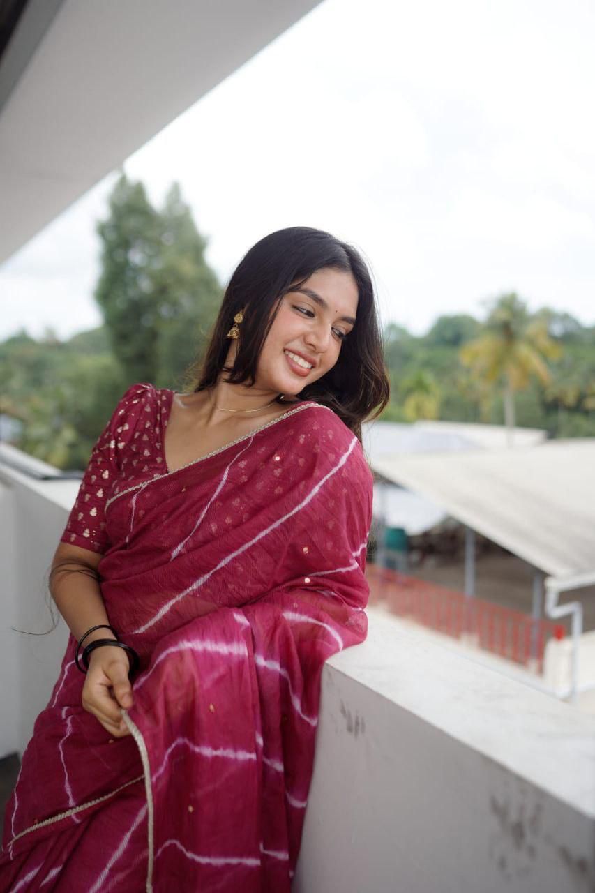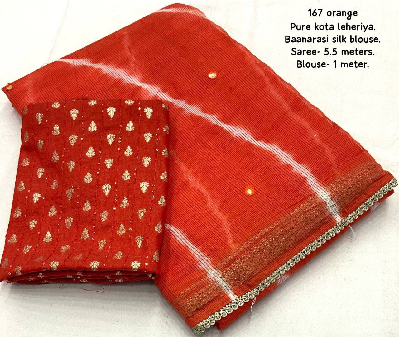 Embrace timeless Rajasthani elegance with this pure Kota saree featuring vibrant leheriya tie & dye patterns. Crafted with finesse, the saree is accentuated by Aari work patches and a graceful lace border, making it ideal for festive and ethnic occasions.