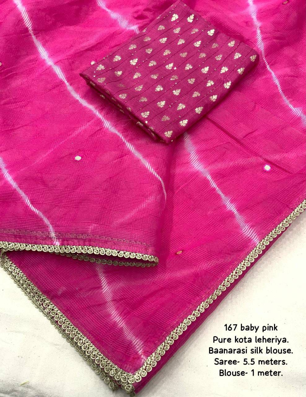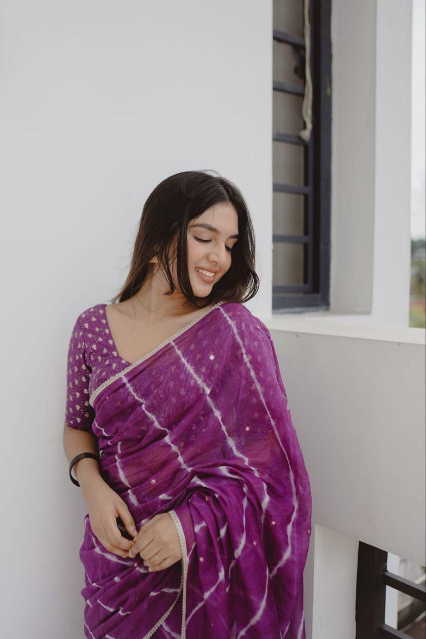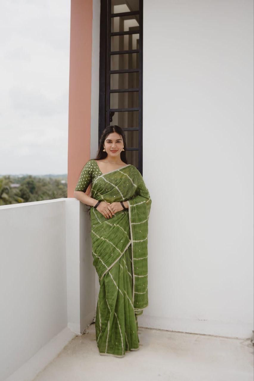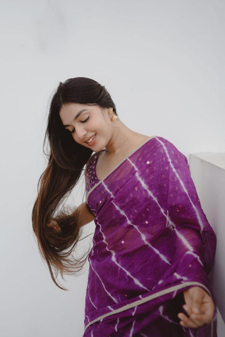 Embrace timeless Rajasthani elegance with this pure Kota saree featuring vibrant leheriya tie & dye patterns. Crafted with finesse, the saree is accentuated by Aari work patches and a graceful lace border, making it ideal for festive and ethnic occasions.
