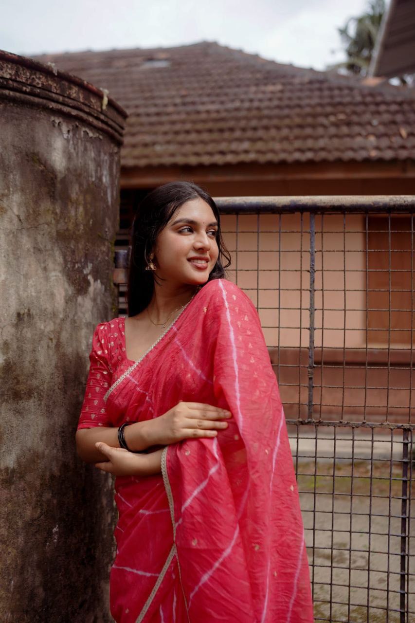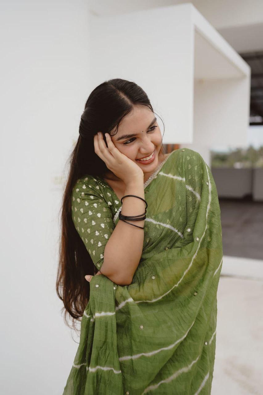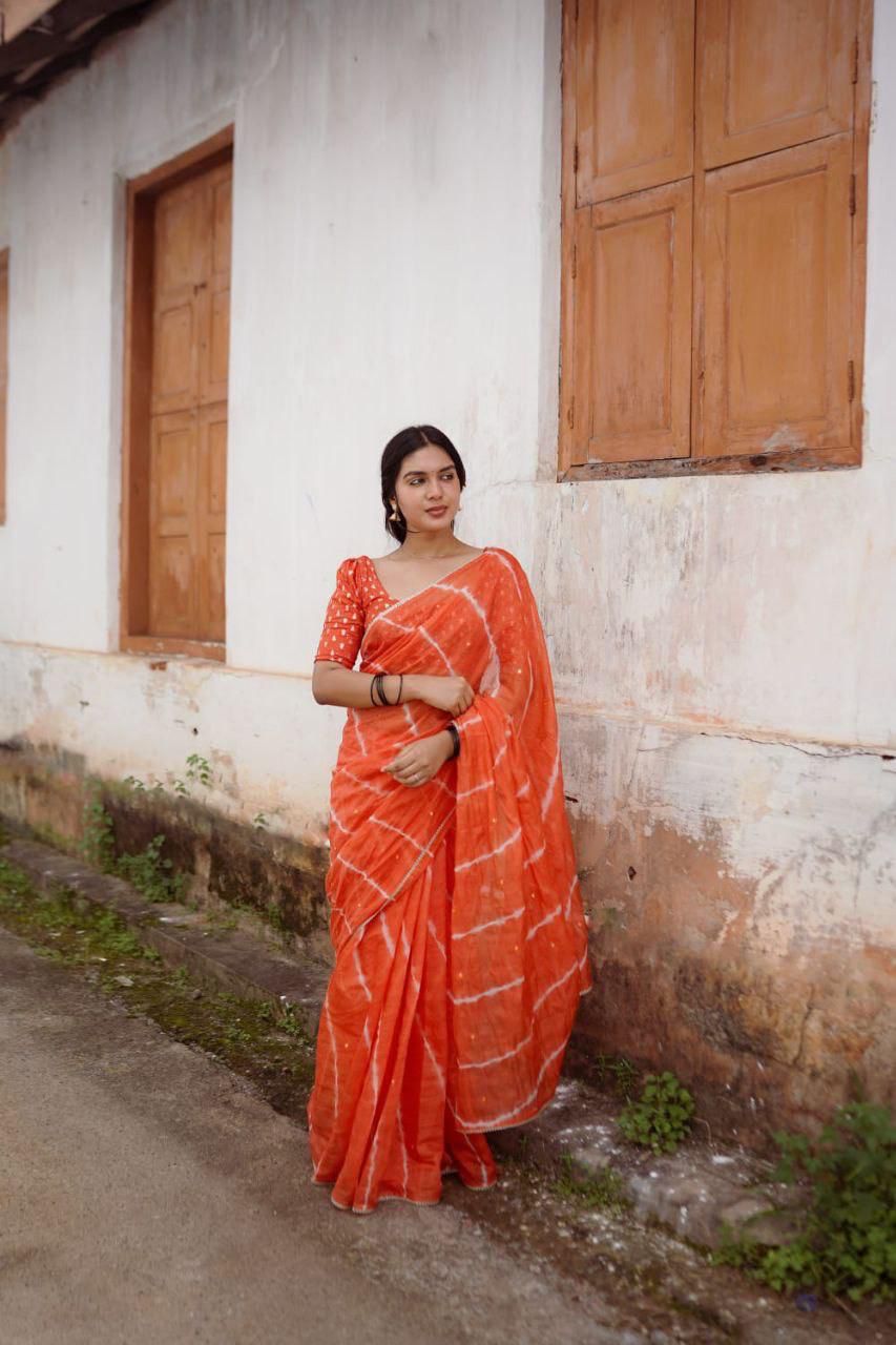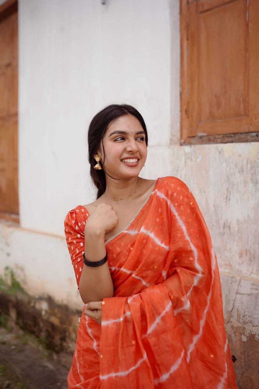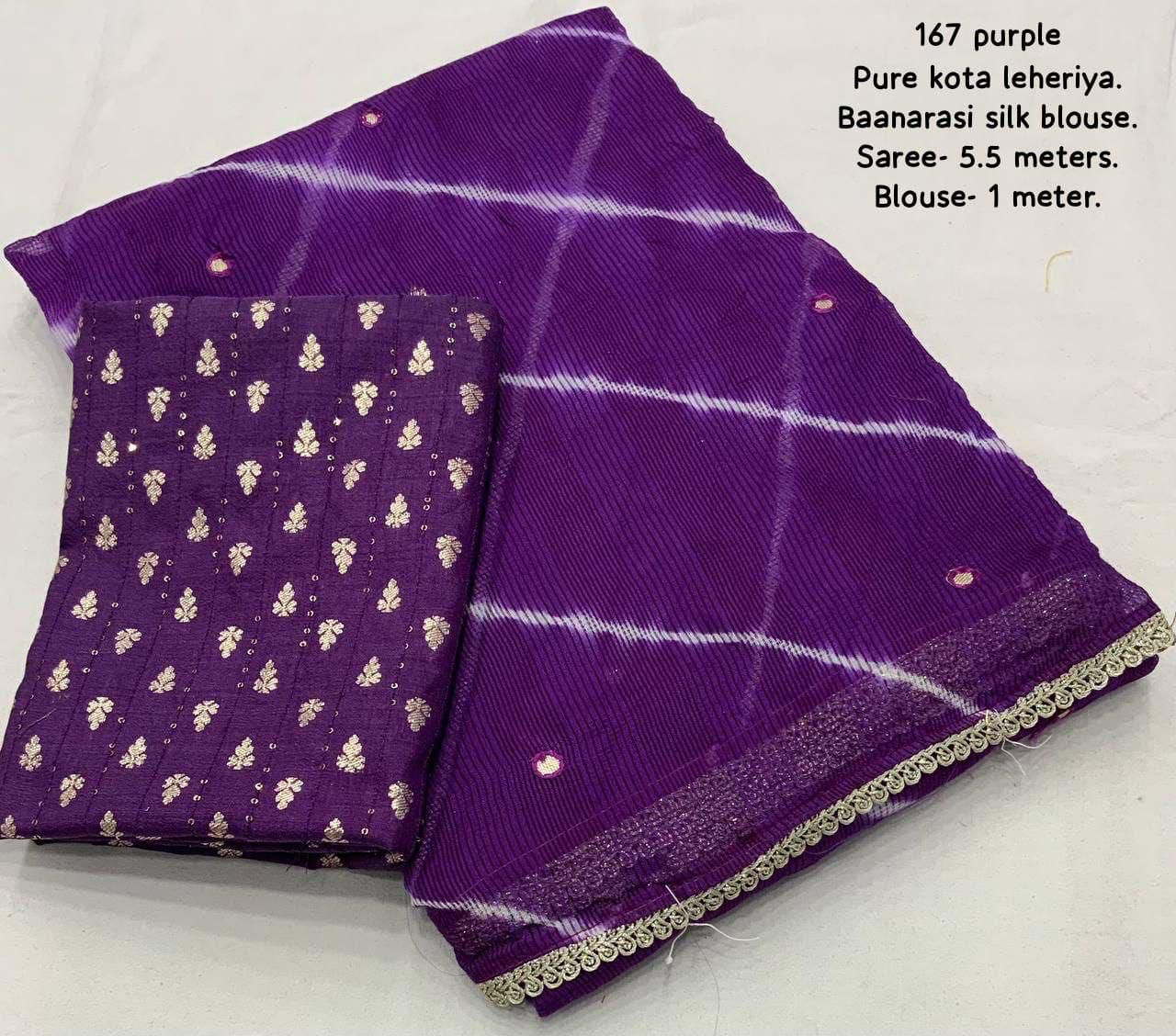 Embrace timeless Rajasthani elegance with this pure Kota saree featuring vibrant leheriya tie & dye patterns. Crafted with finesse, the saree is accentuated by Aari work patches and a graceful lace border, making it ideal for festive and ethnic occasions.