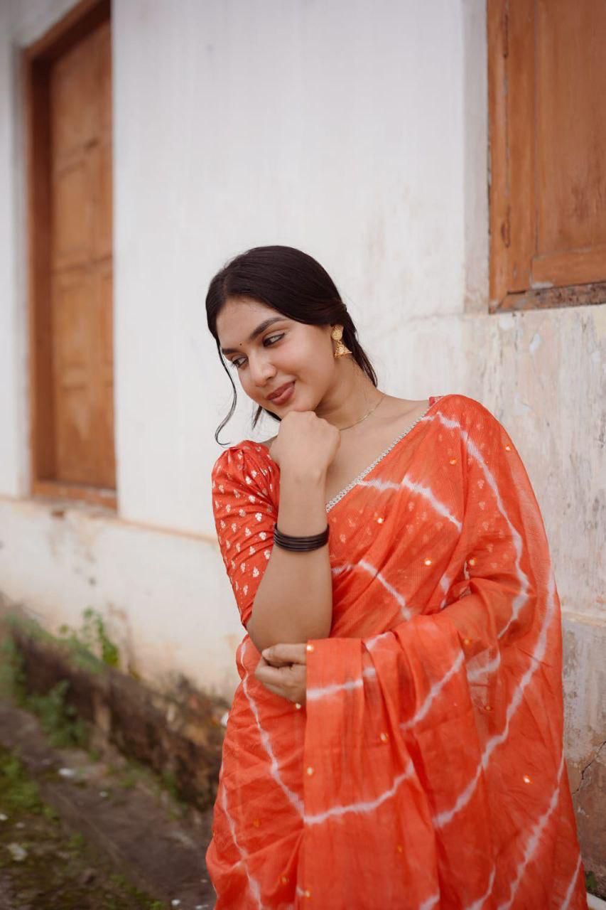 Paired with a 1-meter matching Banarasi silk blouse in coordinating tie & dye style, designed to elevate the overall look.