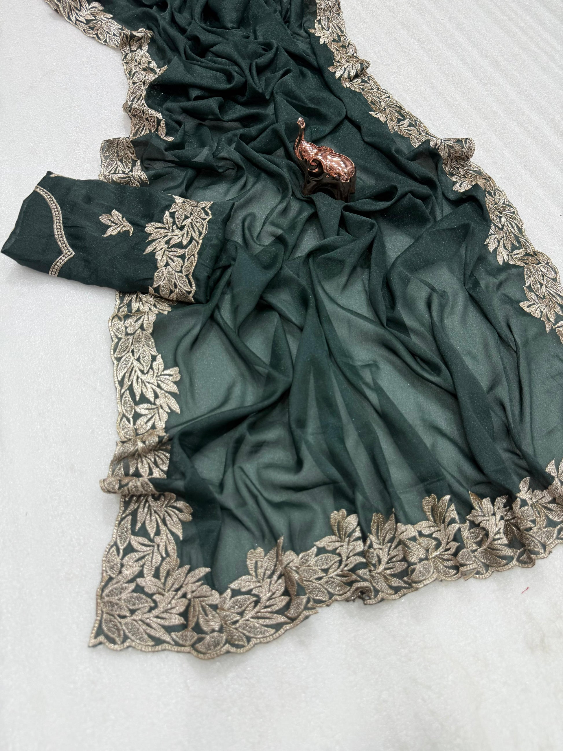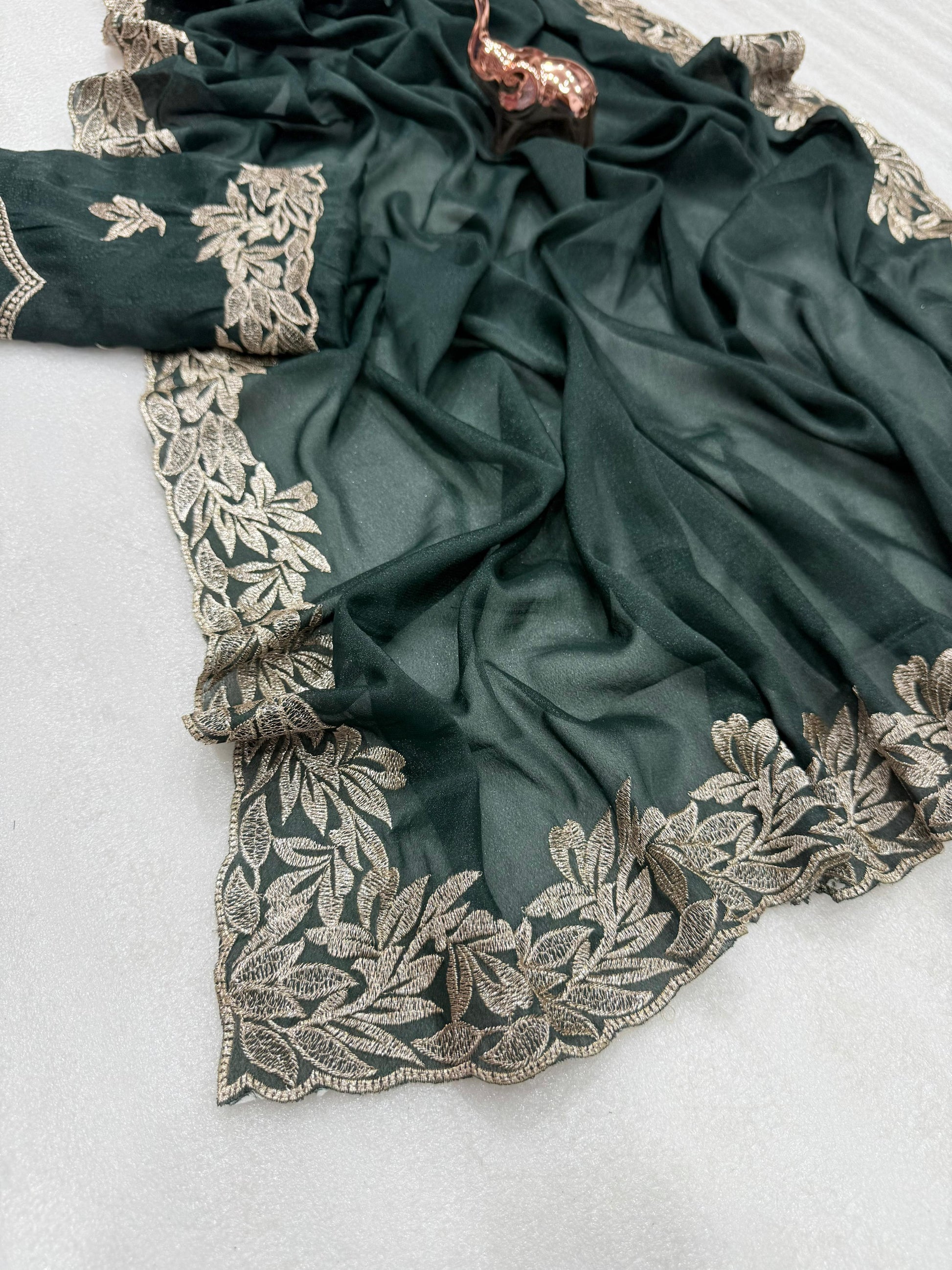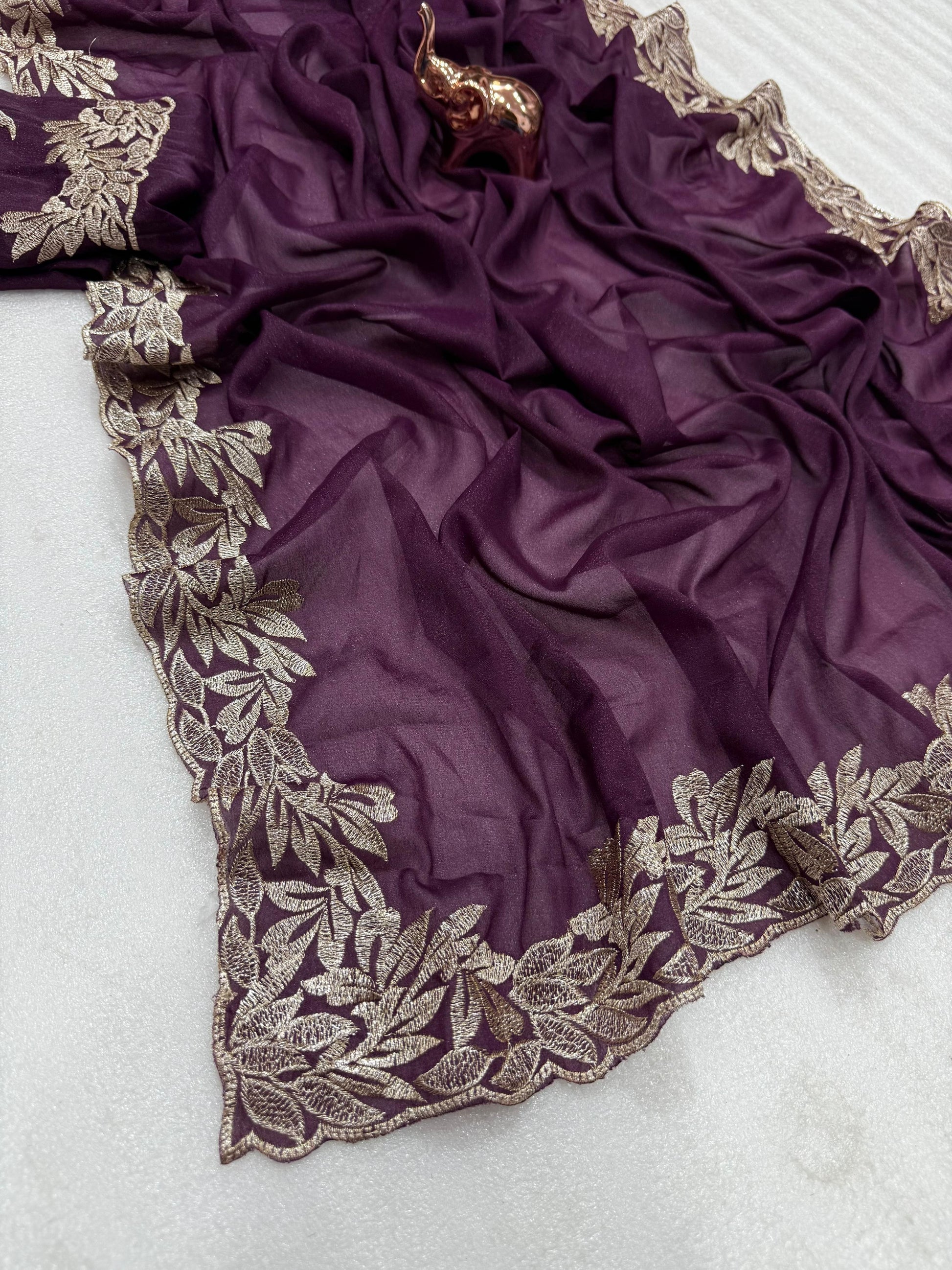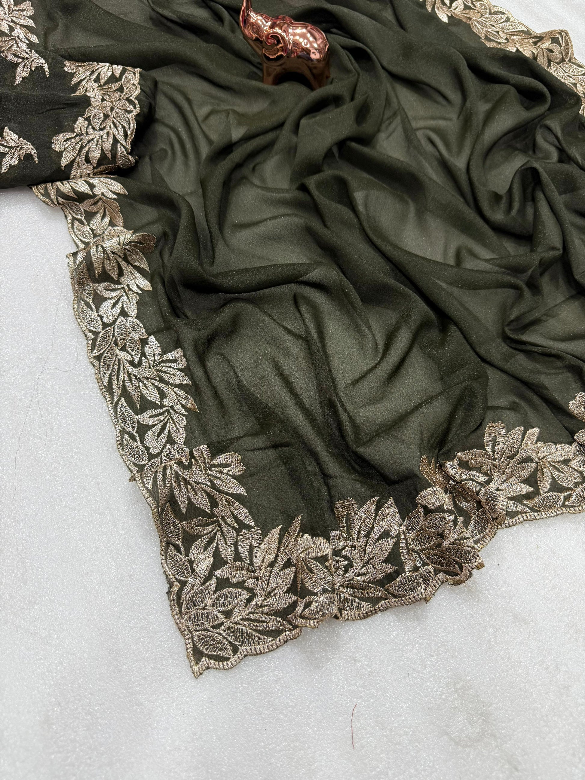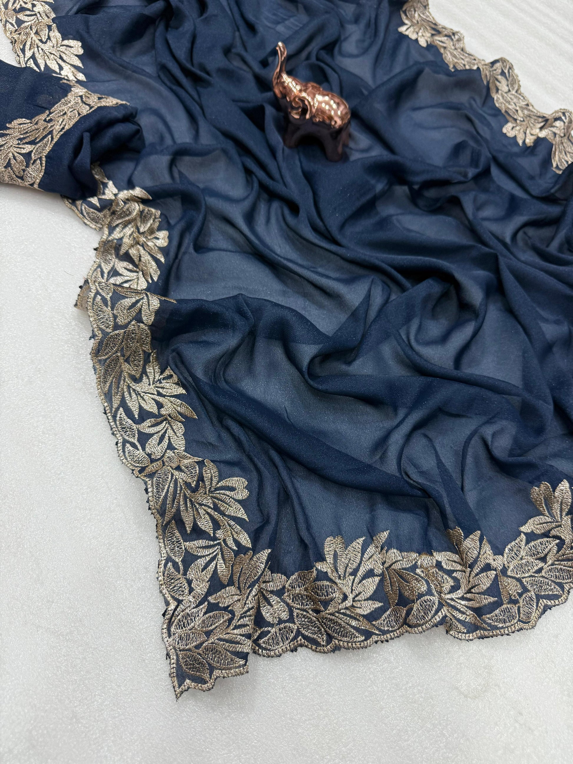 Drape yourself in luxury with this Star Georgette Saree, highlighted by intricate designer embroidery and shimmering jari work across the fabric. The elegant C-pallu cut-work border adds a statement finish, perfect for festive and party occasions.
