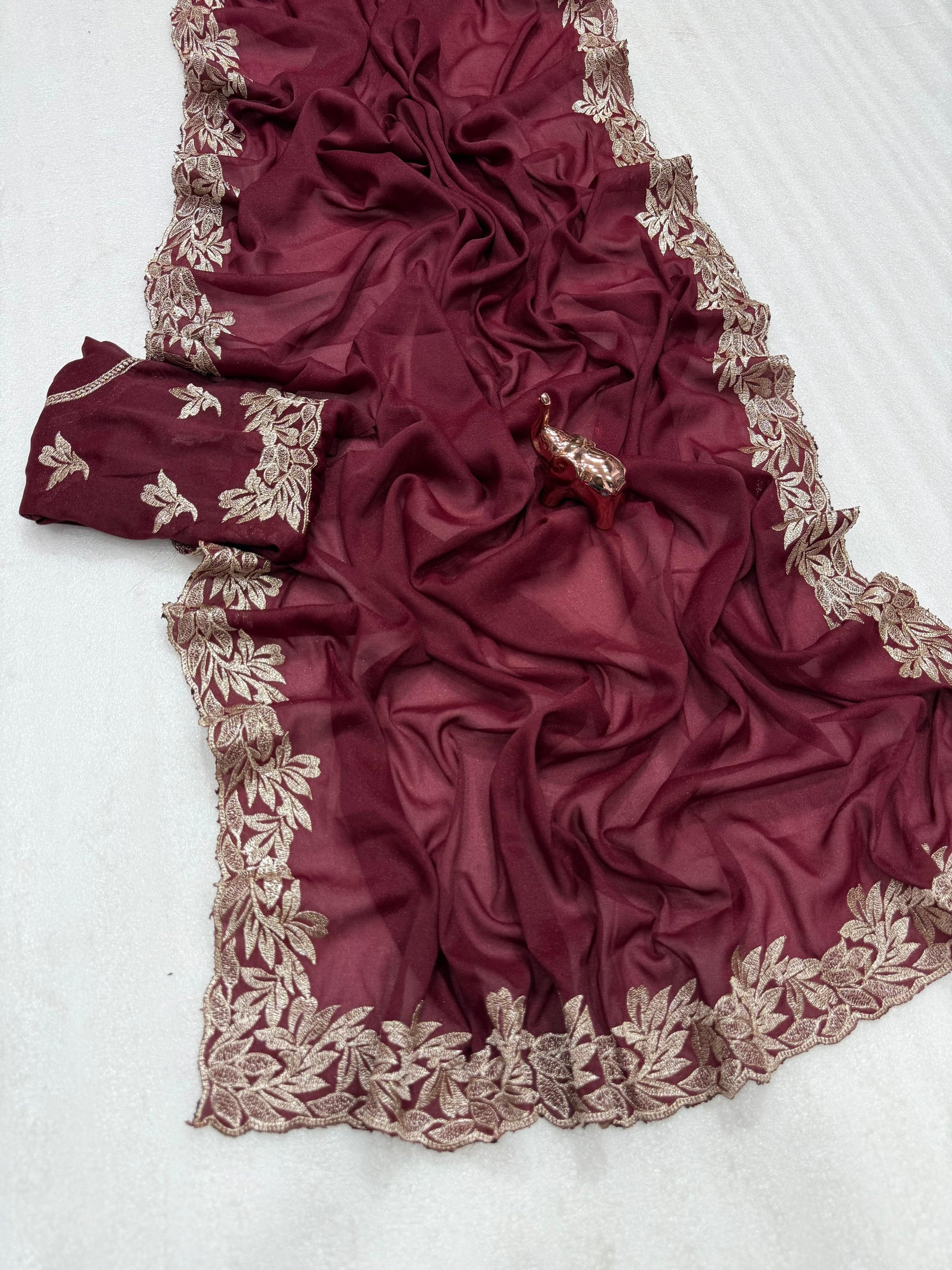 Star Georgette Saree with Designer Embroidery, Jari Work C-Pallu & Heavy Work Blouse – 5.5 m