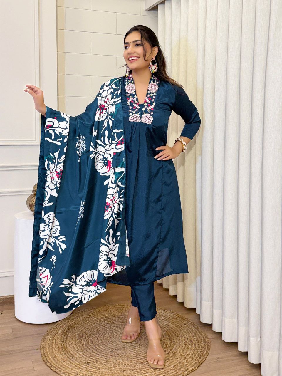 Designer Rashmika Embroidery Work Chinnon V-neck