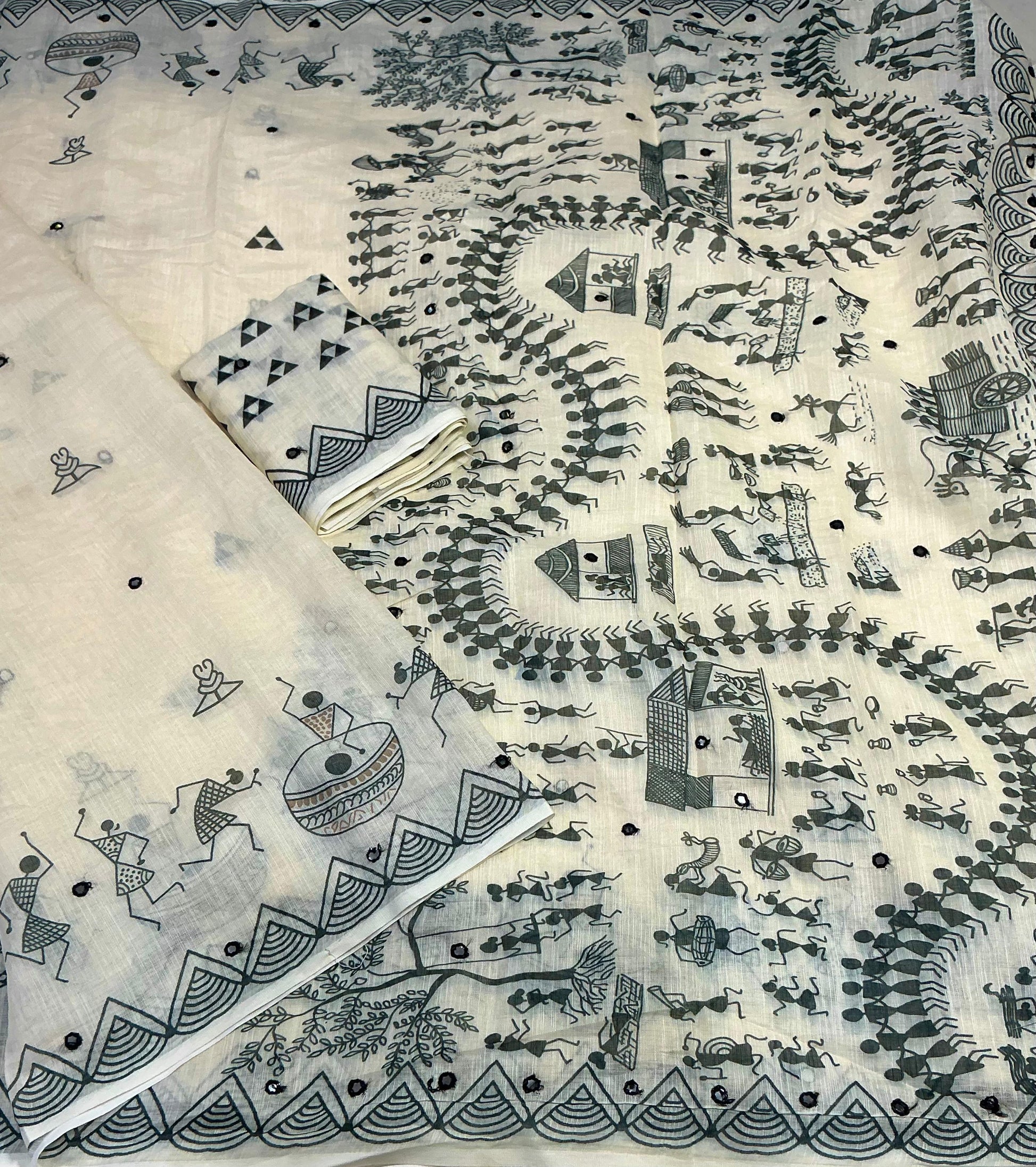 Coordinated Blouse: Running linen blouse piece with matching mirror-work prints for a complete look.