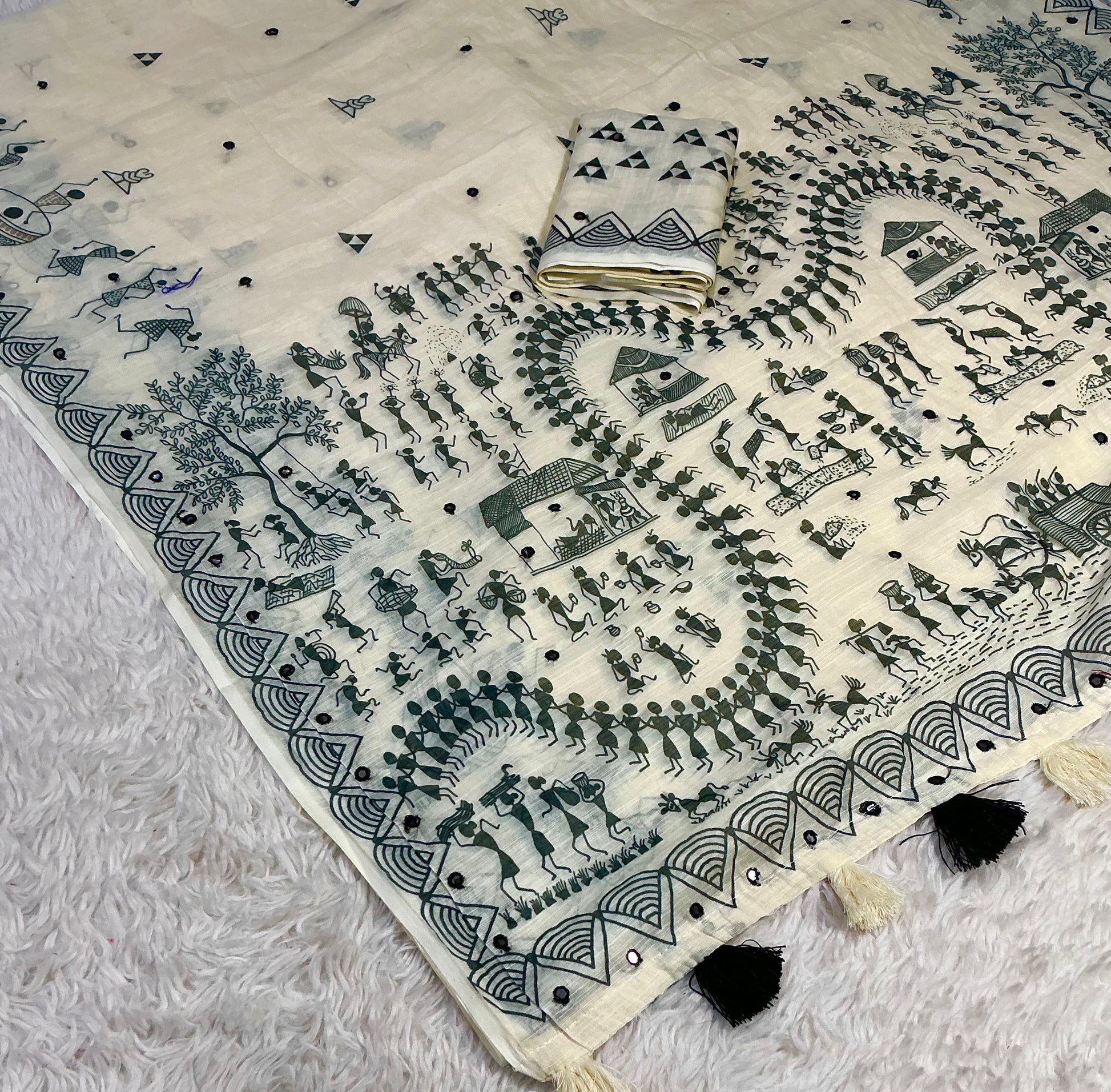 This handmade mirror work linen saree combines traditional Indian craftsmanship with a sophisticated color palette, making it ideal for festive gatherings, office parties, or intimate functions.