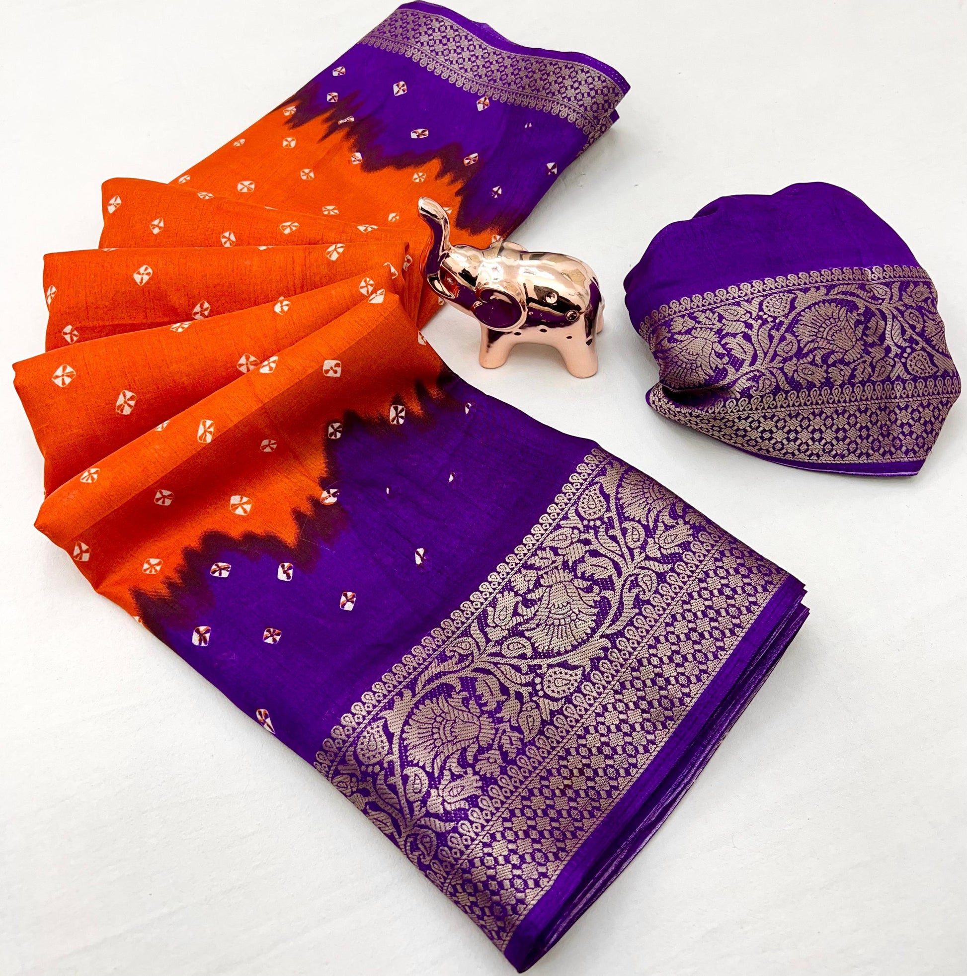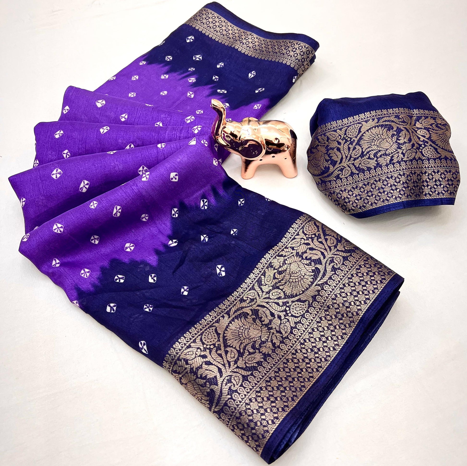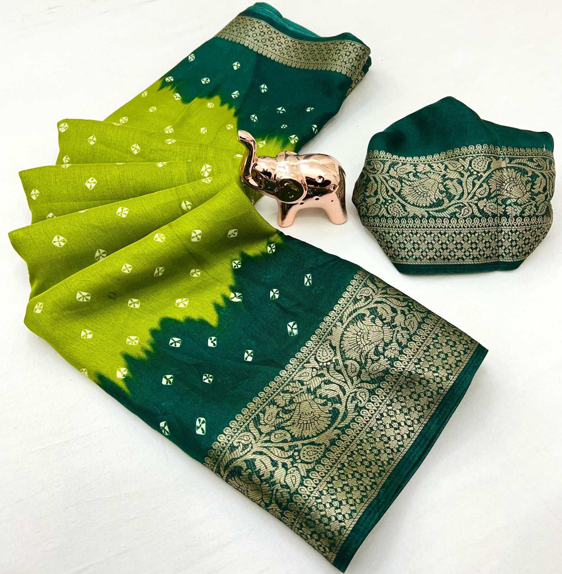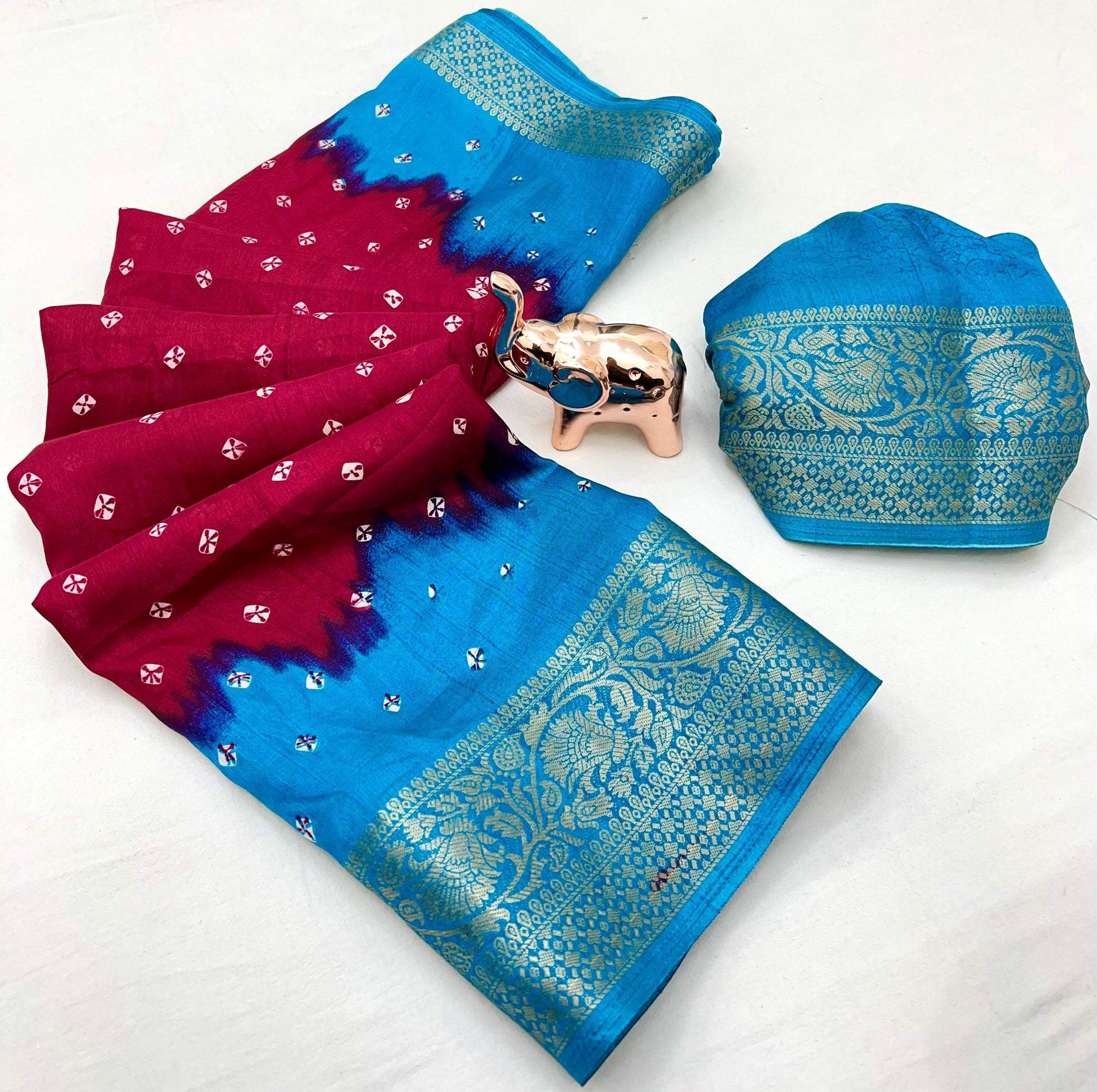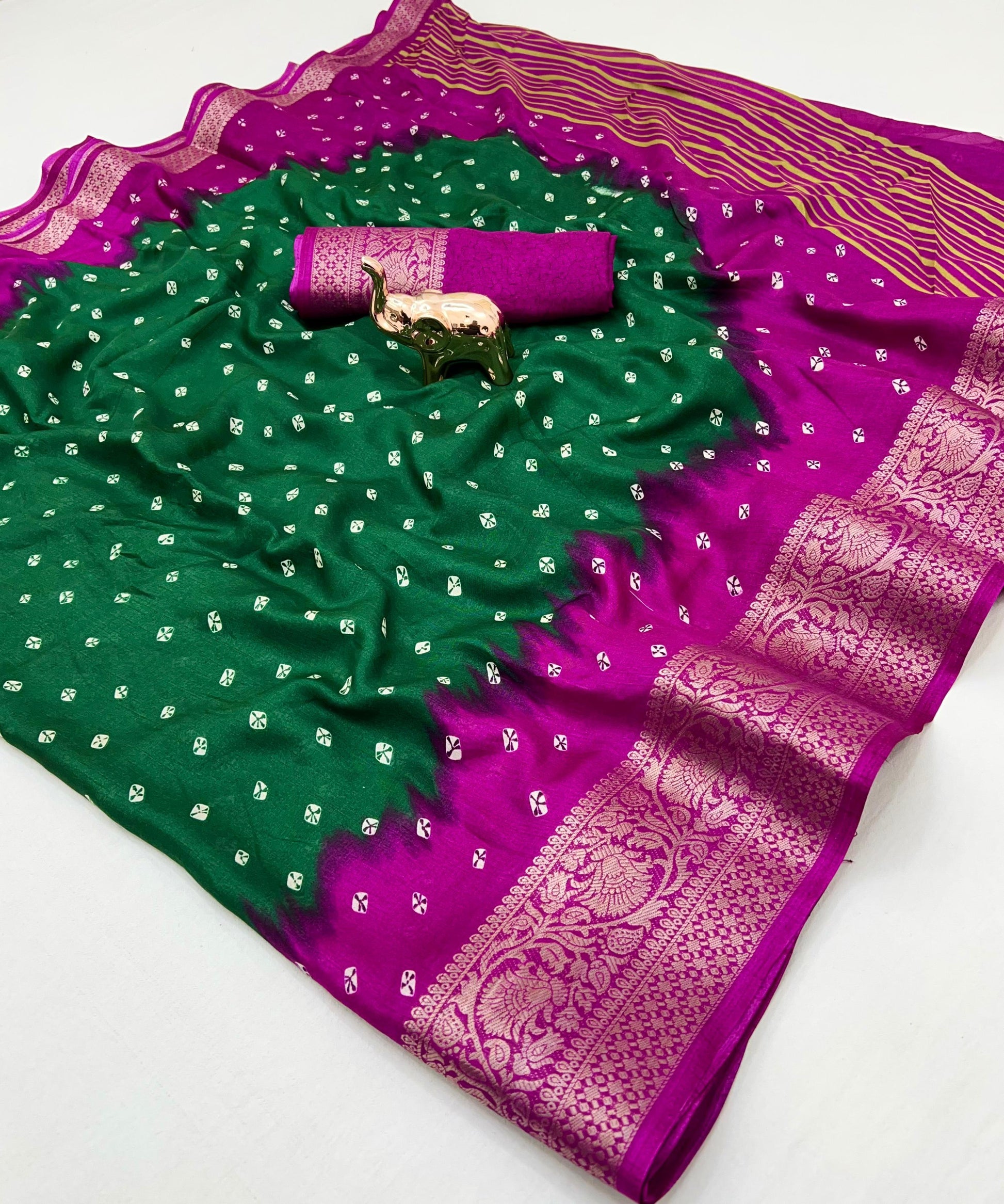 Soft Dola Silk Bandhani Print Saree with Jacquard Woven Border – Elegant Traditional Wear | Swaraas.in