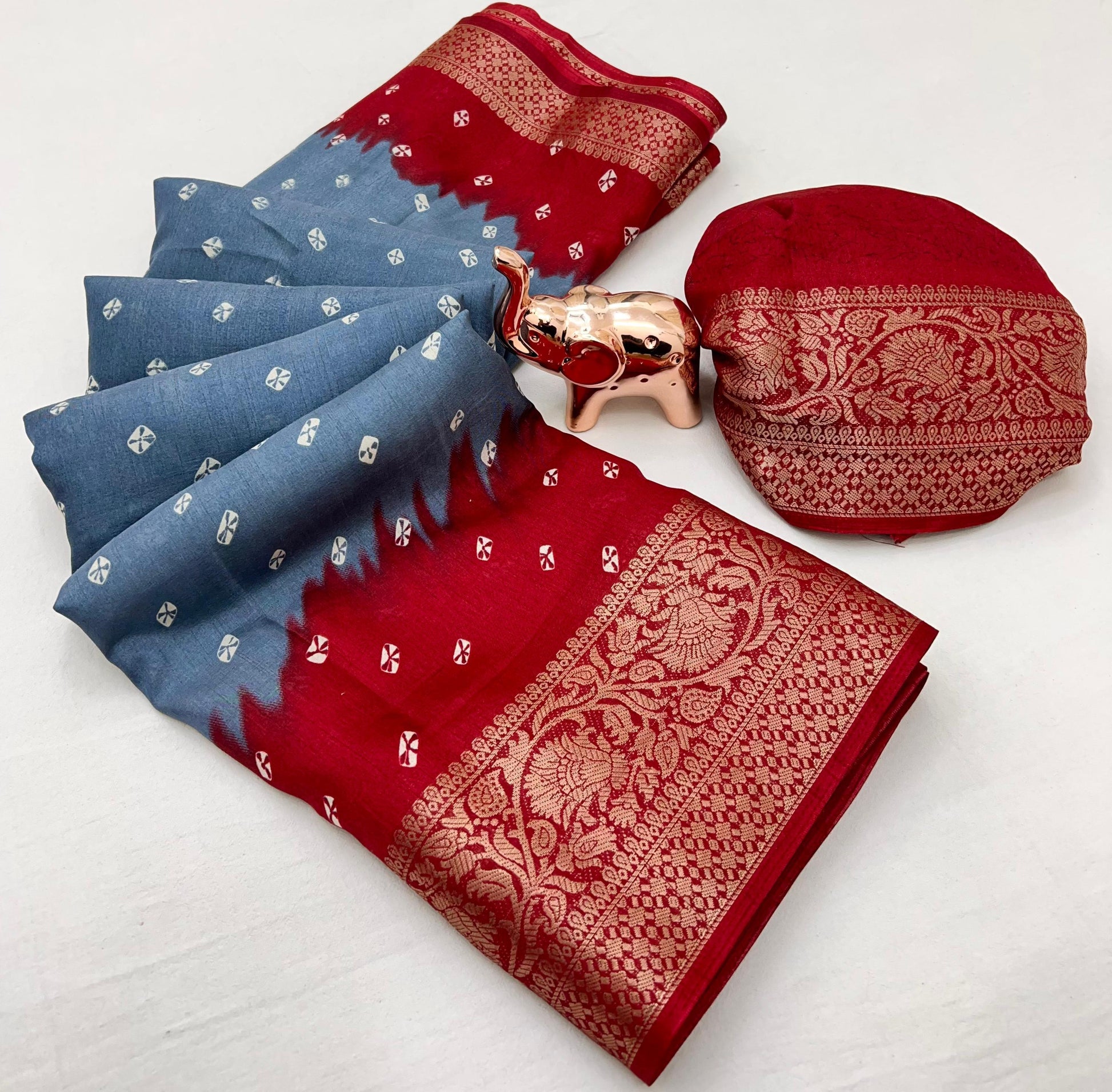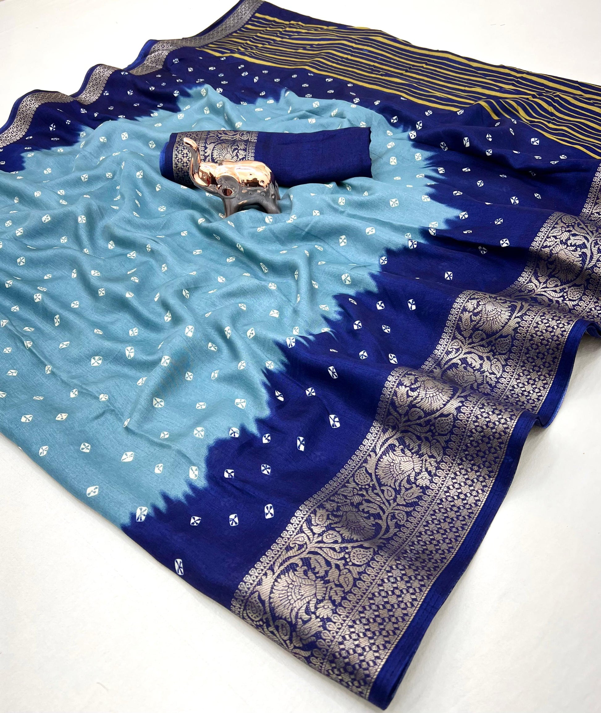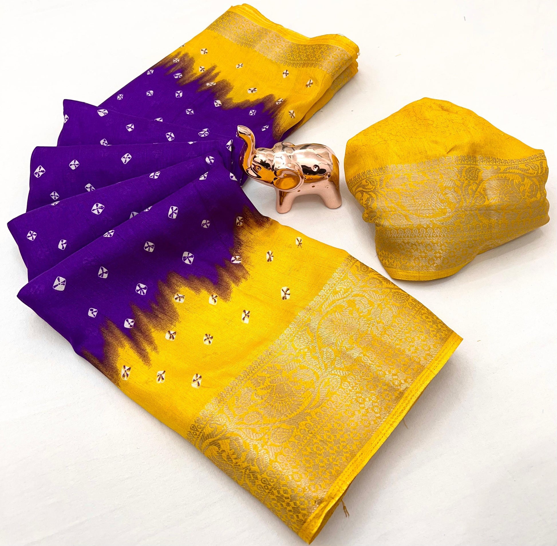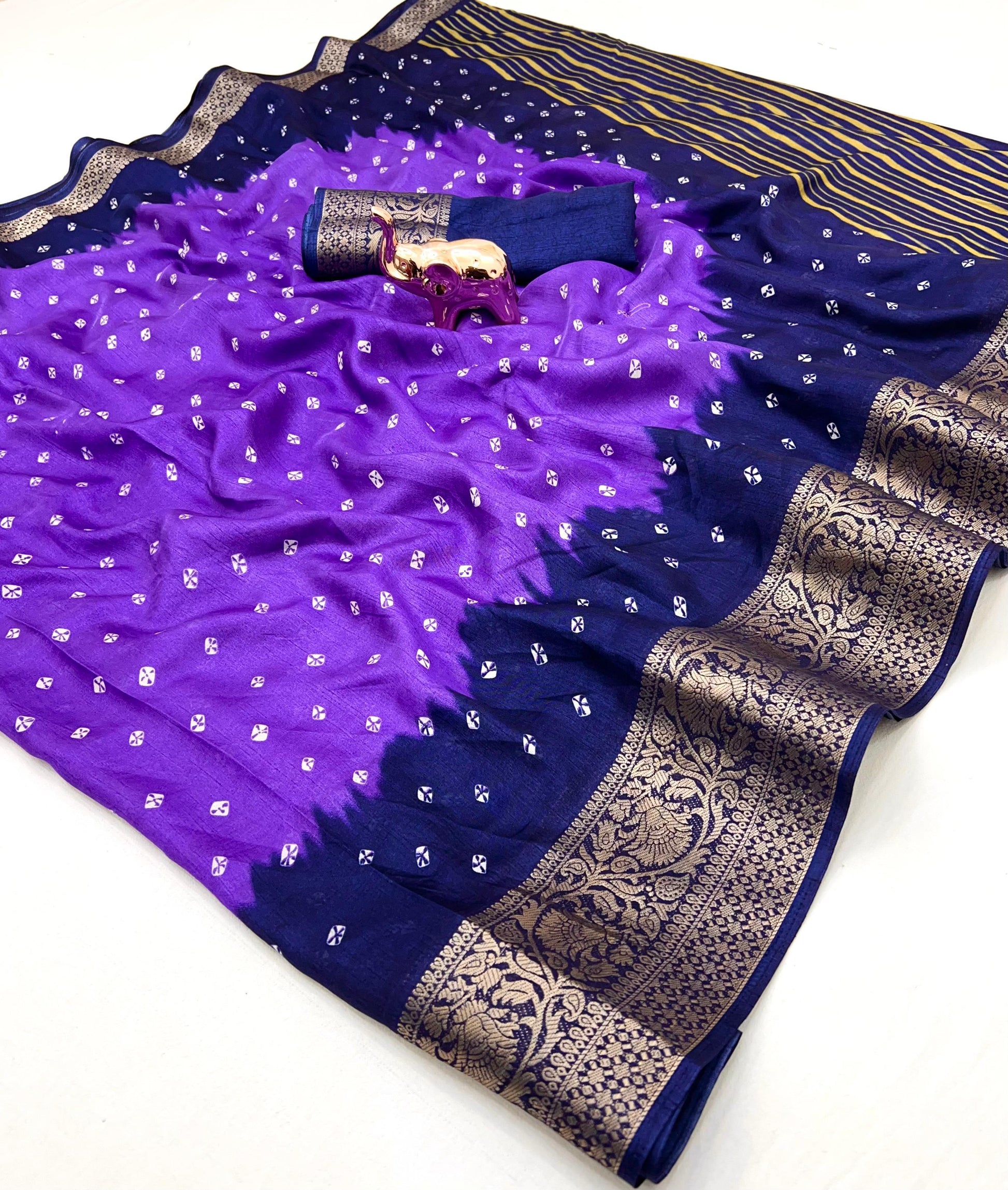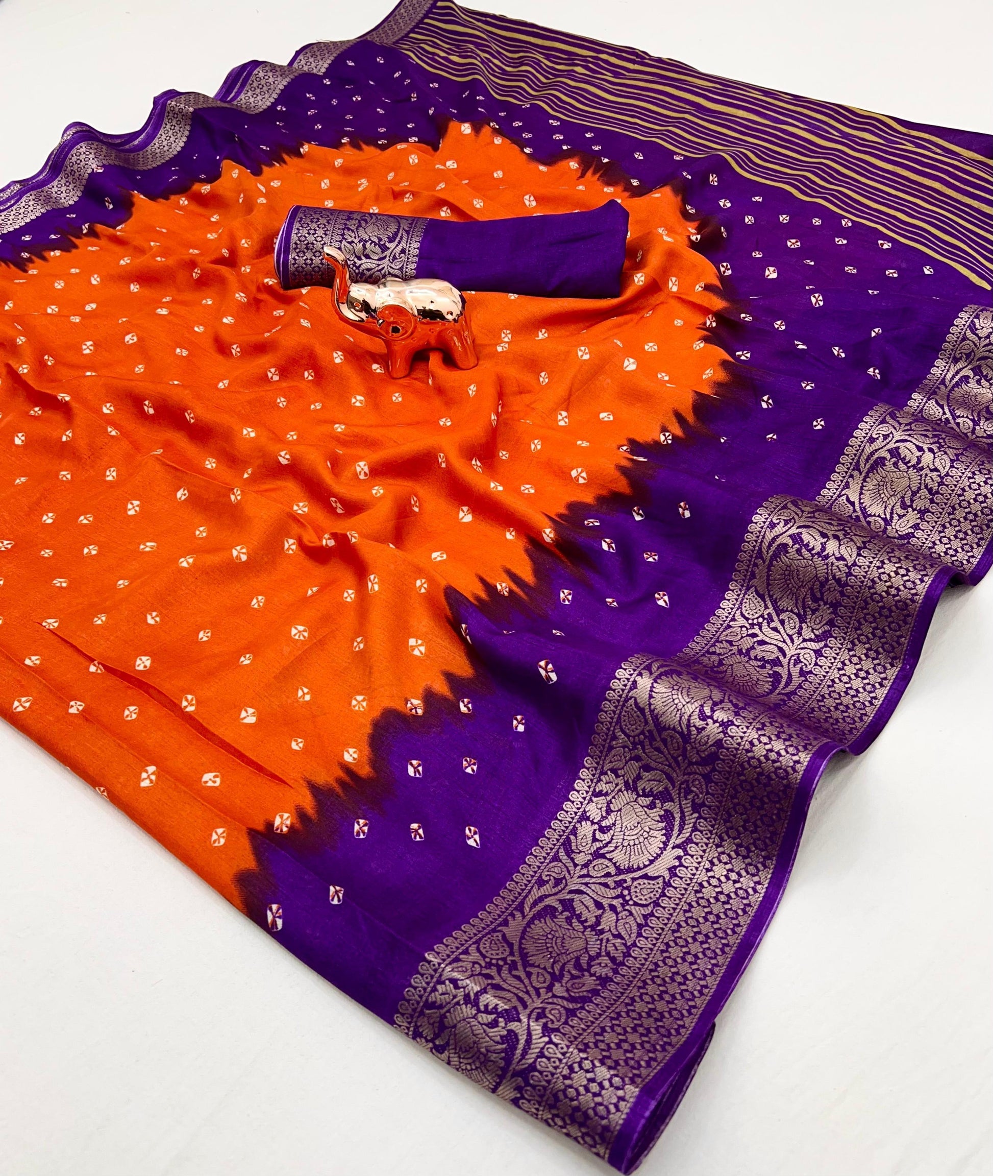 Soft Dola Silk Bandhani Print Saree with Jacquard Woven Border – Elegant Traditional Wear | Swaraas.in