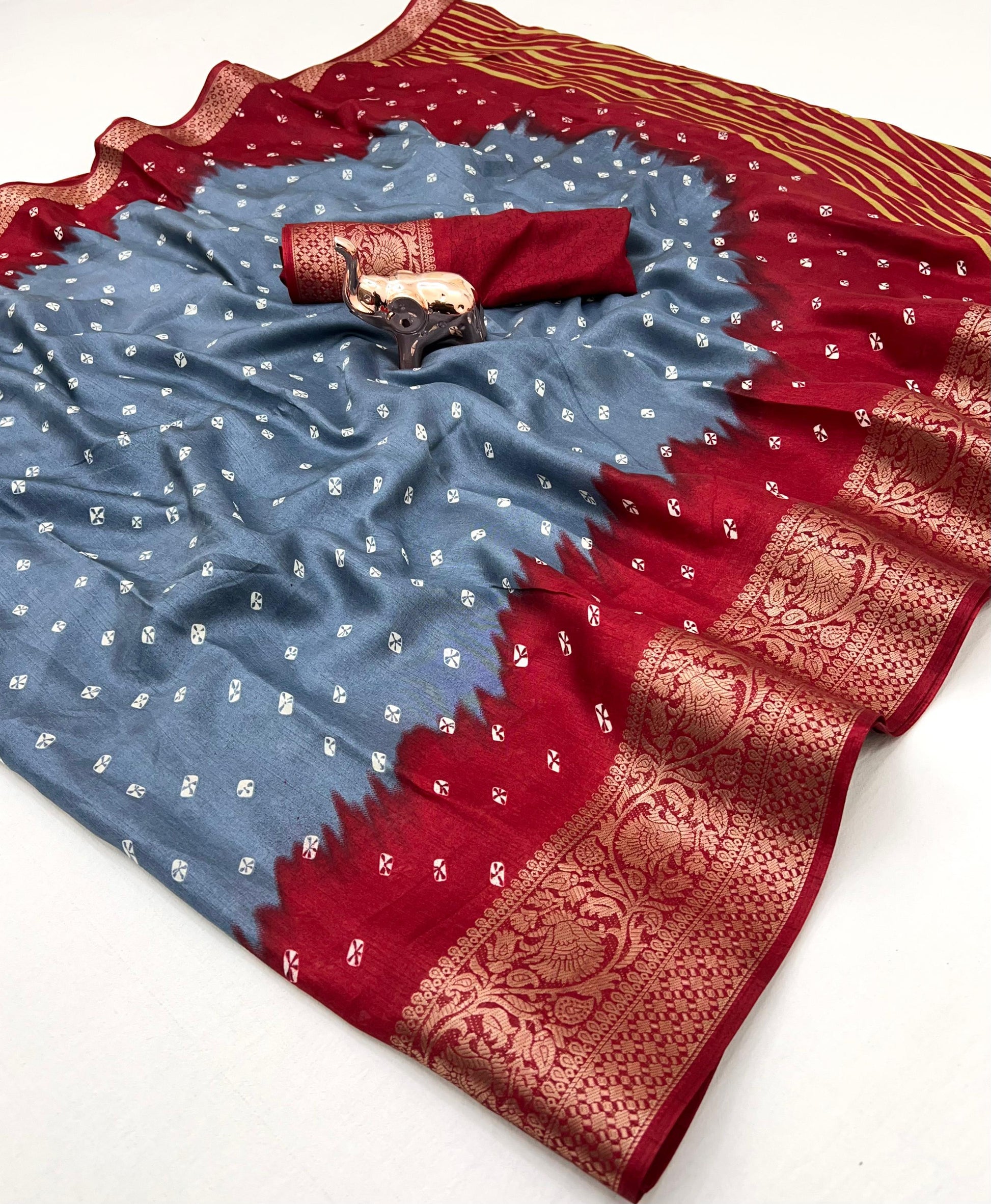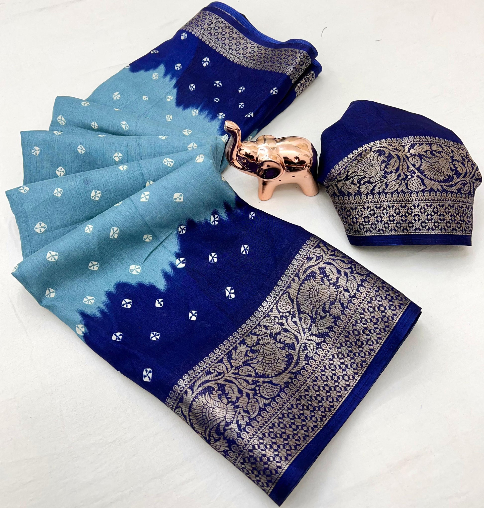 Step into timeless tradition with this soft Dola silk saree, known for its smooth texture and graceful fall. Adorned with a classic Bandhani print, this saree is a perfect blend of heritage and elegance.