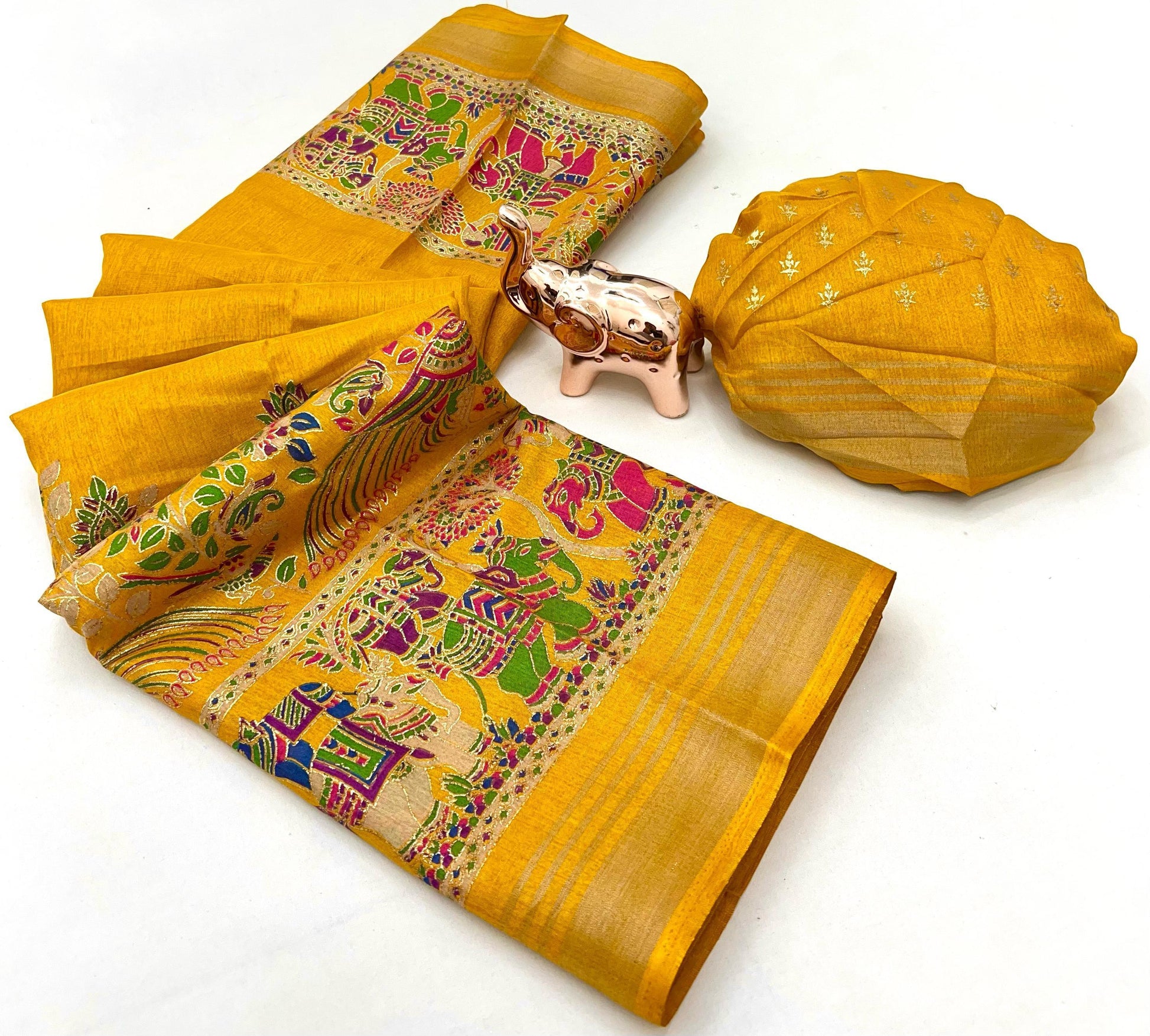 Soft Mul Dolla Saree with Elegant Foil Print & Golden Zari Pattu Border – Festive Ready Ethnic Wear | Swaraas.in