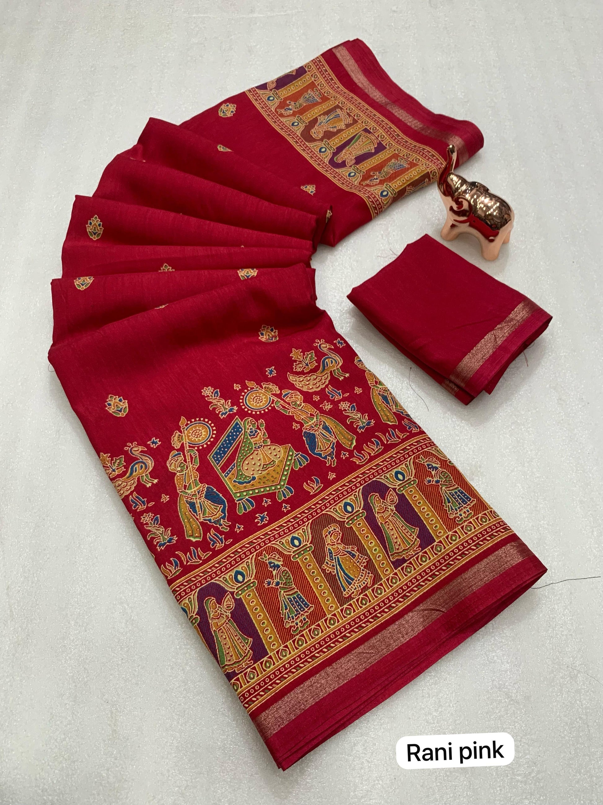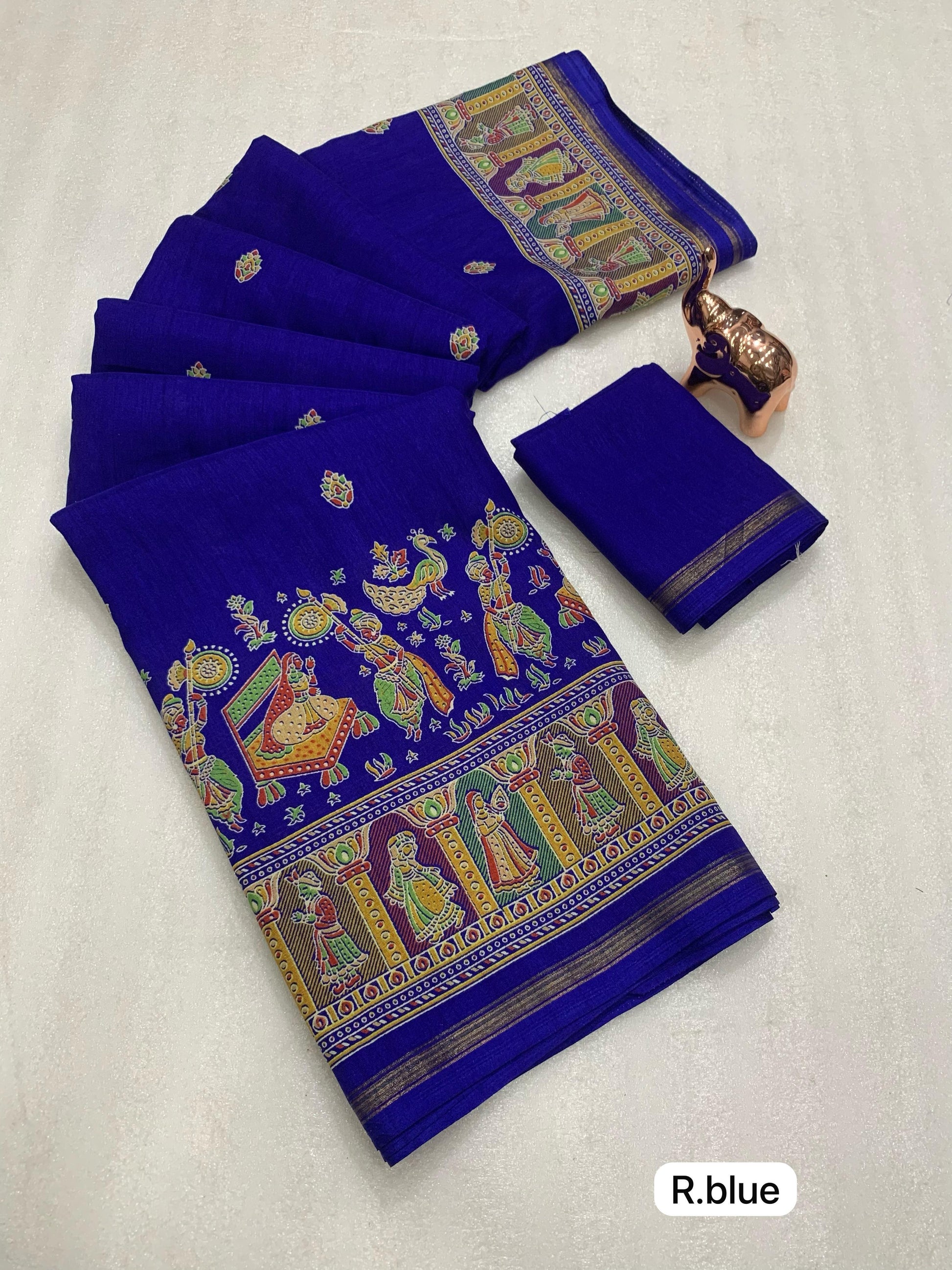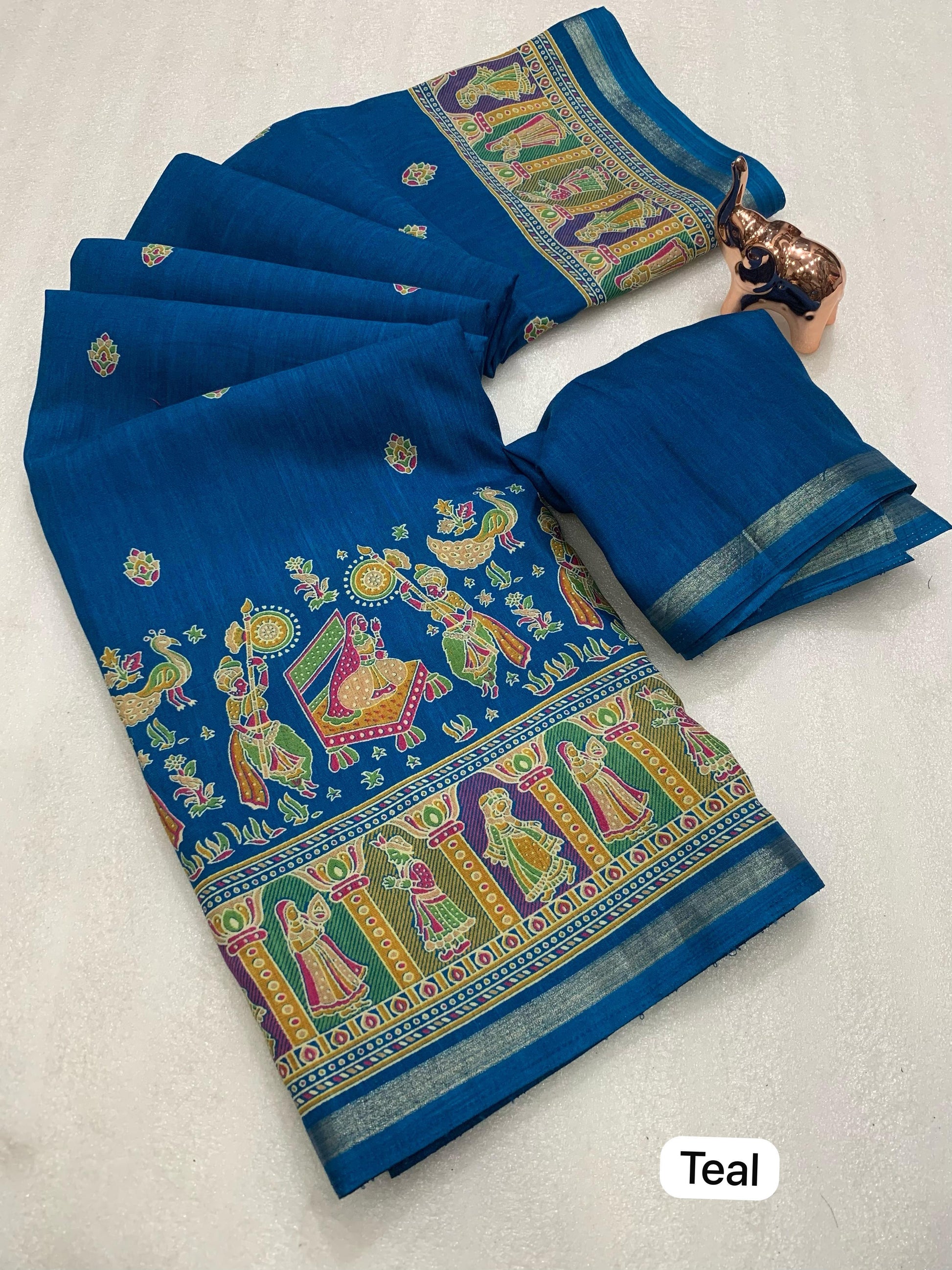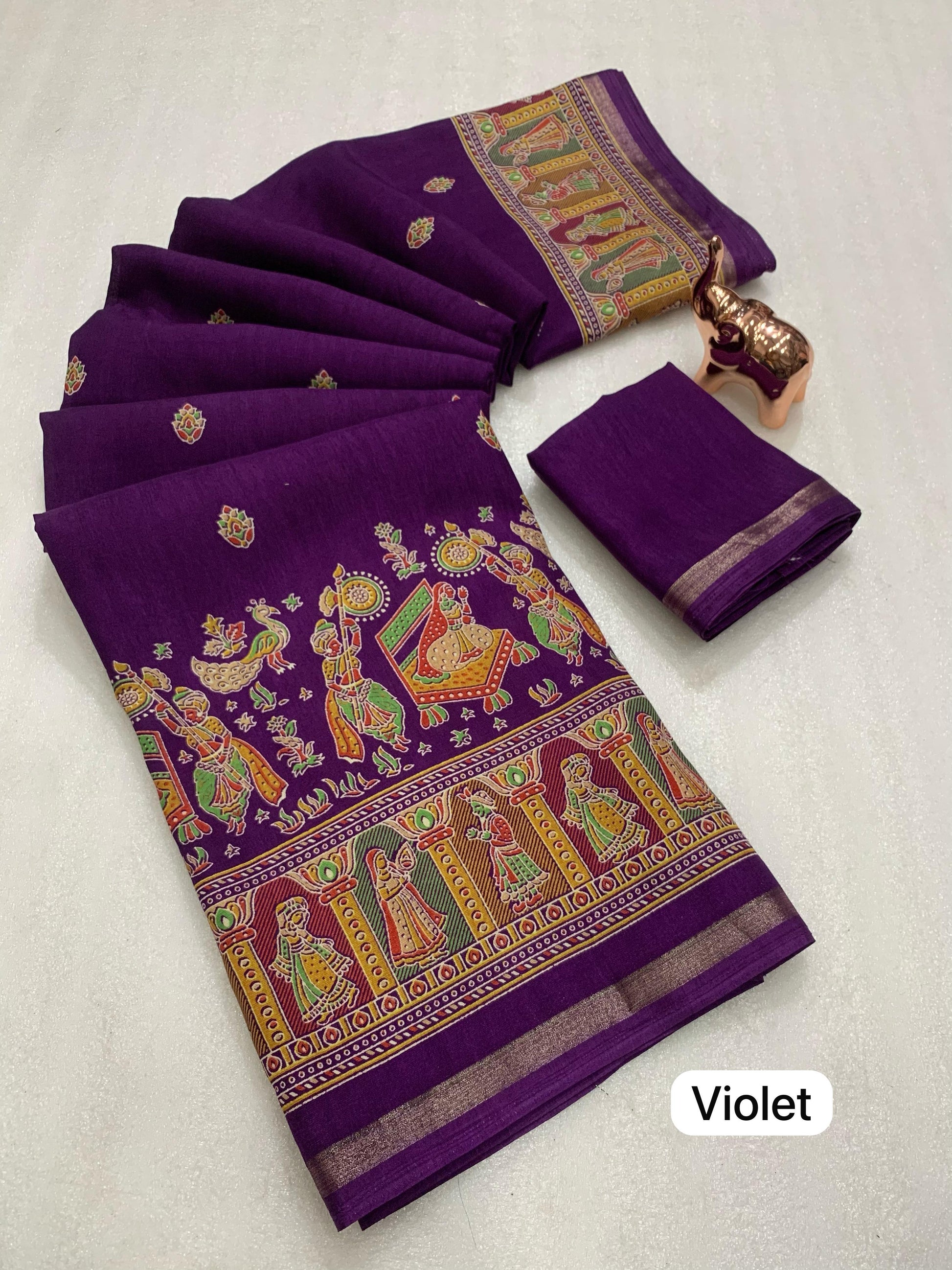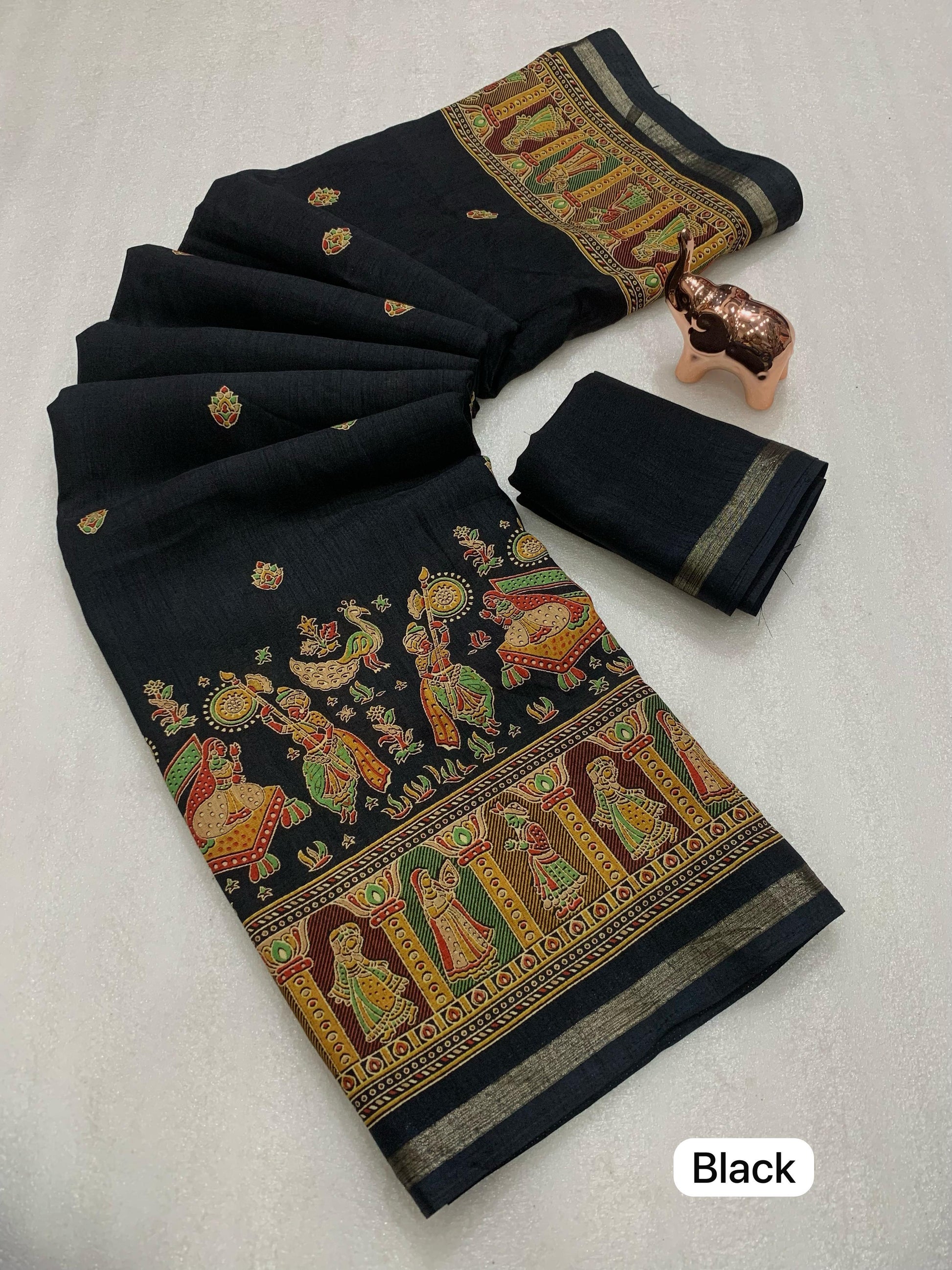 Slight variations in color may occur due to lighting or screen settings. Each saree may carry unique print placements due to fabric cutting.