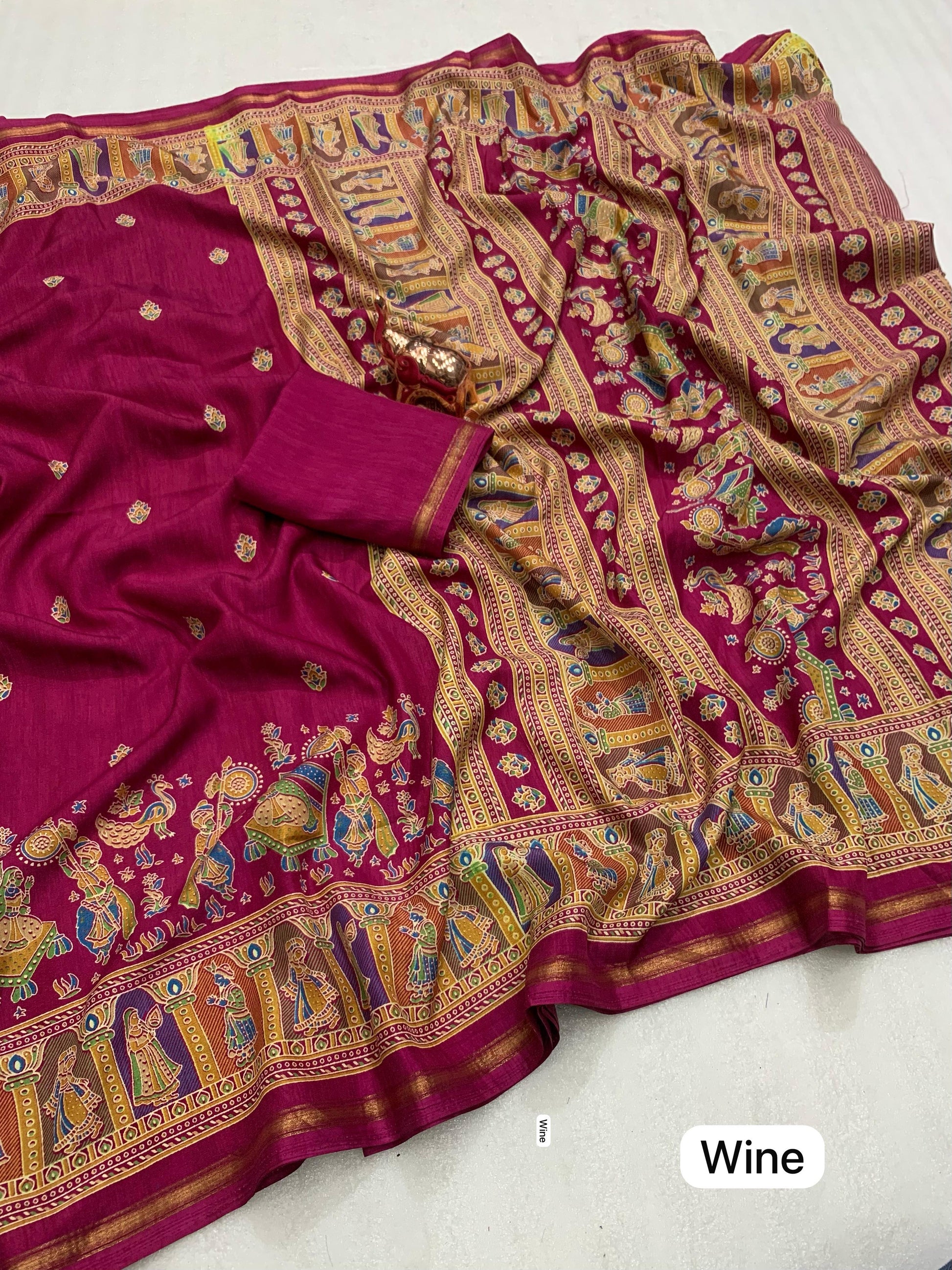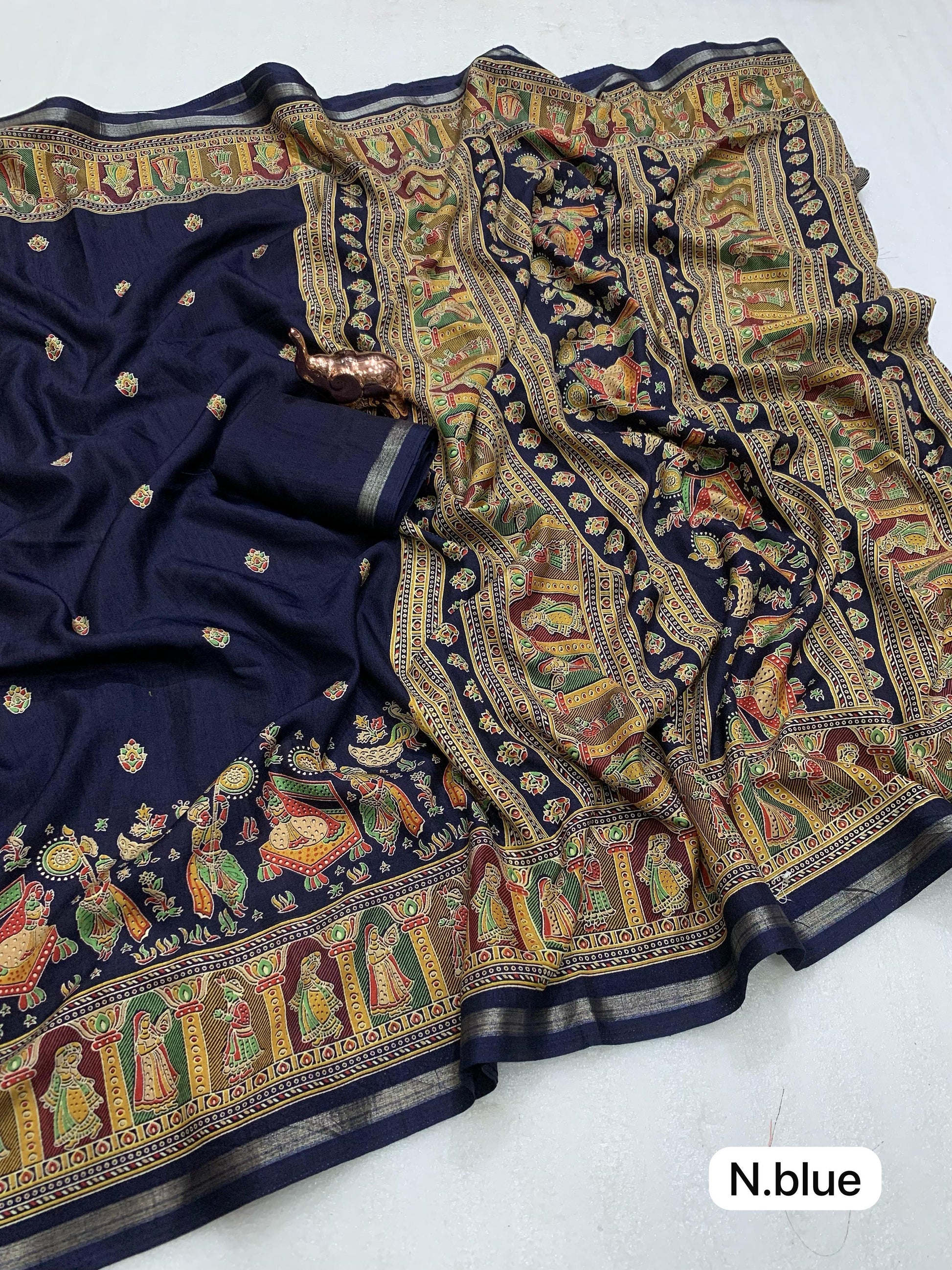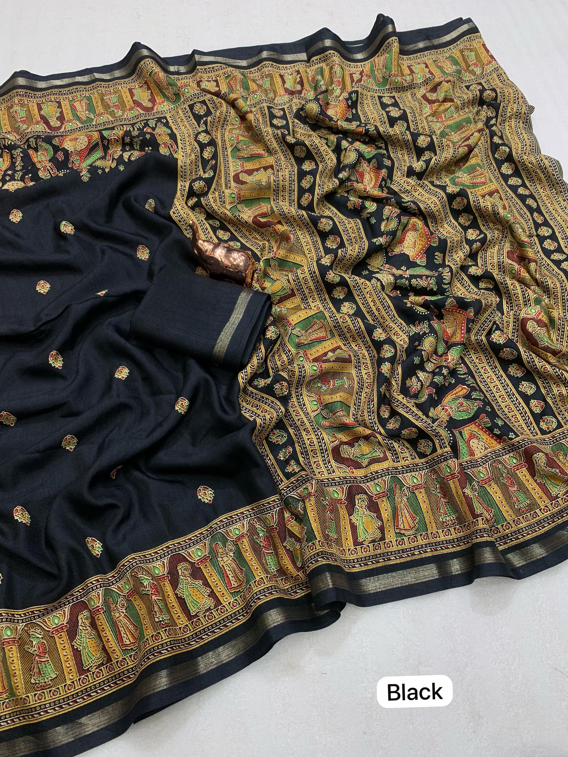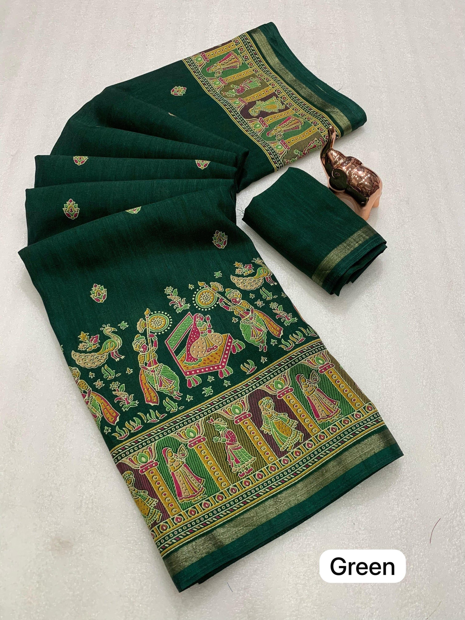 Slight variations in color may occur due to lighting or screen settings. Each saree may carry unique print placements due to fabric cutting.