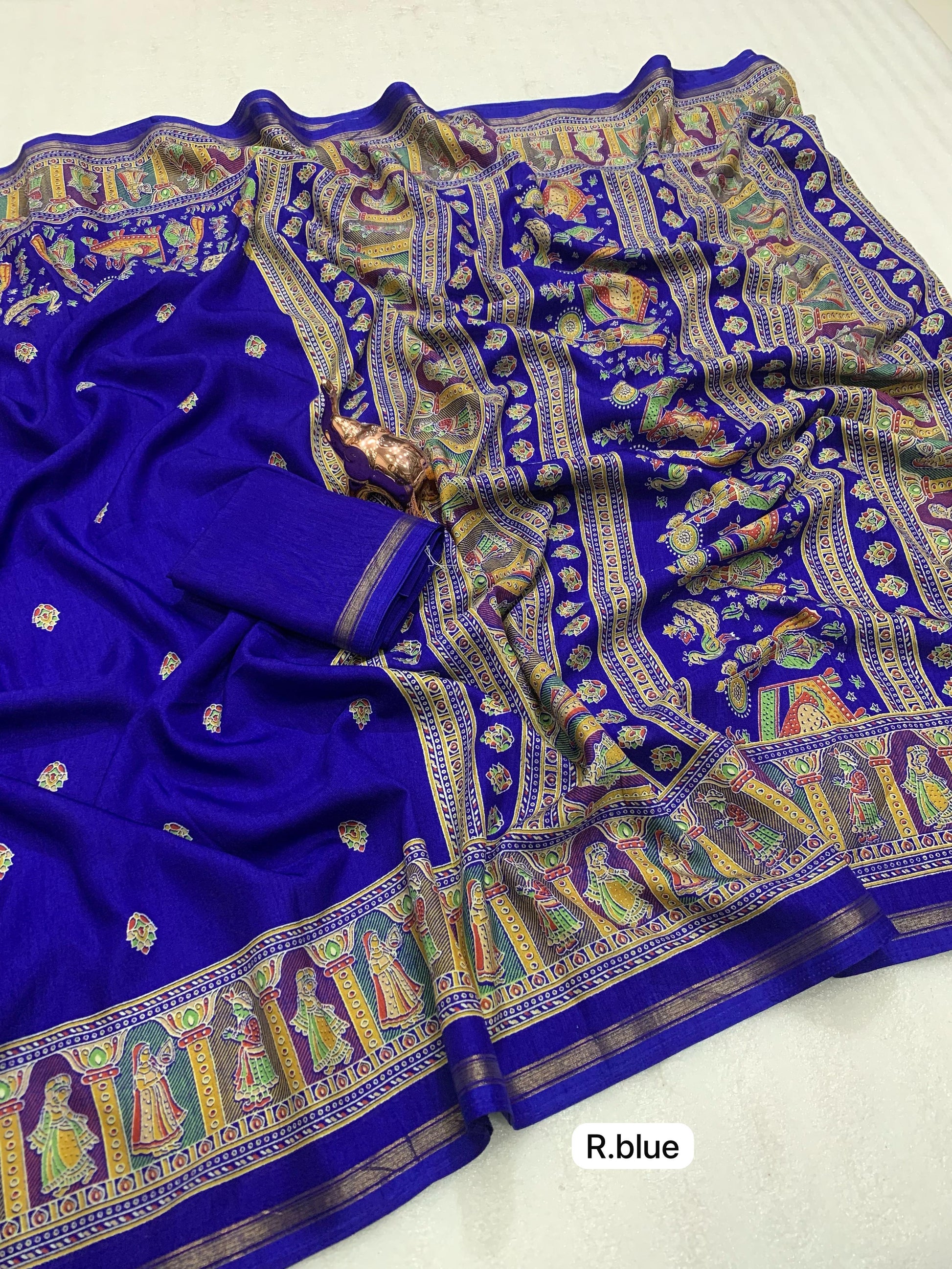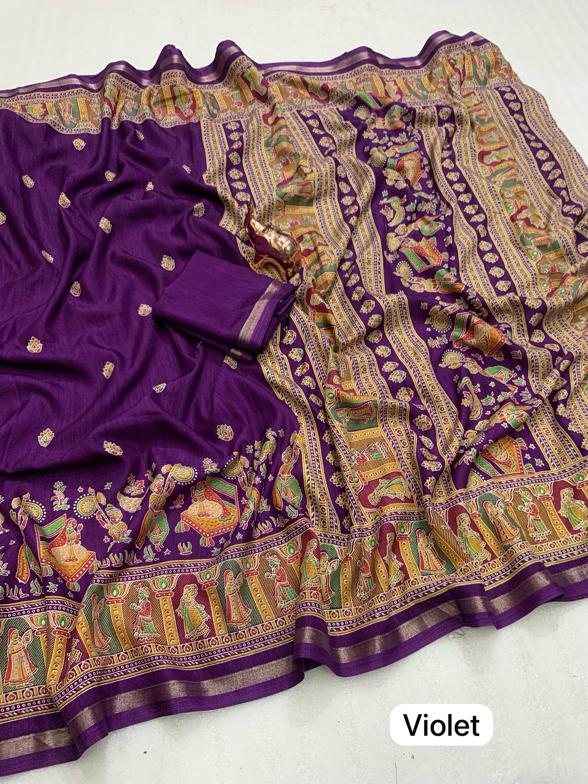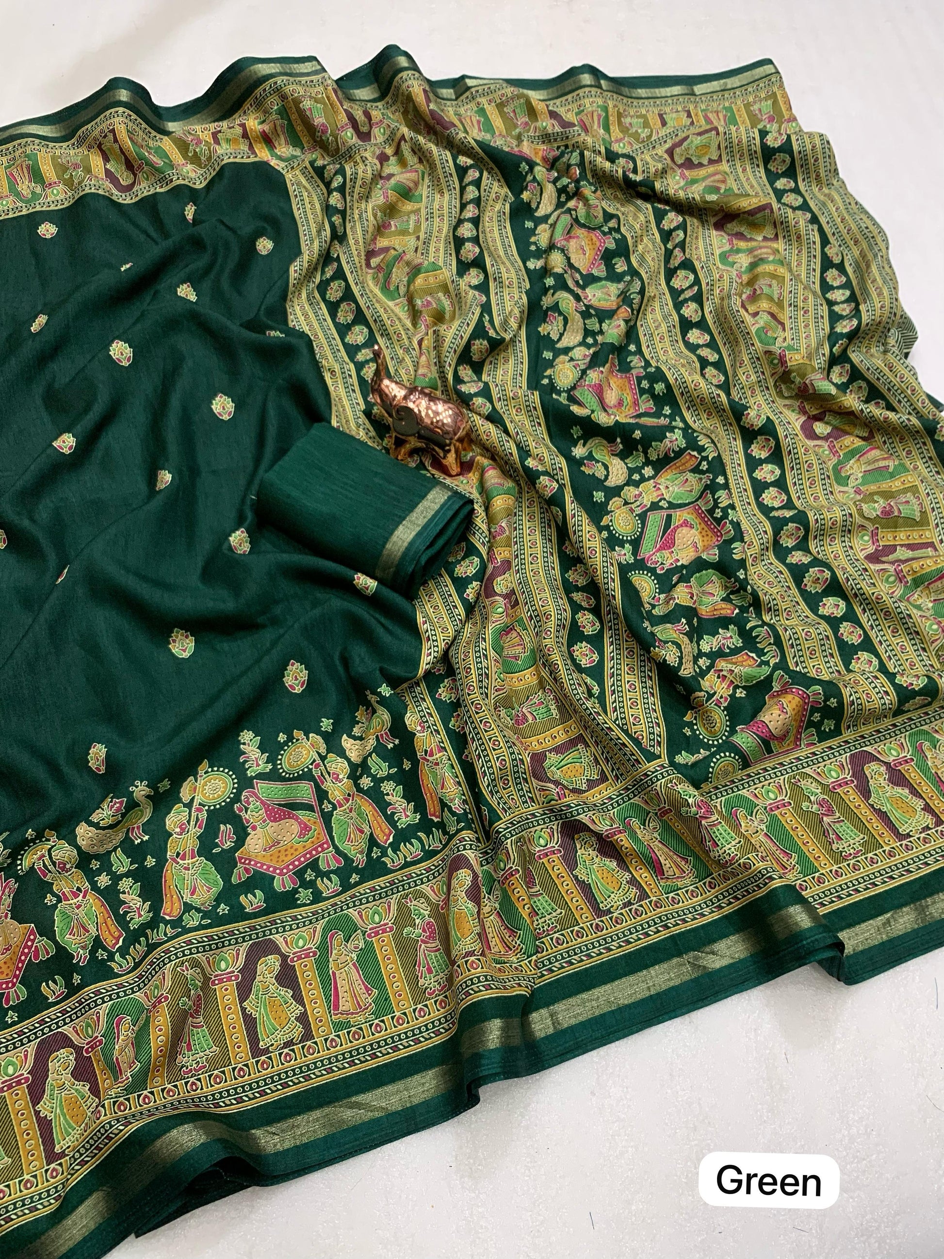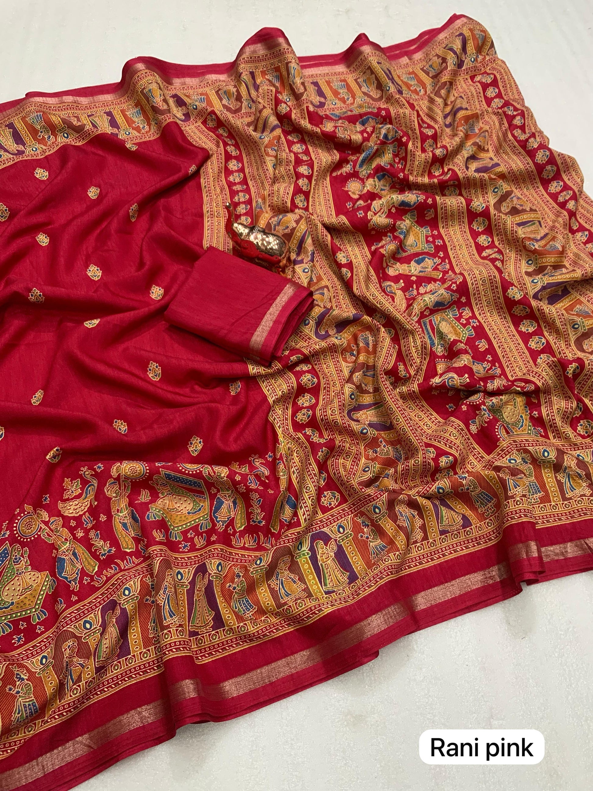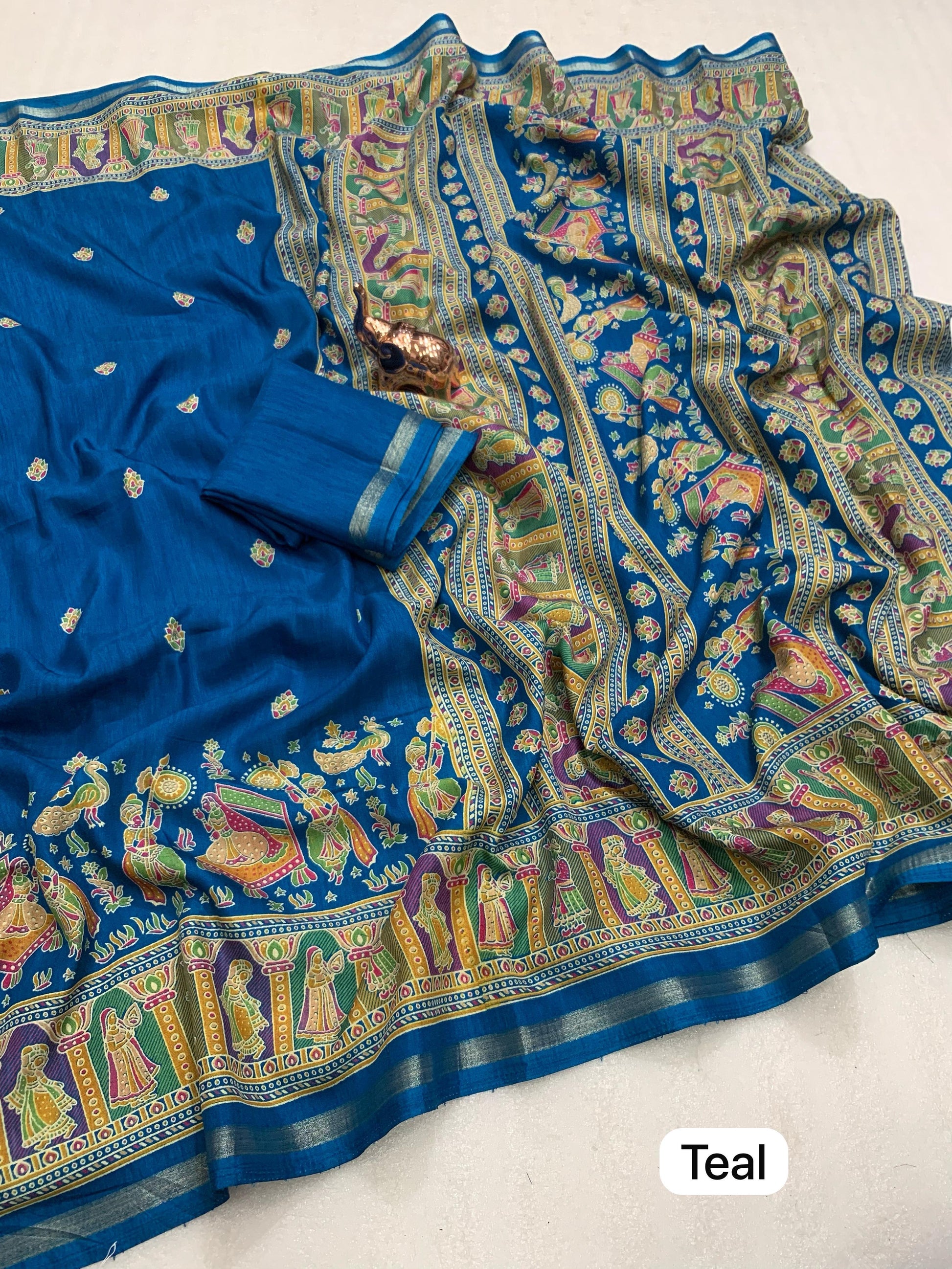 Slight variations in color may occur due to lighting or screen settings. Each saree may carry unique print placements due to fabric cutting.