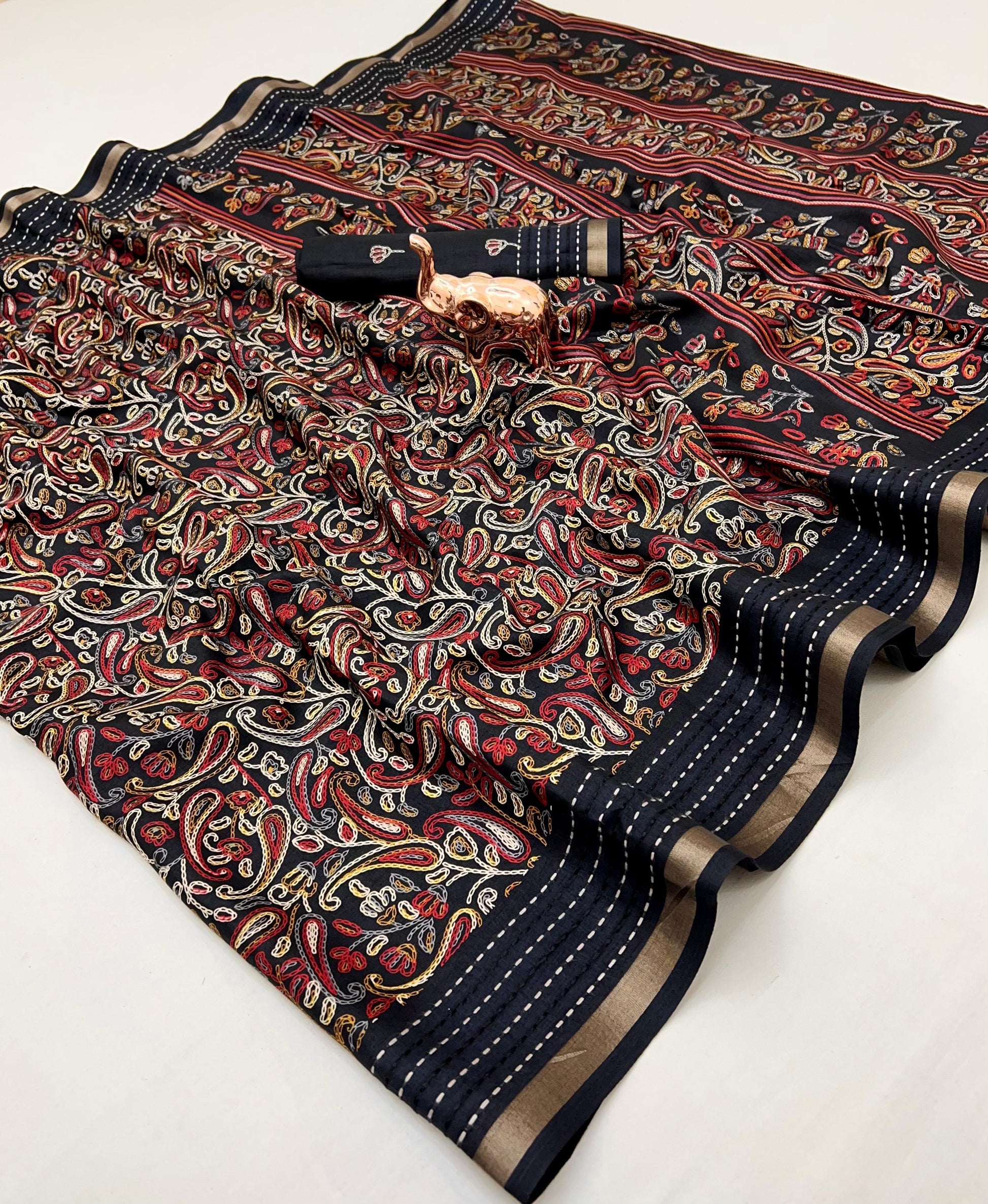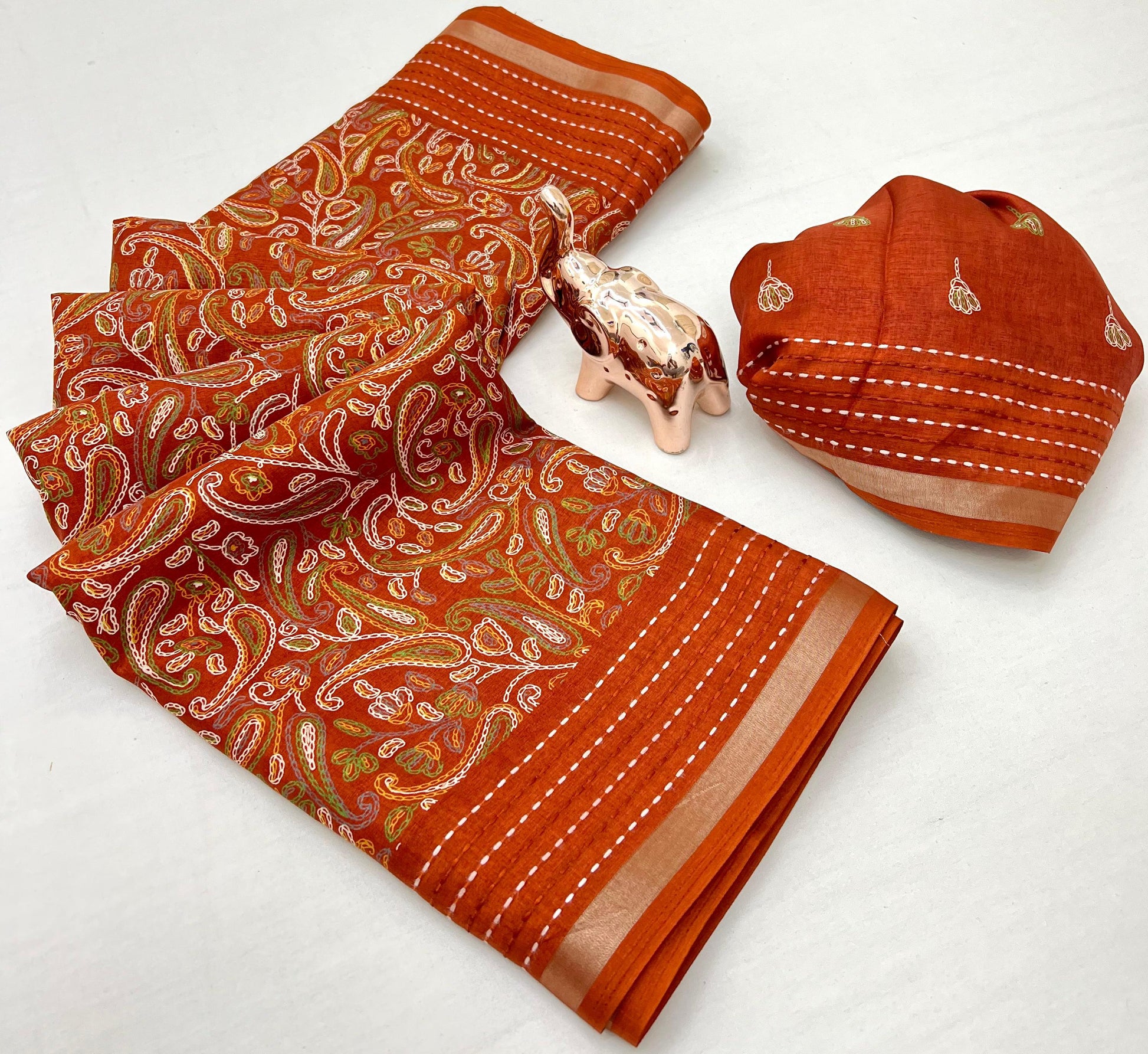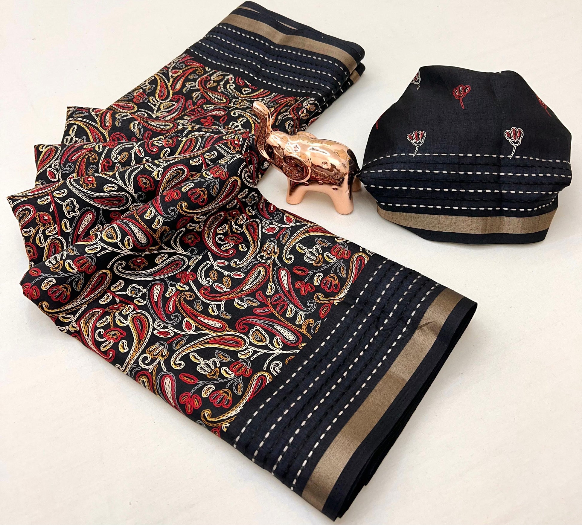Soft Cotton Crape Printed Saree with Elegant Katha Thread Work border – 6.3 Meters