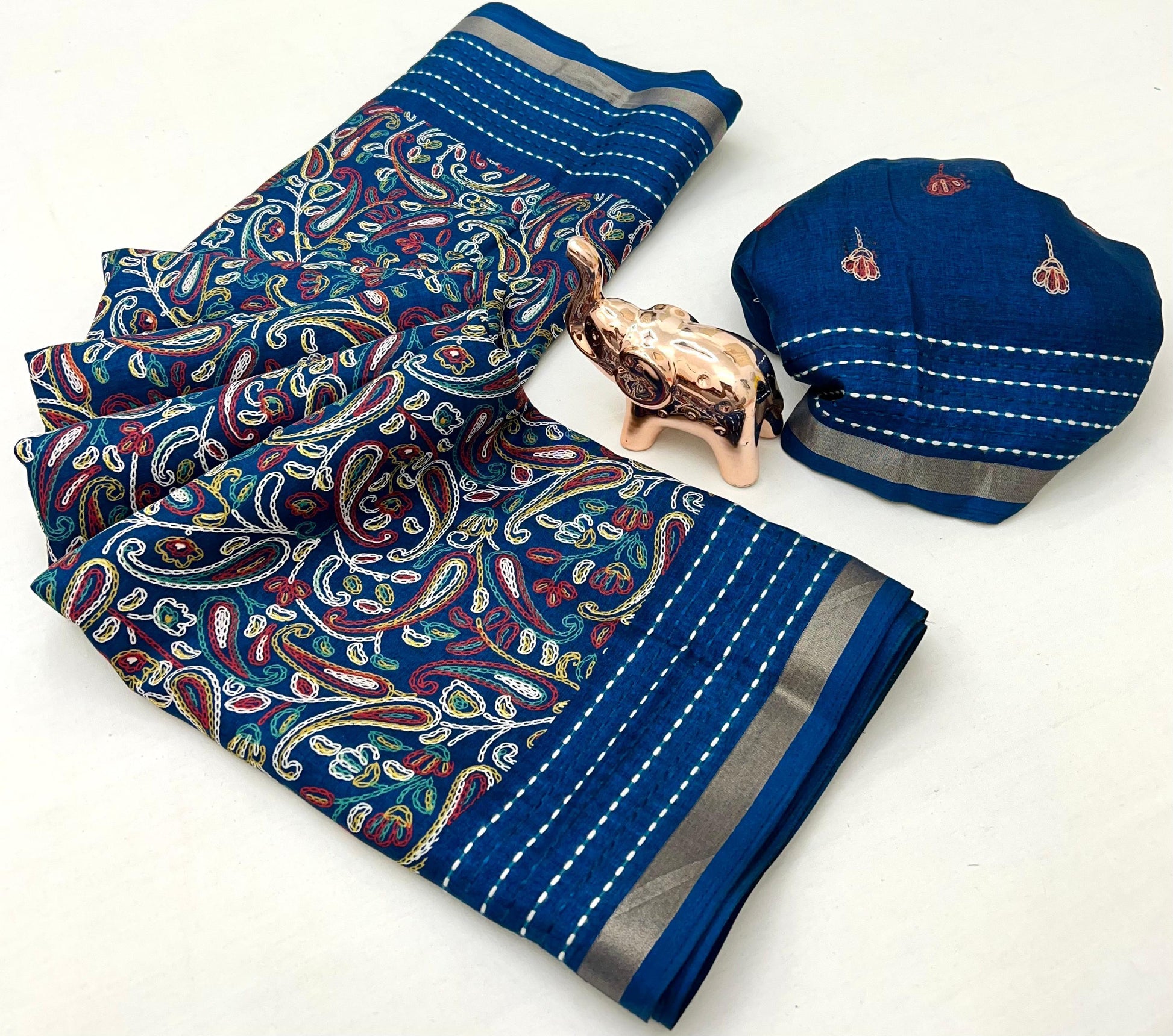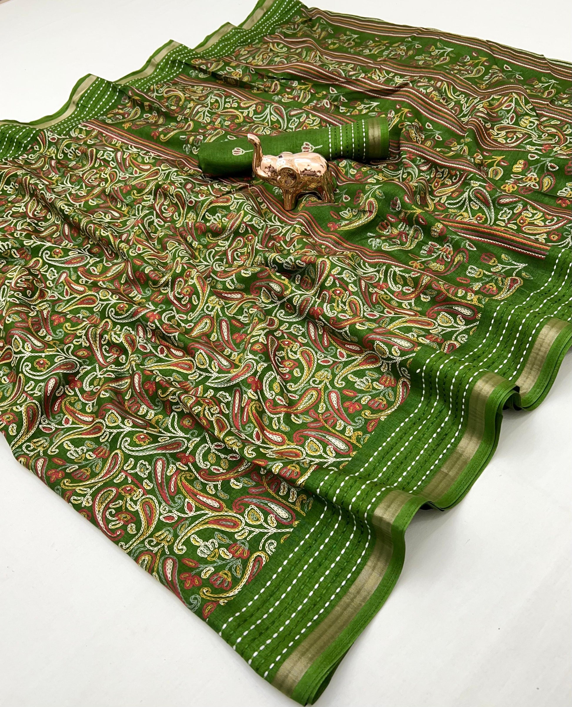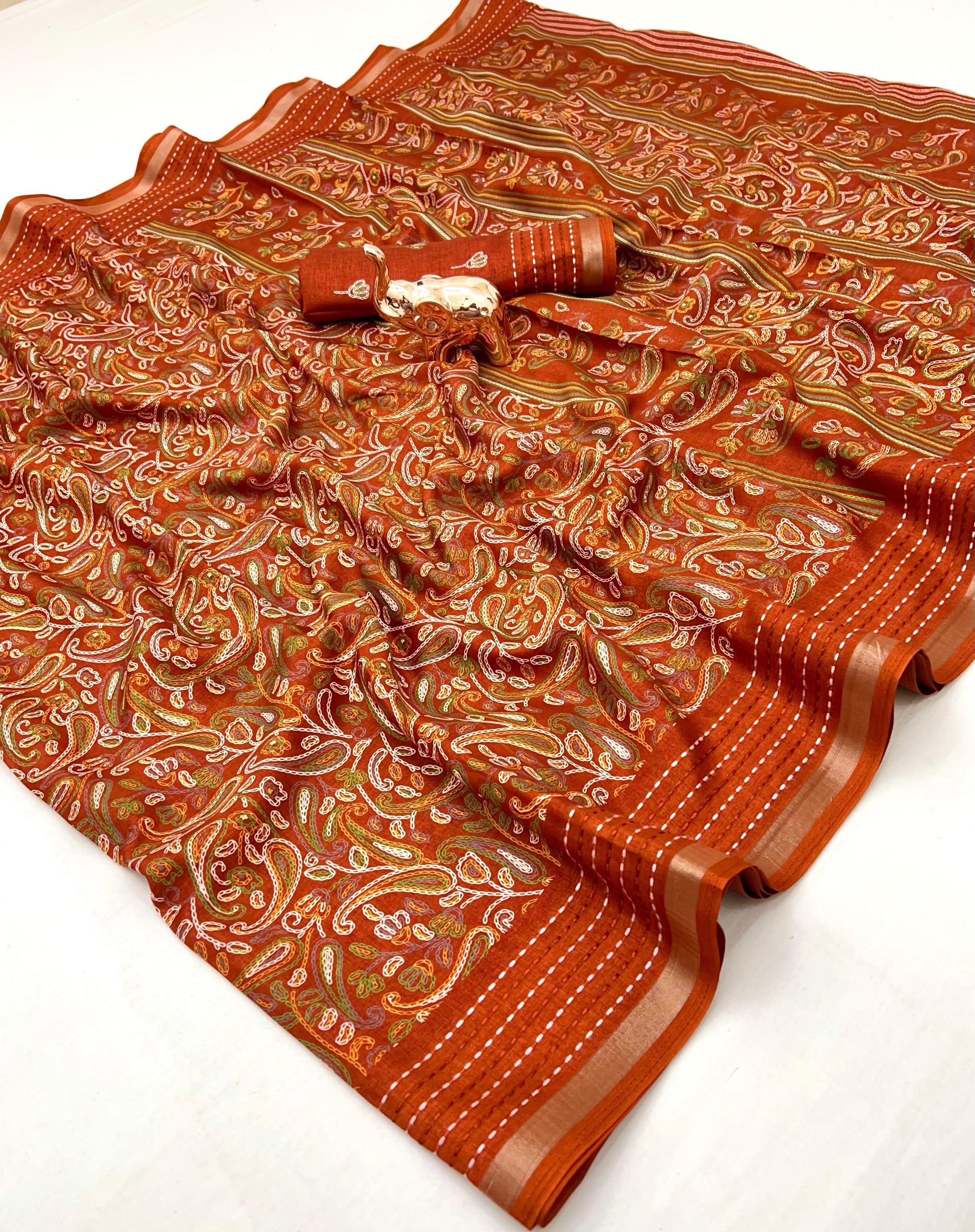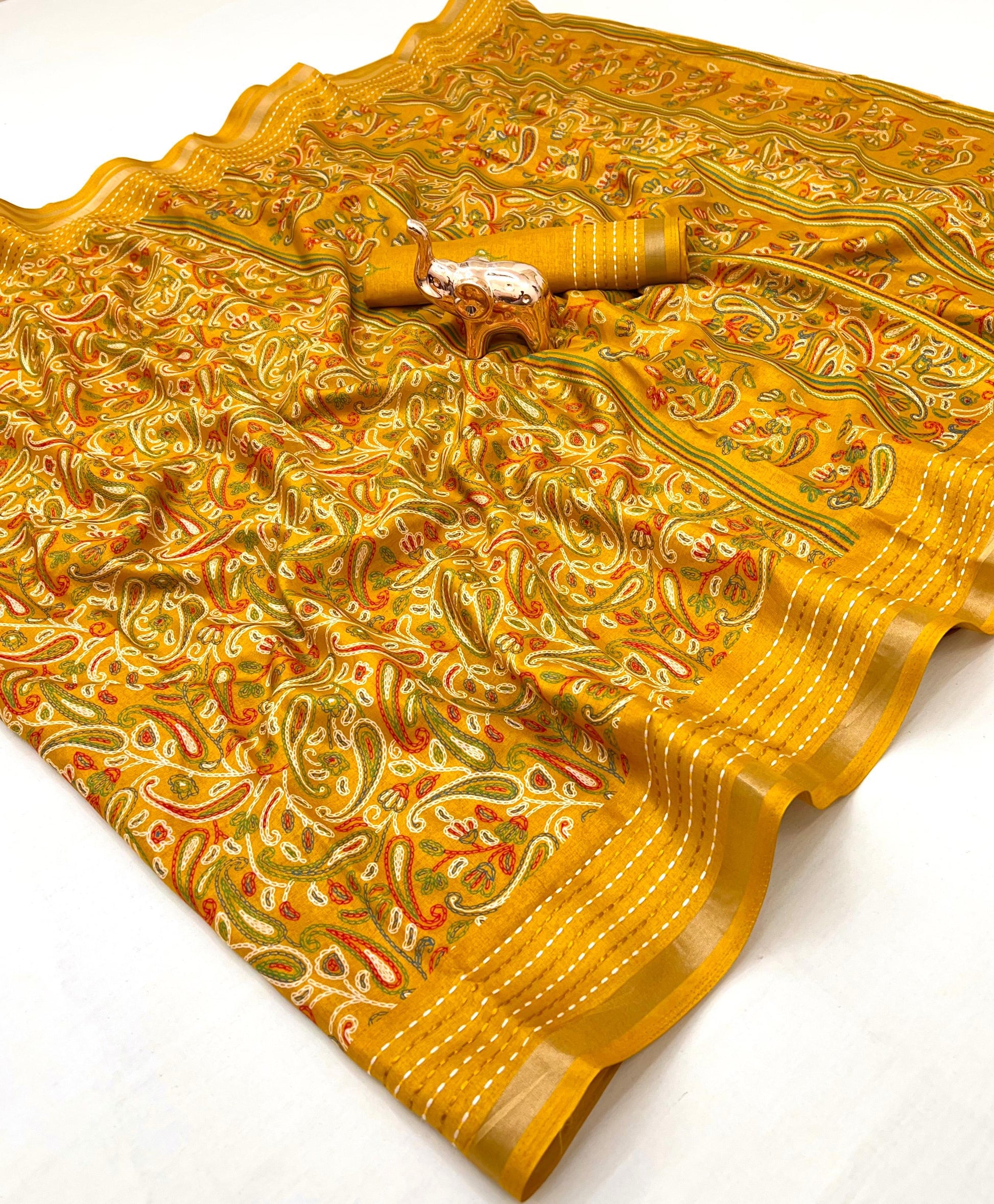 Soft Cotton Crape Printed Saree with Elegant Katha Thread Work border – 6.3 Meters
